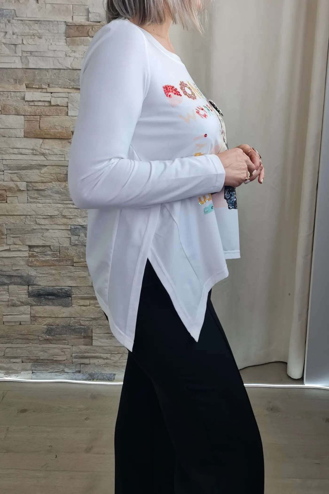 A "Estilo Descontraído" é a camisola ideal para quem procura na moda uma forma de se expressar com autenticidade, sentindo-se confiante para irradiar a sua luz e alegria por onde for. O seu corte com laterais mais curtas e com pequenas rachas adiciona um detalhe trendy e moderno.