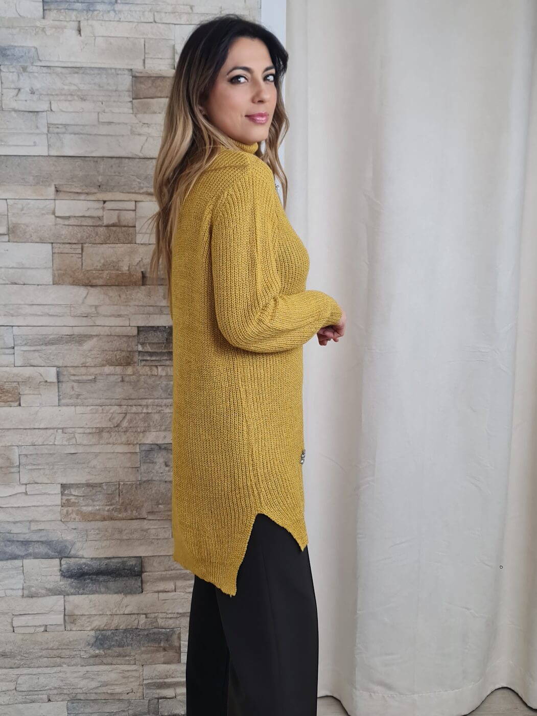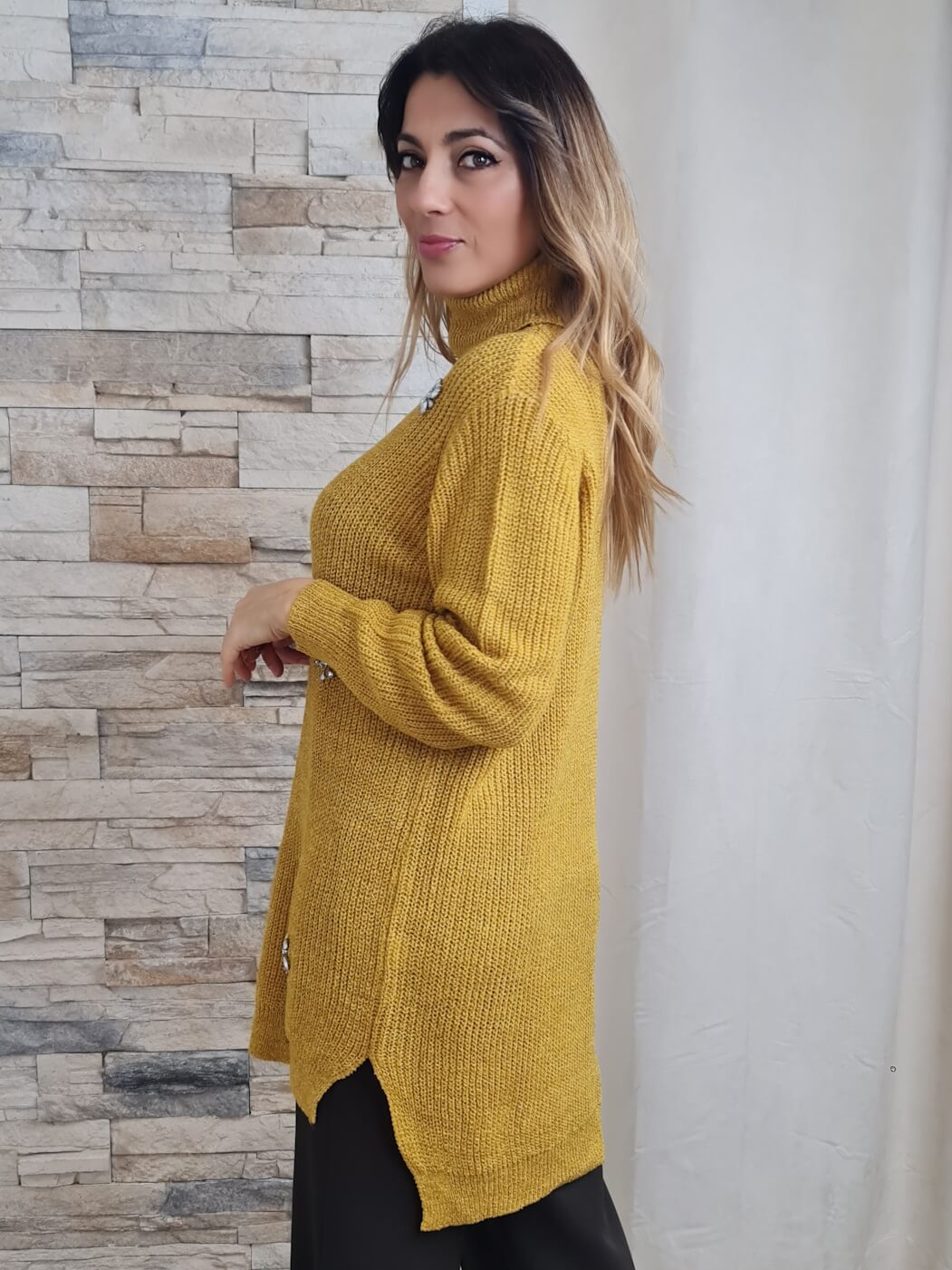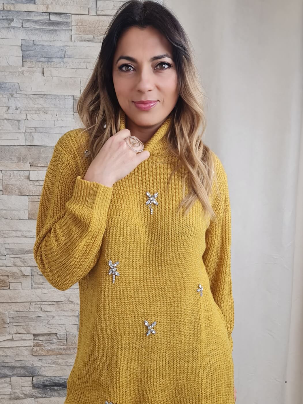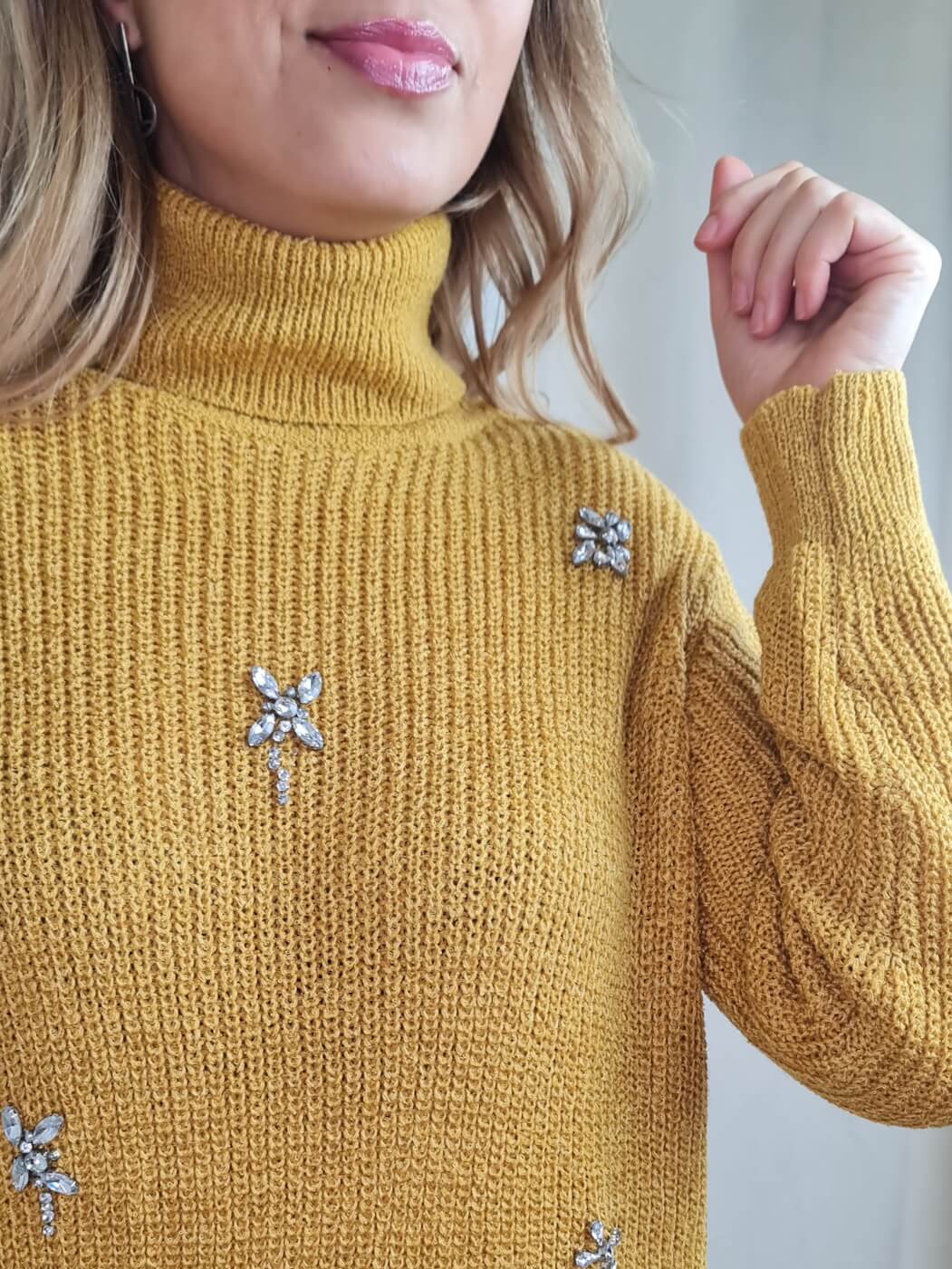 A camisola apresenta um design moderno e sofisticado, com um padrão em malha grossa e cor mostarda vibrante. A peça possui mangas compridas e gola alta, ideal para os dias mais frios. O detalhe que mais se destaca são as aplicações de pedrarias brilhantes na parte frontal da camisola, que adicionam um toque de glamour e sofisticação ao visual.