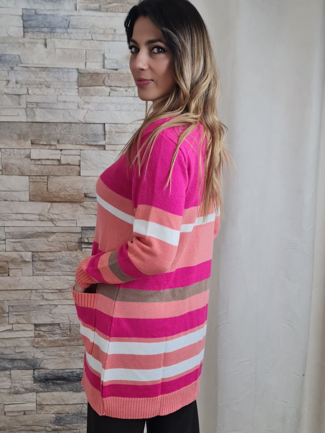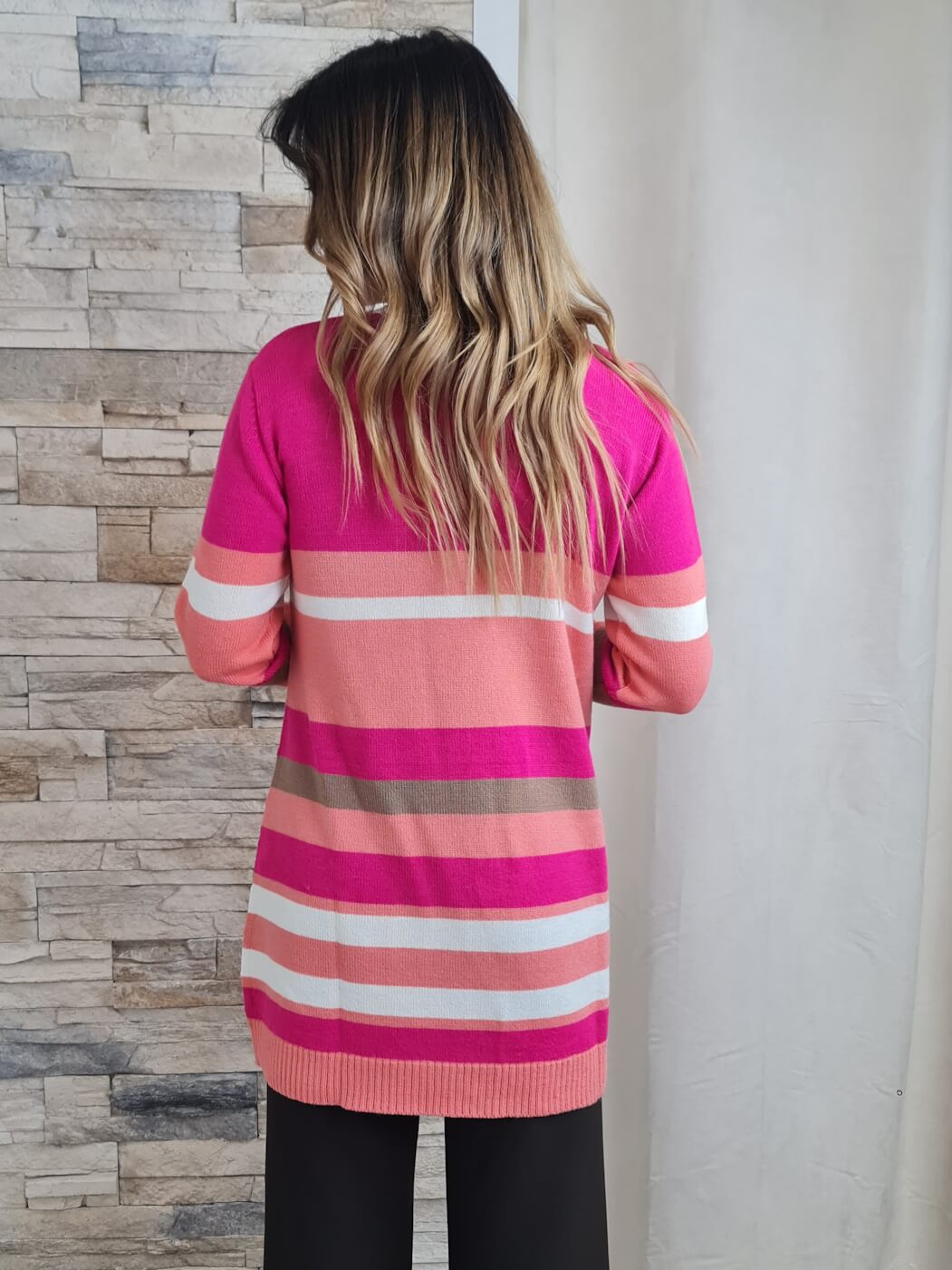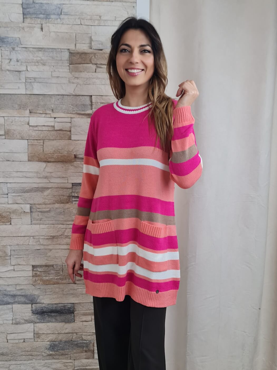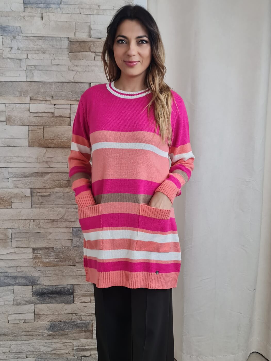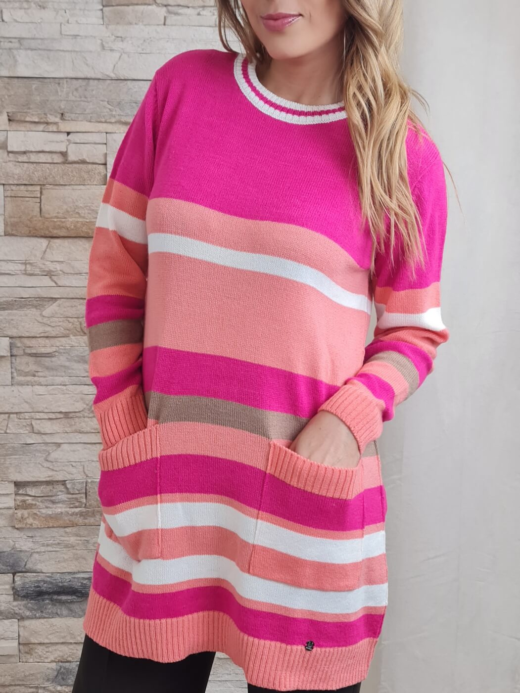 A camisola apresenta um design moderno e colorido, com um padrão às riscas horizontais em tons de rosa, coral e branco. A peça possui mangas compridas e um corte oversized, ideal para um look descontraído e confortável. O detalhe que mais se destaca são os bolsos frontais, que adicionam um toque prático e estiloso ao visual.
