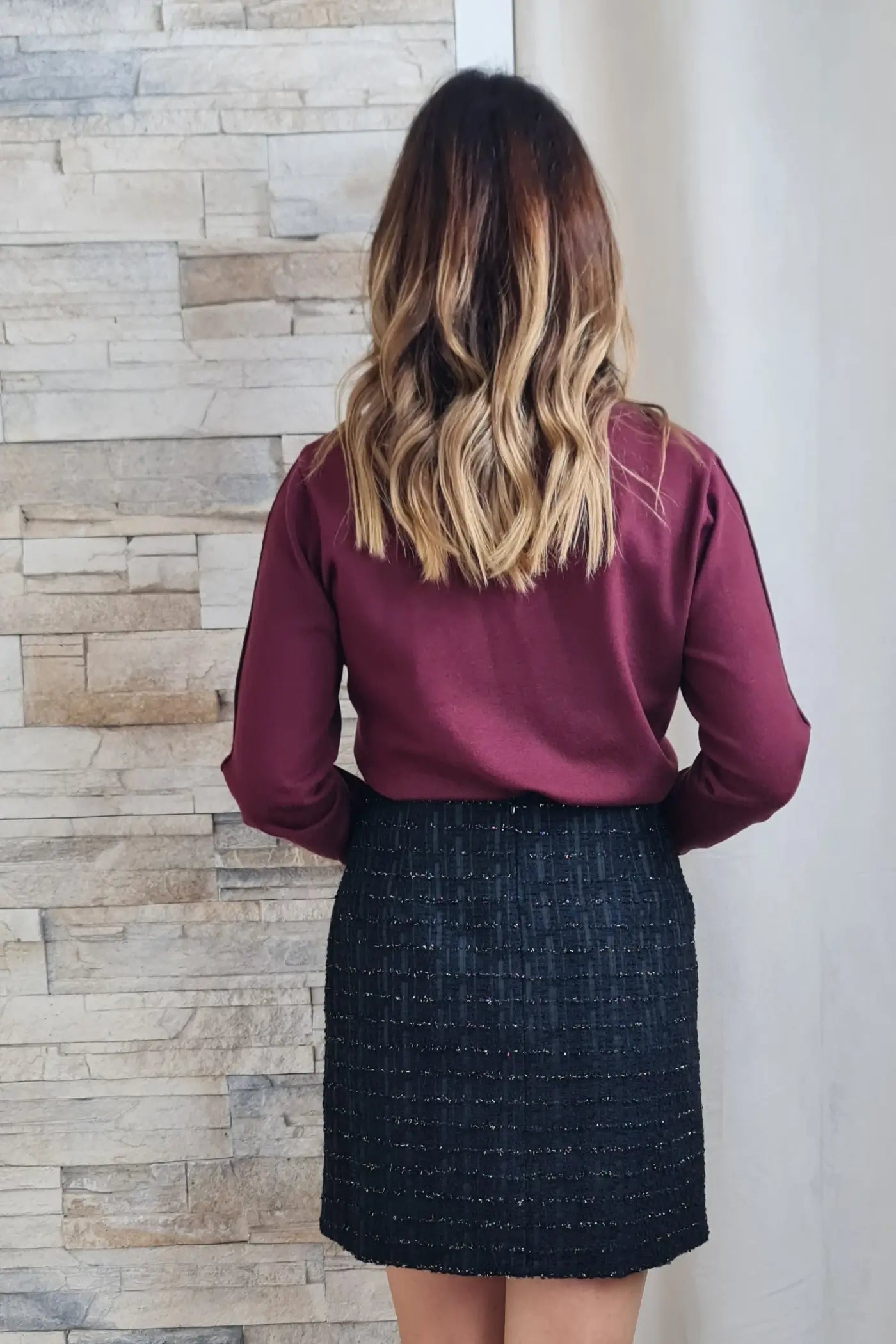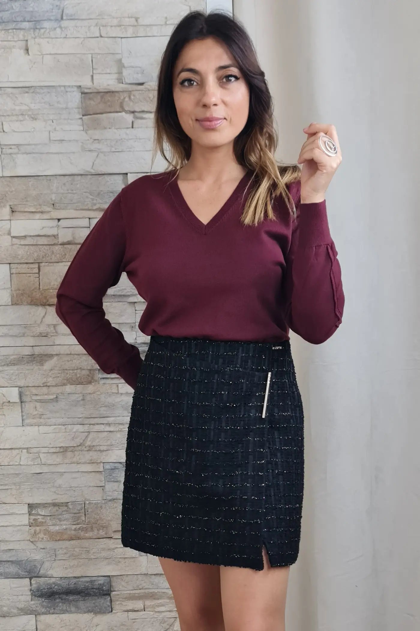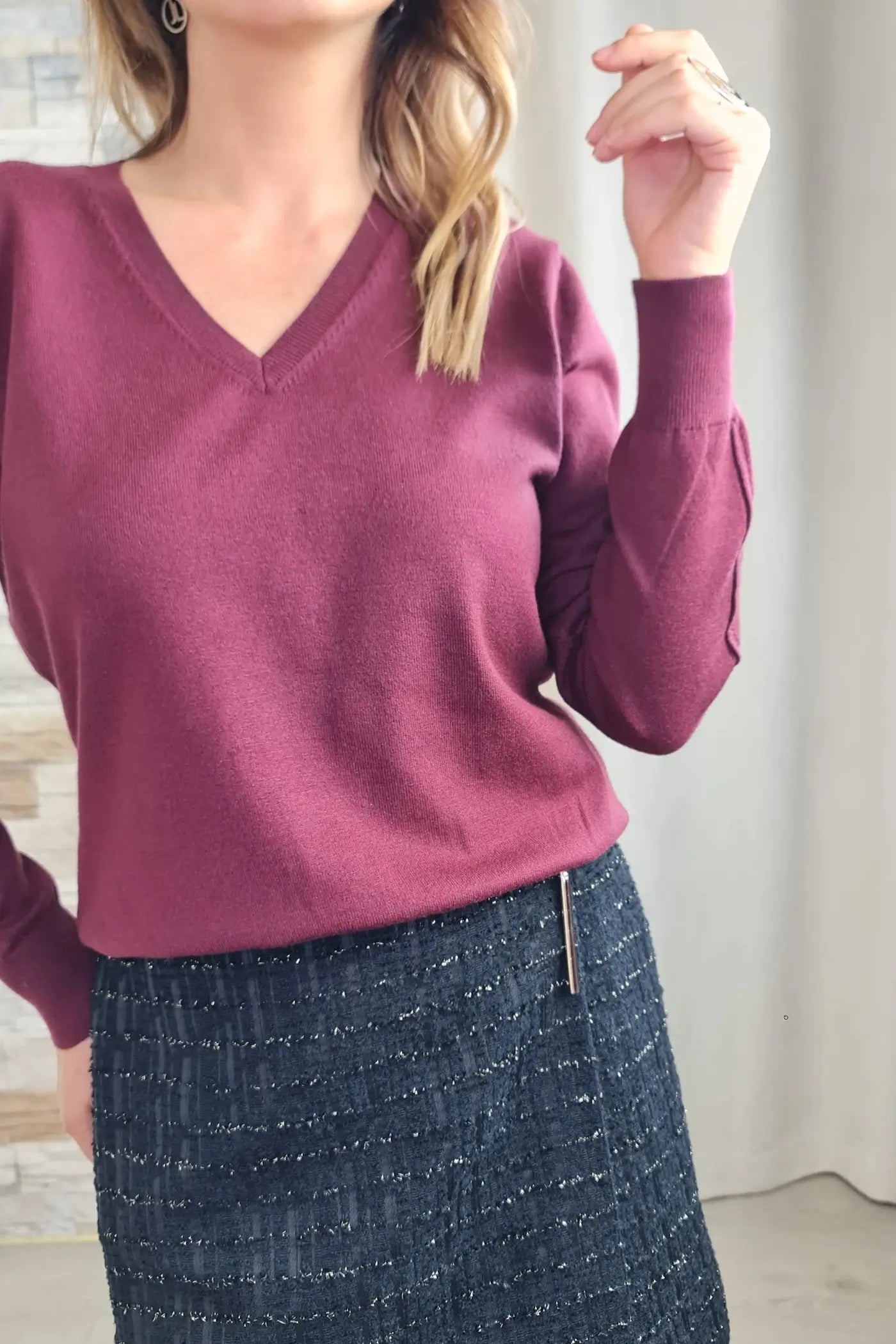 Ao vestir esta camisola, a sua cor bordeaux vibrante transmite uma sensação imediata de energia e otimismo. O seu corte ajustado, com o decote em V e as mangas compridas, confere-lhe um visual feminino e confiante, sem comprometer o conforto.