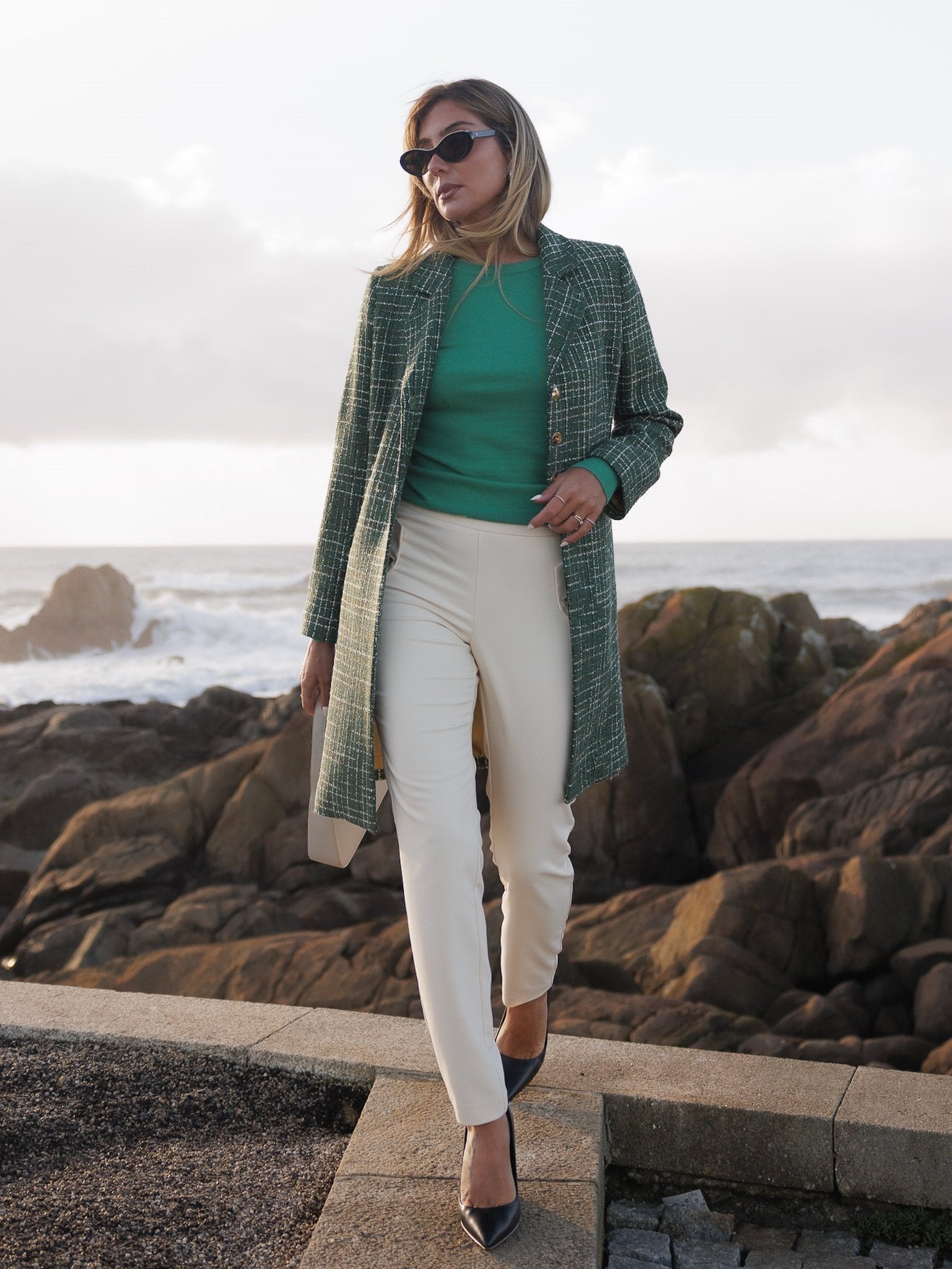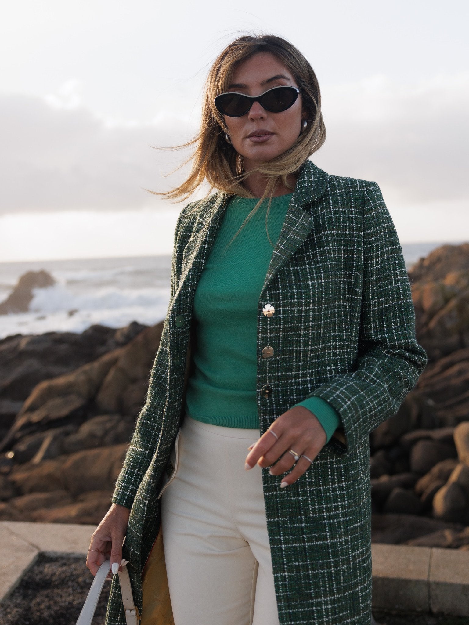 O design é clássico e versátil. Com decote redondo e mangas compridas, destaca-se pela cor verde esmeralda intensa e vibrante, que adiciona um toque de frescura e vida a qualquer visual.