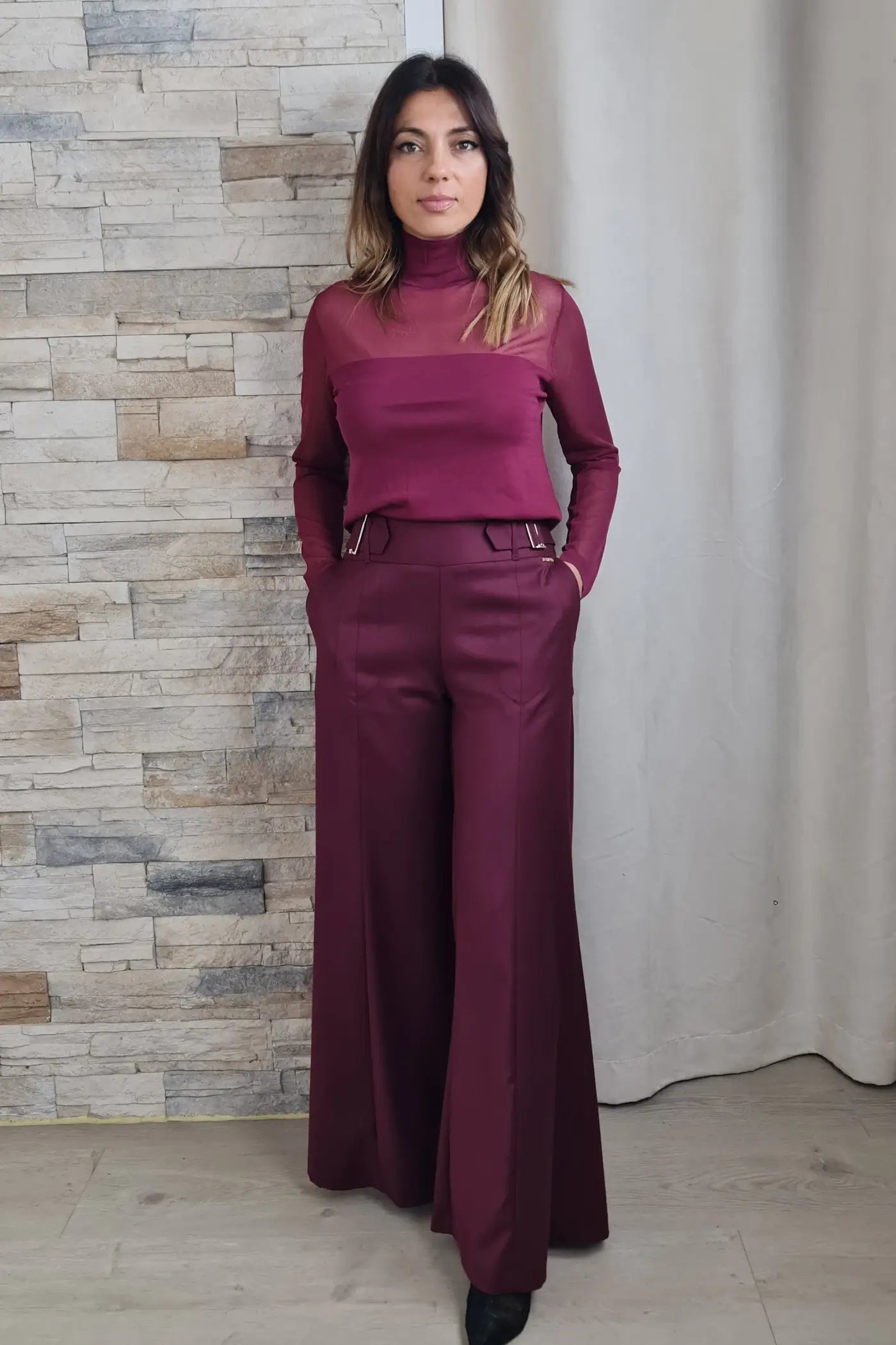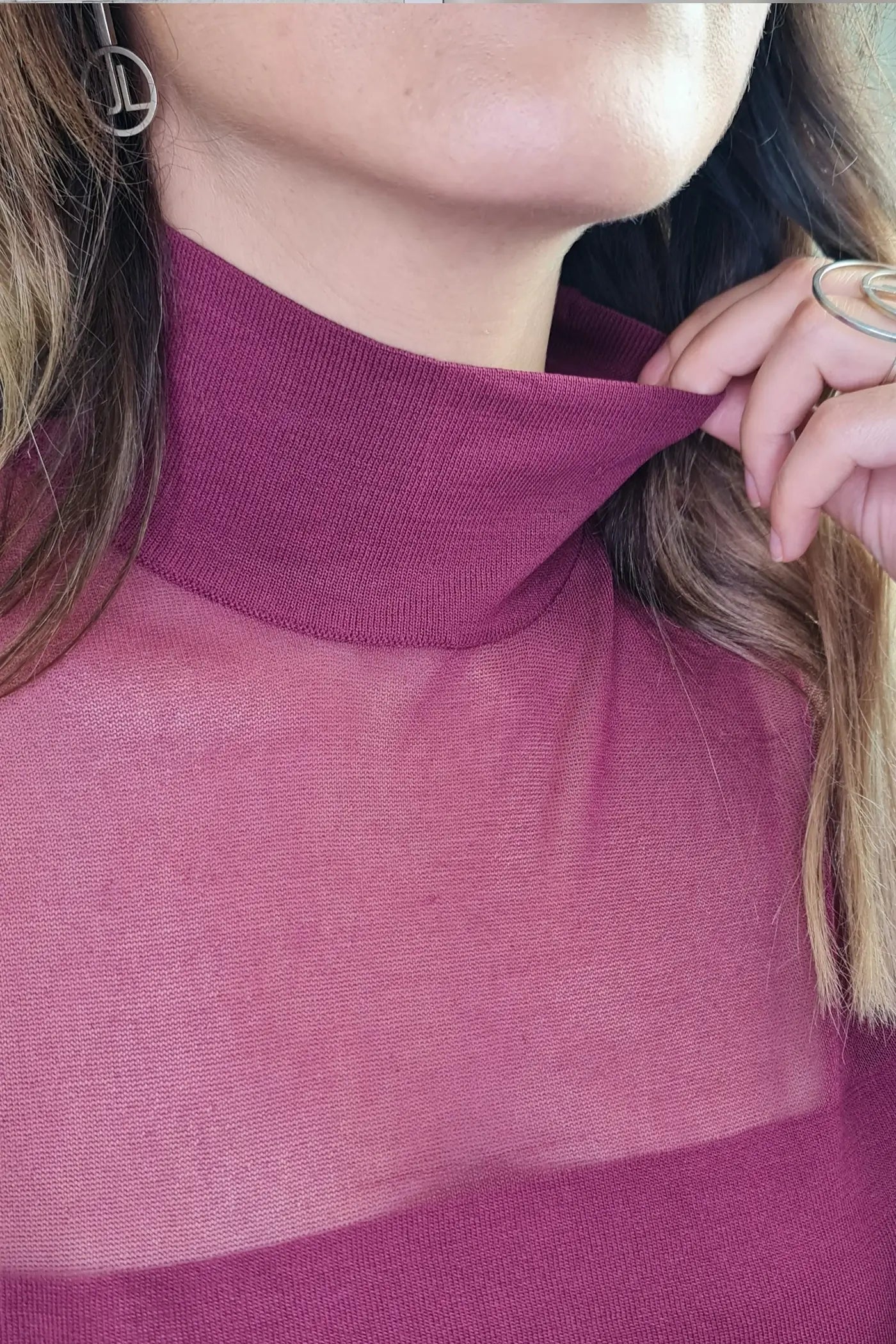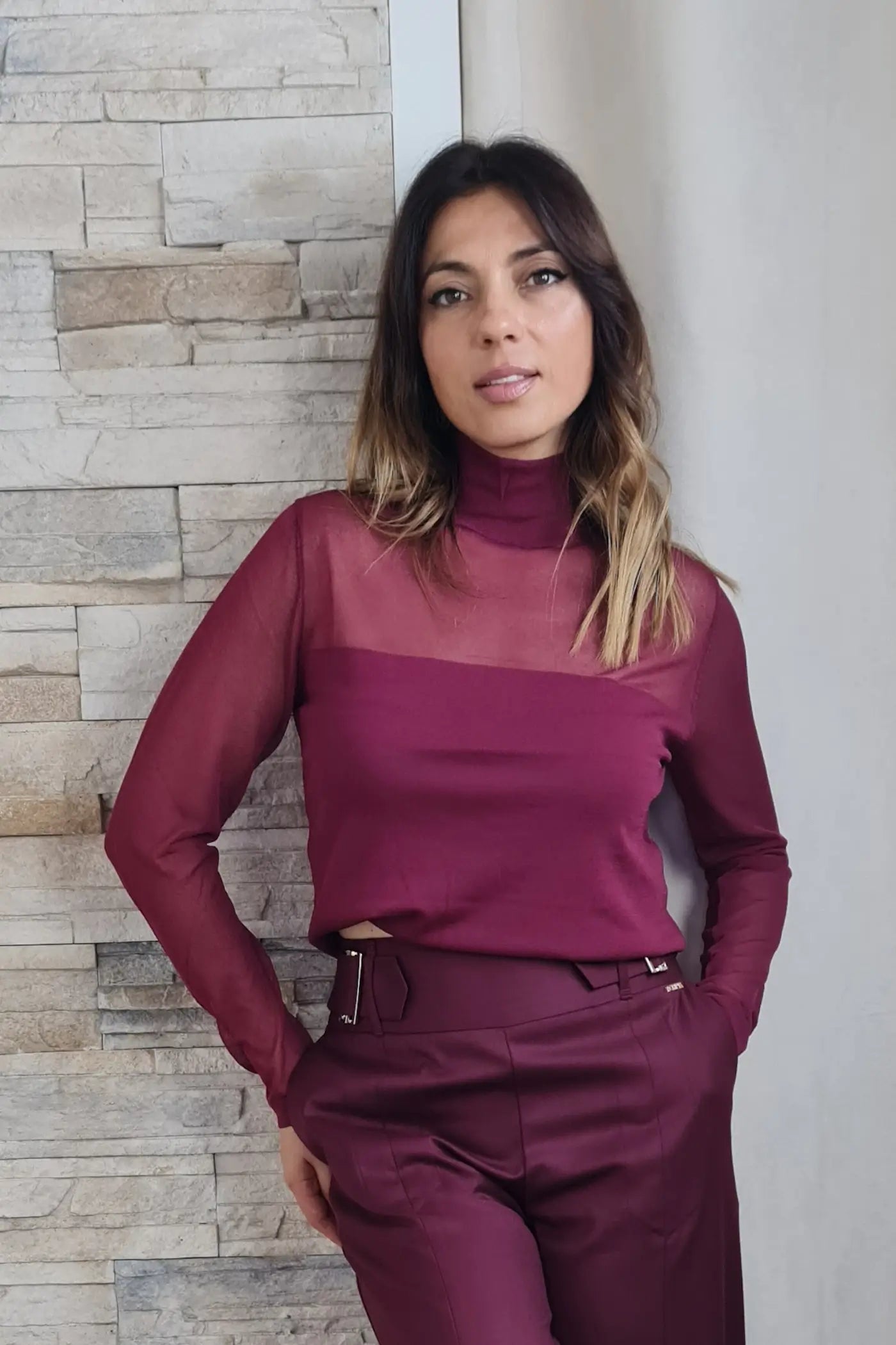 Ao vestir esta camisola, o seu tom bordeaux, que evoca a força da natureza e a serenidade, proporciona uma sensação de calma e otimismo. O seu corte justo e o seu tecido de malha, com os detalhes de transparência nas mangas, confere-lhe um visual ousado e elegante, sem comprometer o conforto. O seu design versátil e elegante permite que a use em diversas ocasiões, seja para um encontro de trabalho a um almoço com amigas.