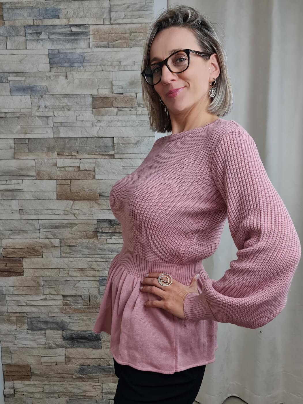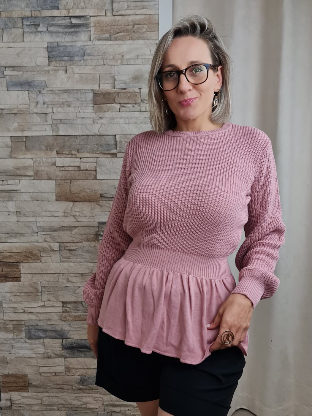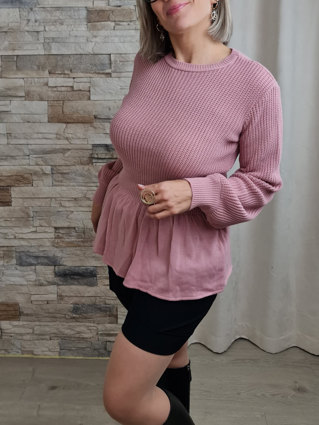 A camisola é de cor rosa claro e apresenta uma textura canelada vertical em toda a peça. Possui mangas compridas com um leve volume nos ombros e punhos ajustados. O decote é redondo e simples. A camisola tem um corte ajustado na parte superior e apresenta um peplum, adicionando um detalhe feminino e fluido.