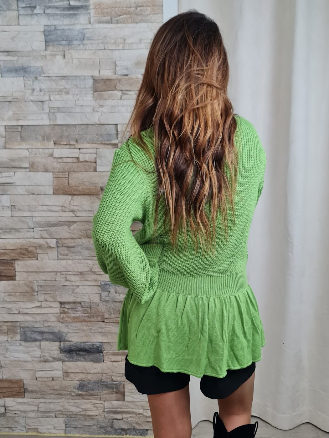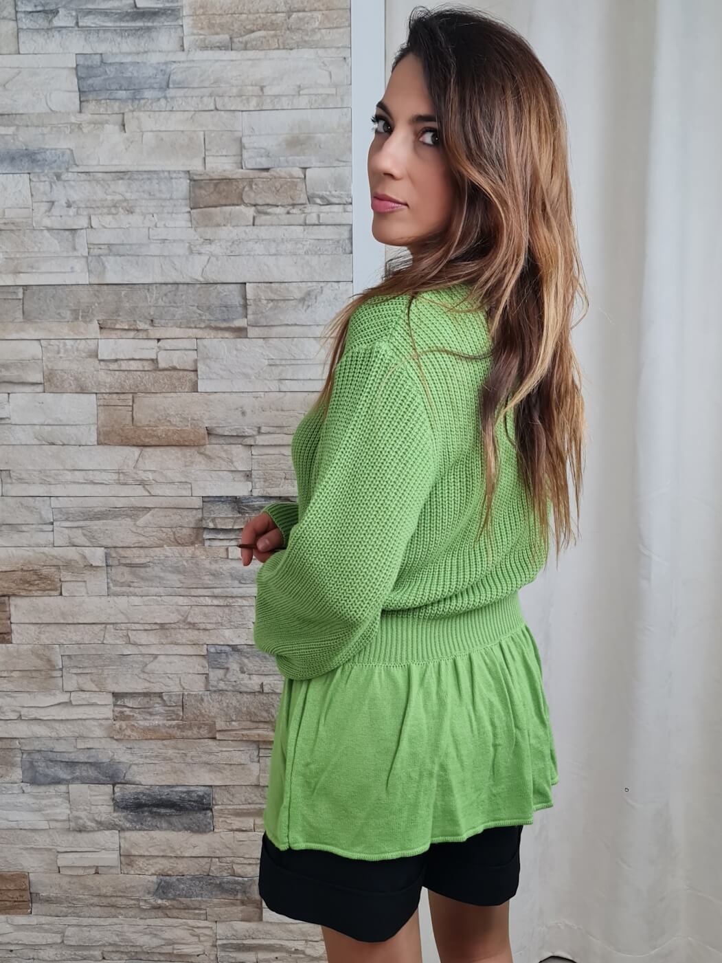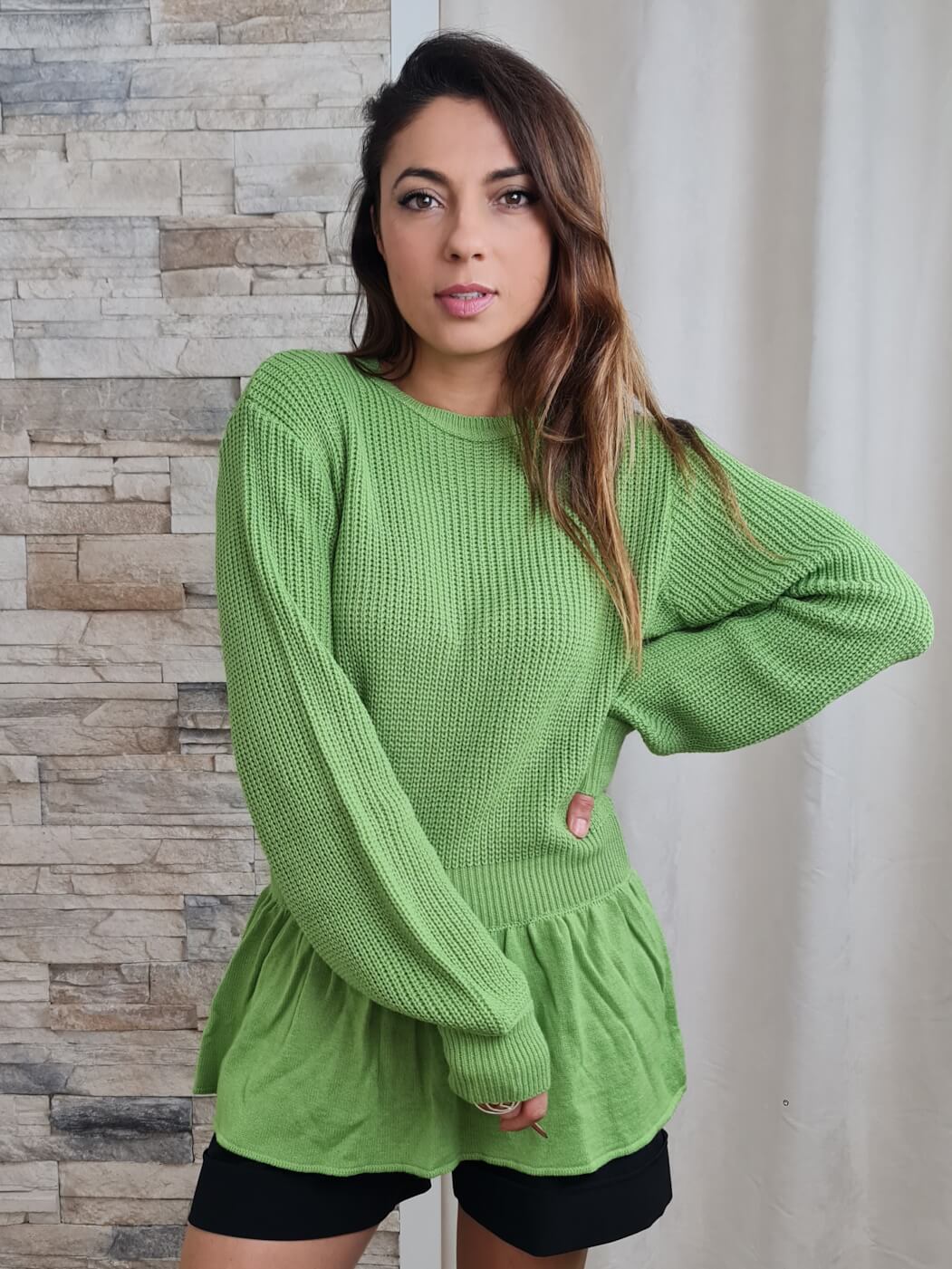 A camisola exibida é de cor verde pistácio e apresenta uma combinação de texturas. A parte superior é feita em malha canelada vertical, com mangas compridas e um decote redondo simples. A partir da cintura, a camisola alarga-se numa espécie de peplum em tecido liso e fluido, criando um contraste de textura e um detalhe feminino. O comprimento da camisola é mais comprido, cobrindo a zona das ancas.