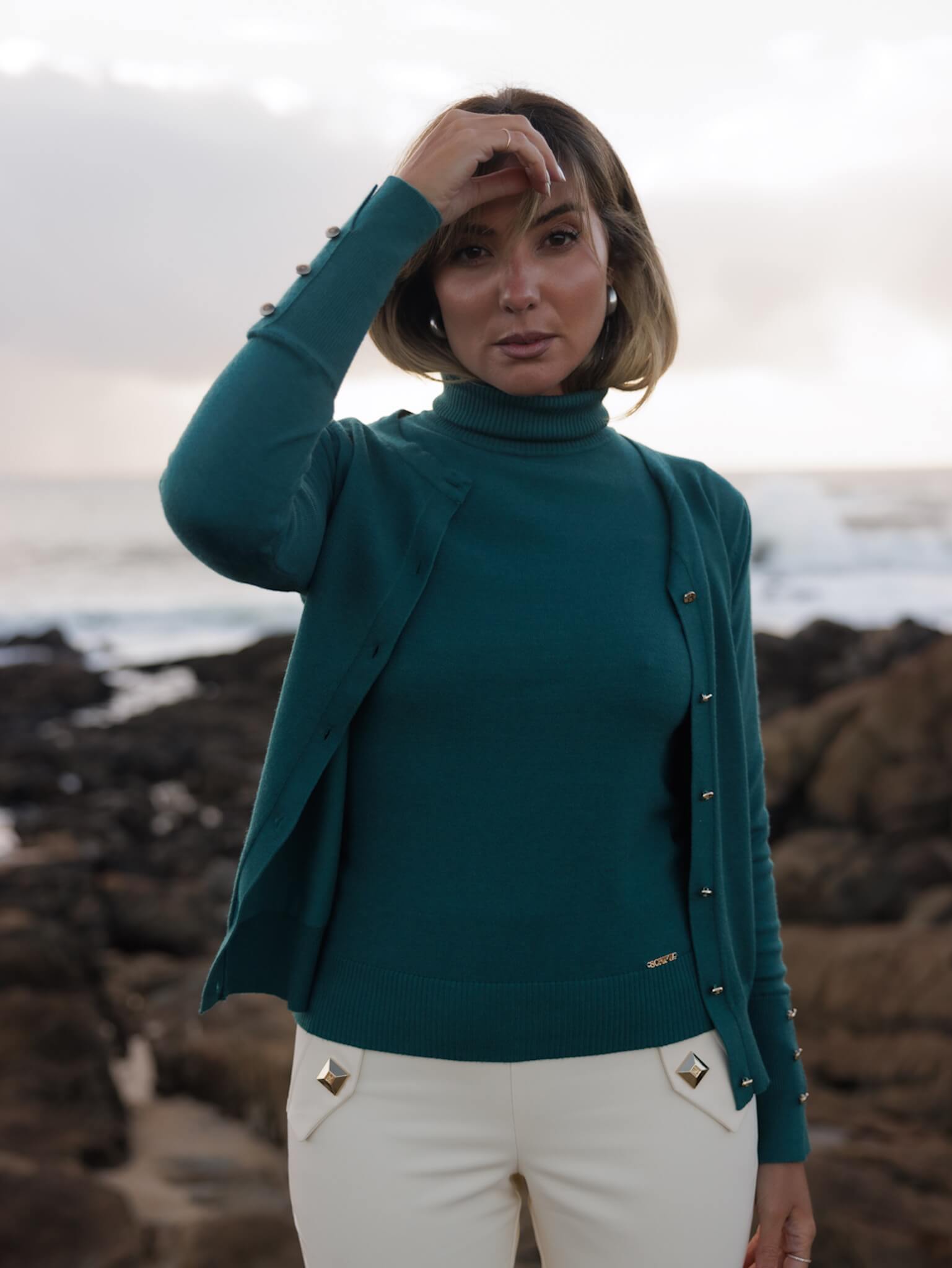 Ao vestir a "Sofisticação Essencial", sentirá uma sensação de aconchego e um toque de modernidade. O tecido de malha fina e o caimento ajustado ao corpo proporcionam bem-estar e a convidam a expressar a sua personalidade sofisticada.