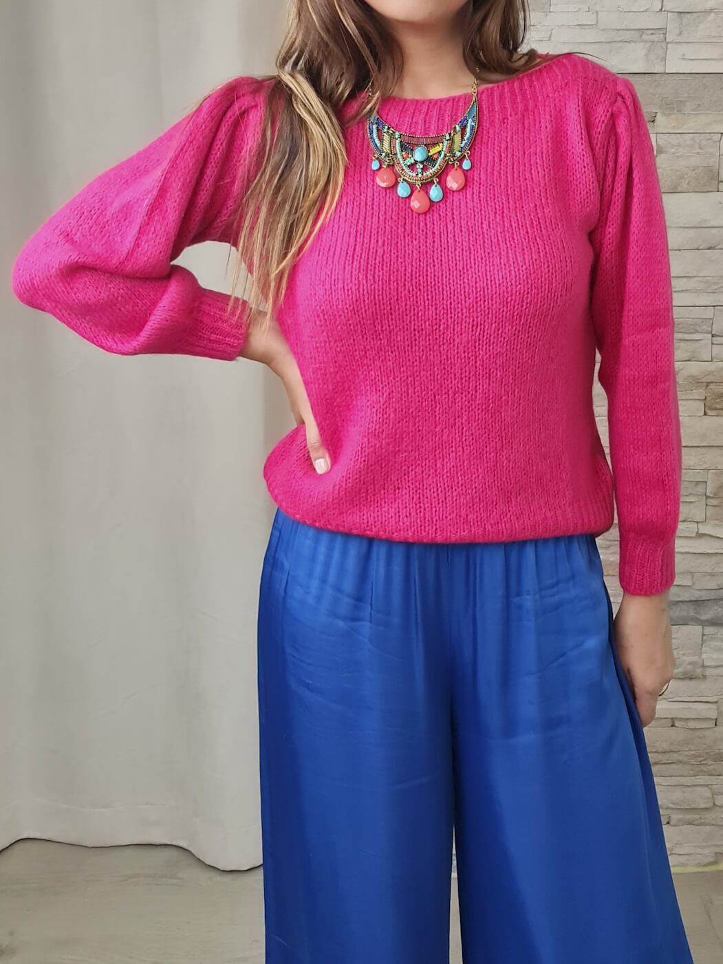 O design é uma fusão de conforto e cor. Com decote barco e mangas compridas volumosas, destaca-se pela cor rosa fúcsia intensa e brilhante, que irradia alegria e modernidade.