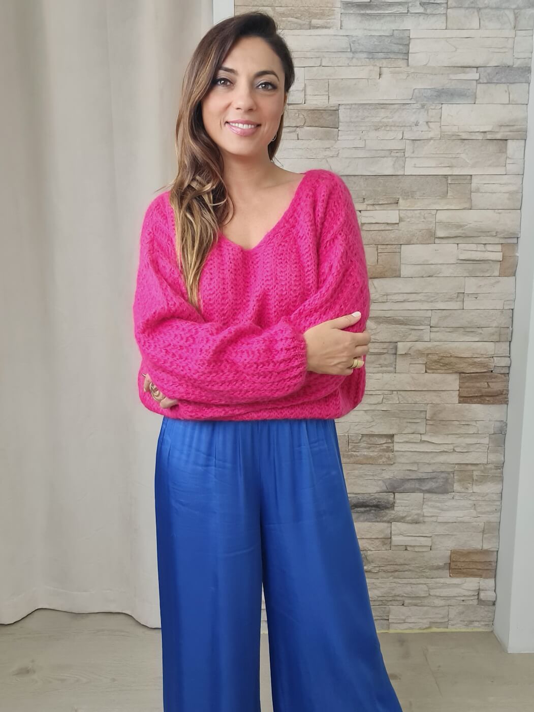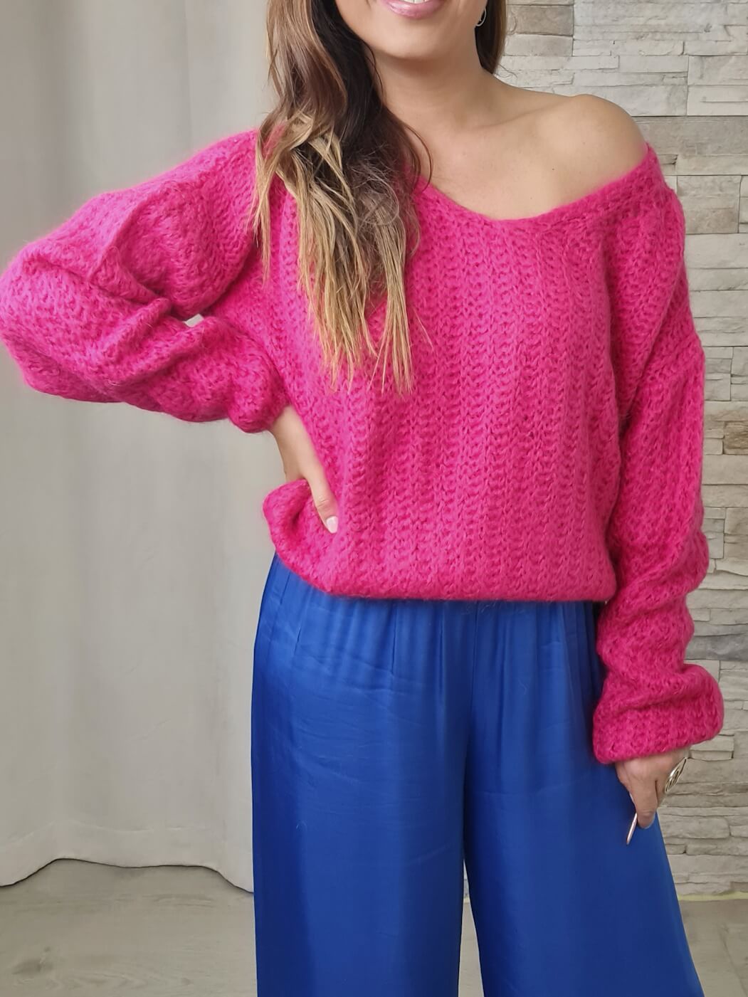 O design é uma fusão de conforto e cor. Com decote em V e mangas compridas volumosas, destaca-se pela cor fúcsia intensa e brilhante, que irradia alegria e modernidade.