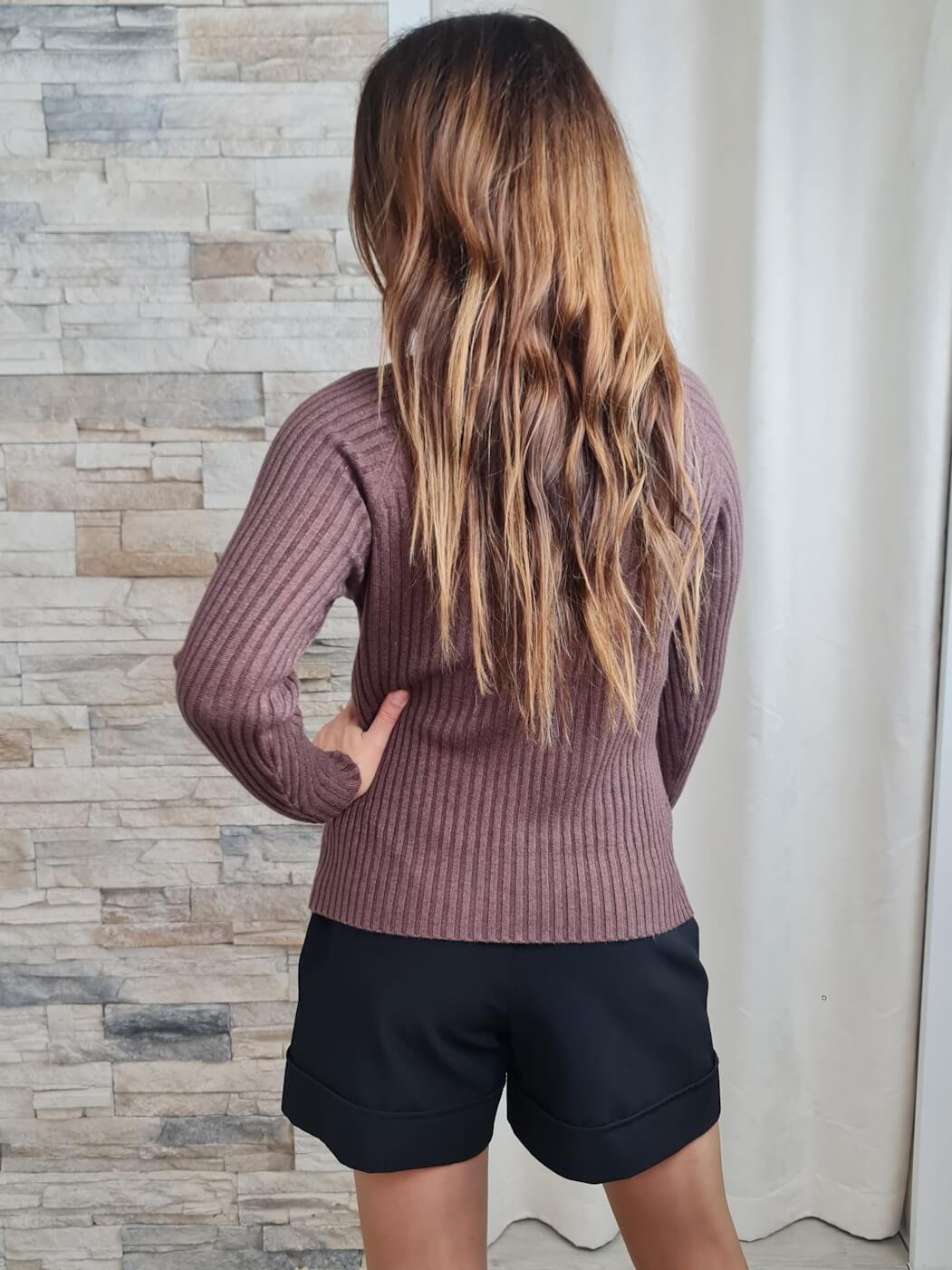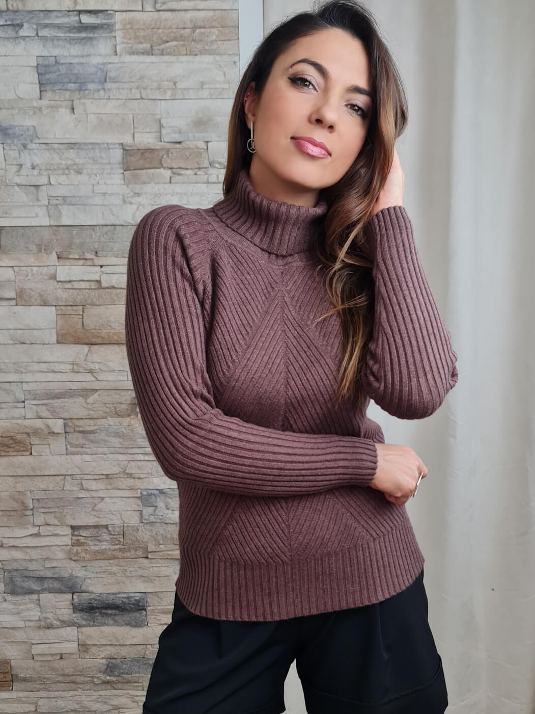 O design é uma fusão de conforto e estilo. Com gola alta e mangas compridas, destaca-se pela cor castanha e uma textura de malha canelada que forma padrões em "V" no corpo, adicionando um toque de interesse visual e elegância discreta.