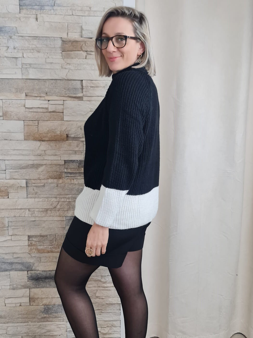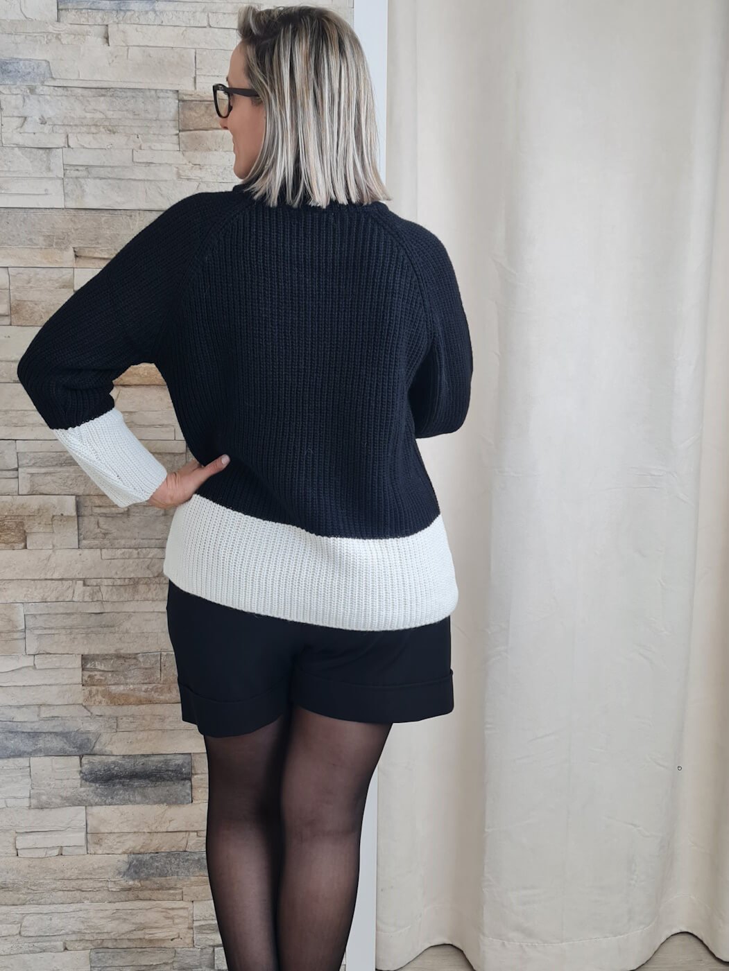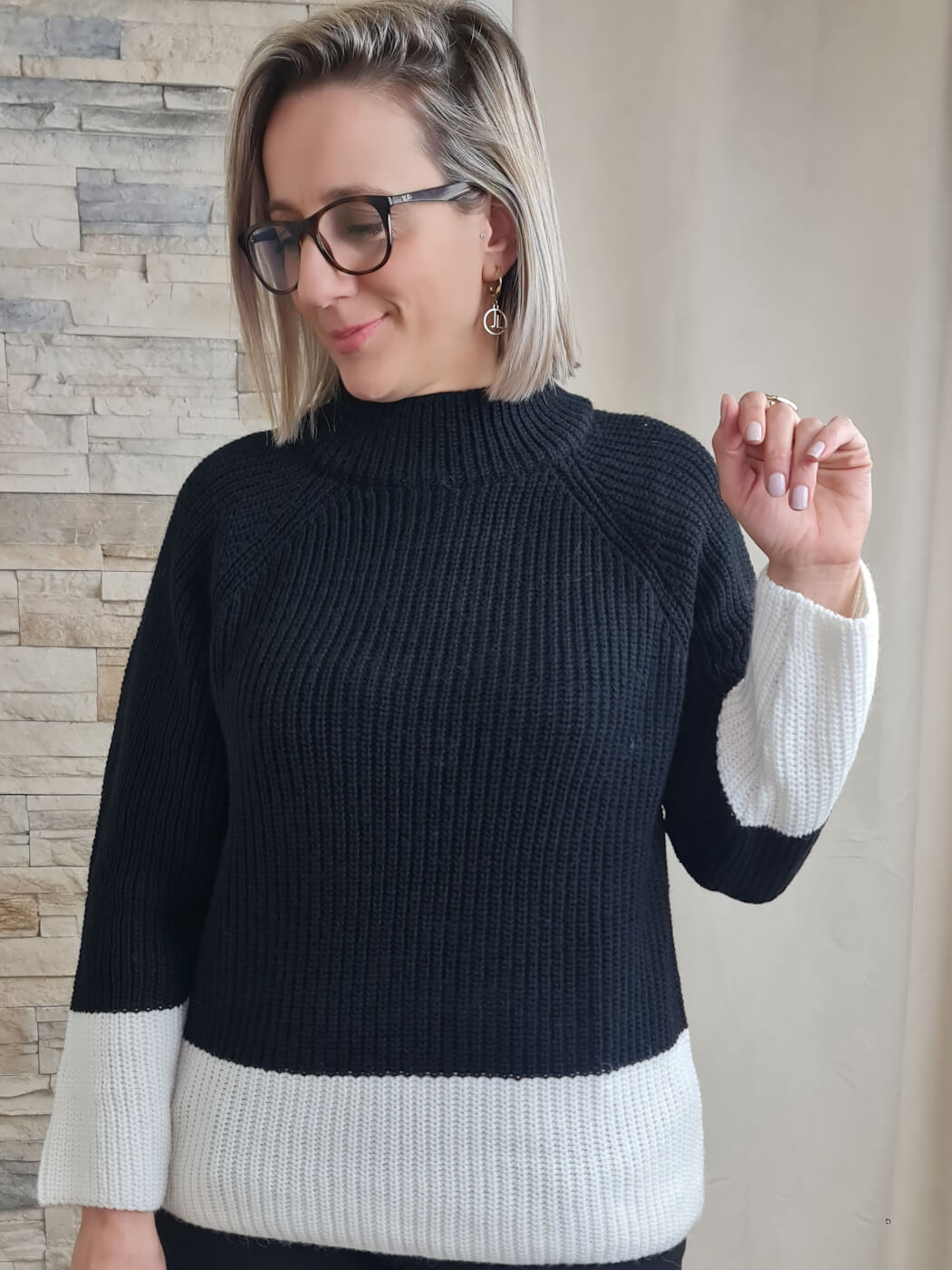 A camisola apresenta um design moderno e sofisticado, com um padrão bicolor em tons de preto e branco. A peça possui mangas compridas e gola alta, ideal para os dias mais frios. O detalhe que mais se destaca é a barra e os punhos em tom branco, que criam um contraste interessante com o tom preto do corpo da camisola.