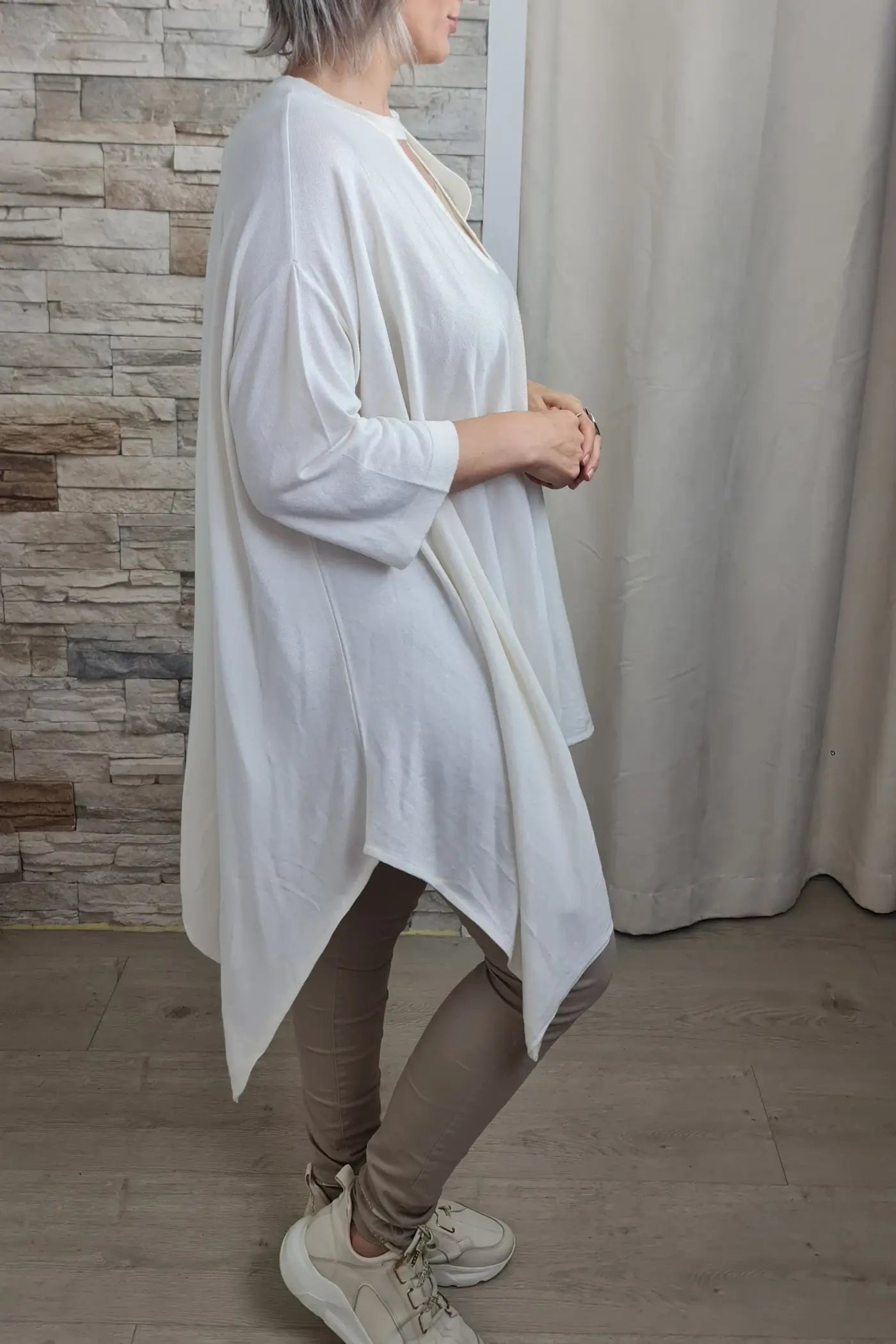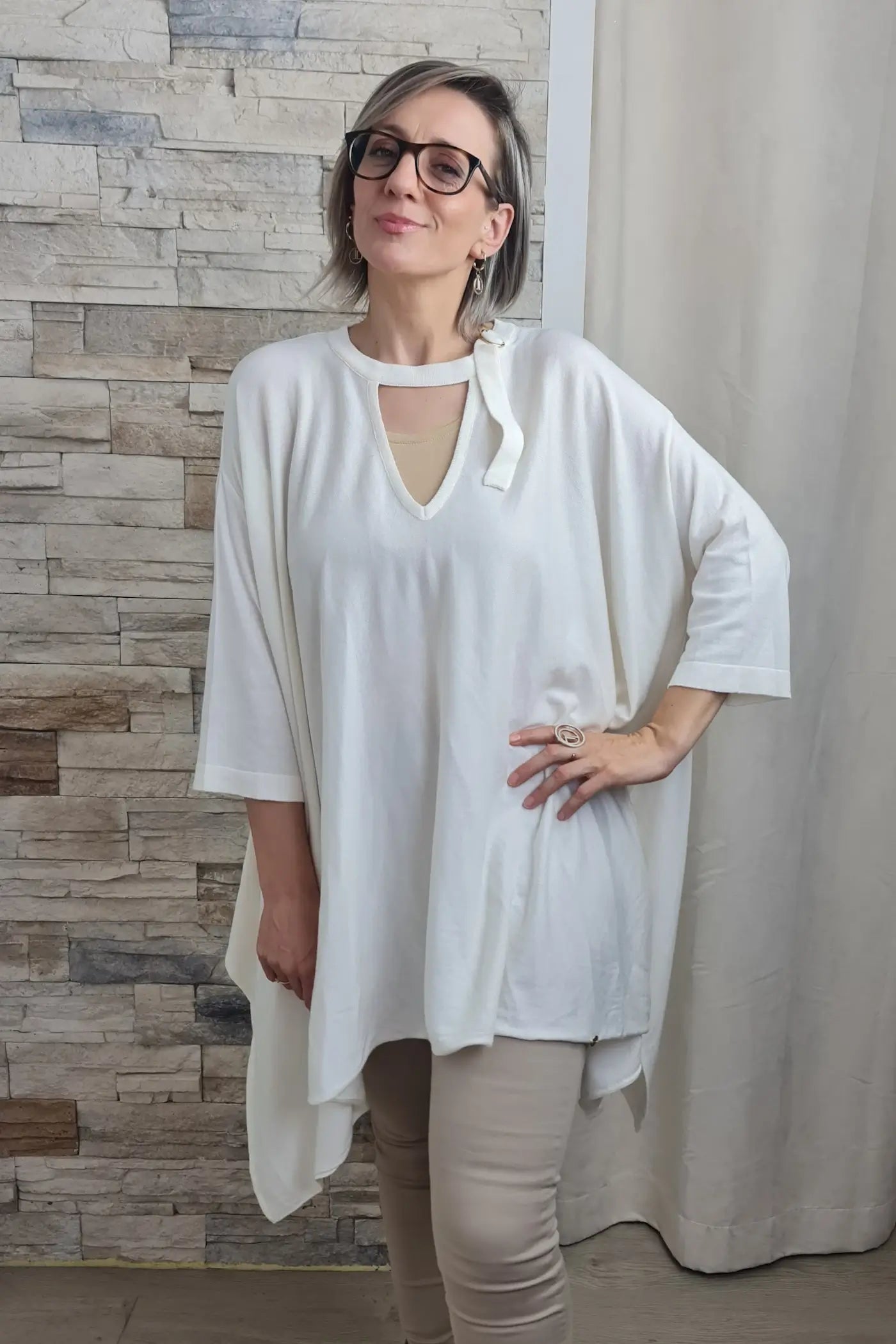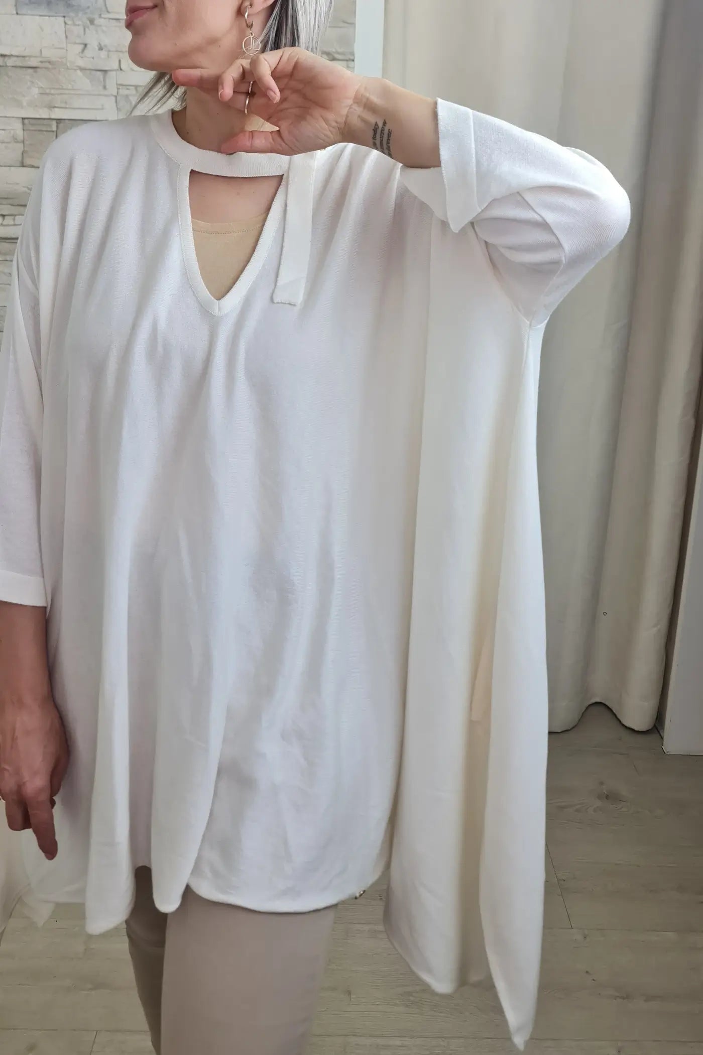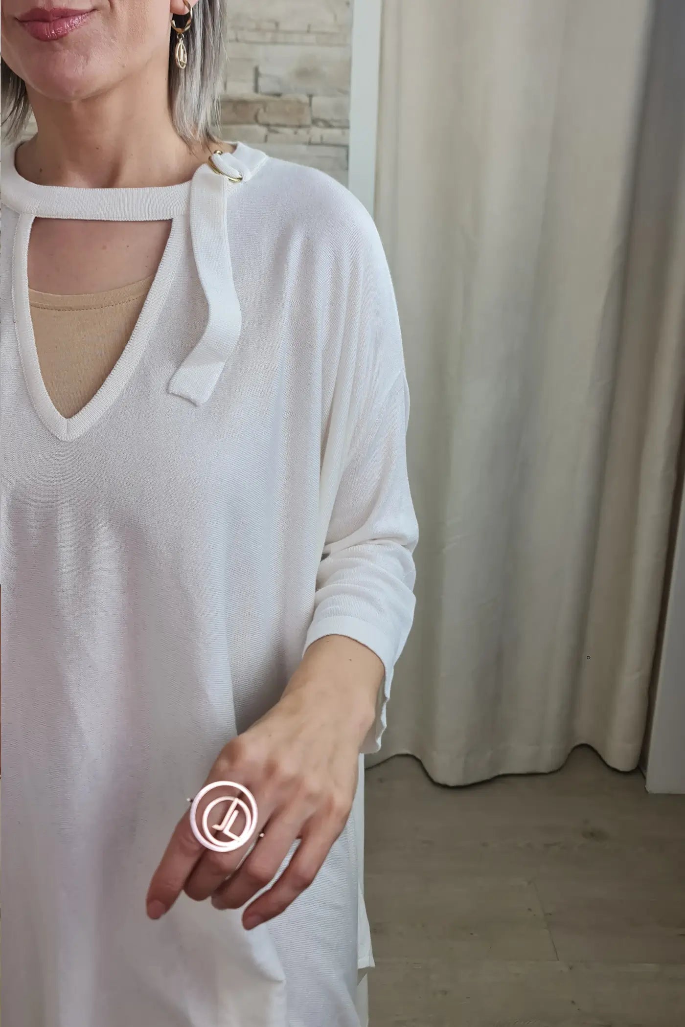 O corte oversized, com a silhueta em formato poncho e a bainha assimétrica (mais longa nos lados), confere um movimento descontraído e moderno, que não compromete a liberdade. O destaque da peça é o decote em V com corte cut-out e o detalhe da tira de tecido com fivela dourada que decora a gola, injetando um toque de elegância subtil e originalidade, convidando-a a expressar a sua personalidade de forma autêntica e descomplicada.