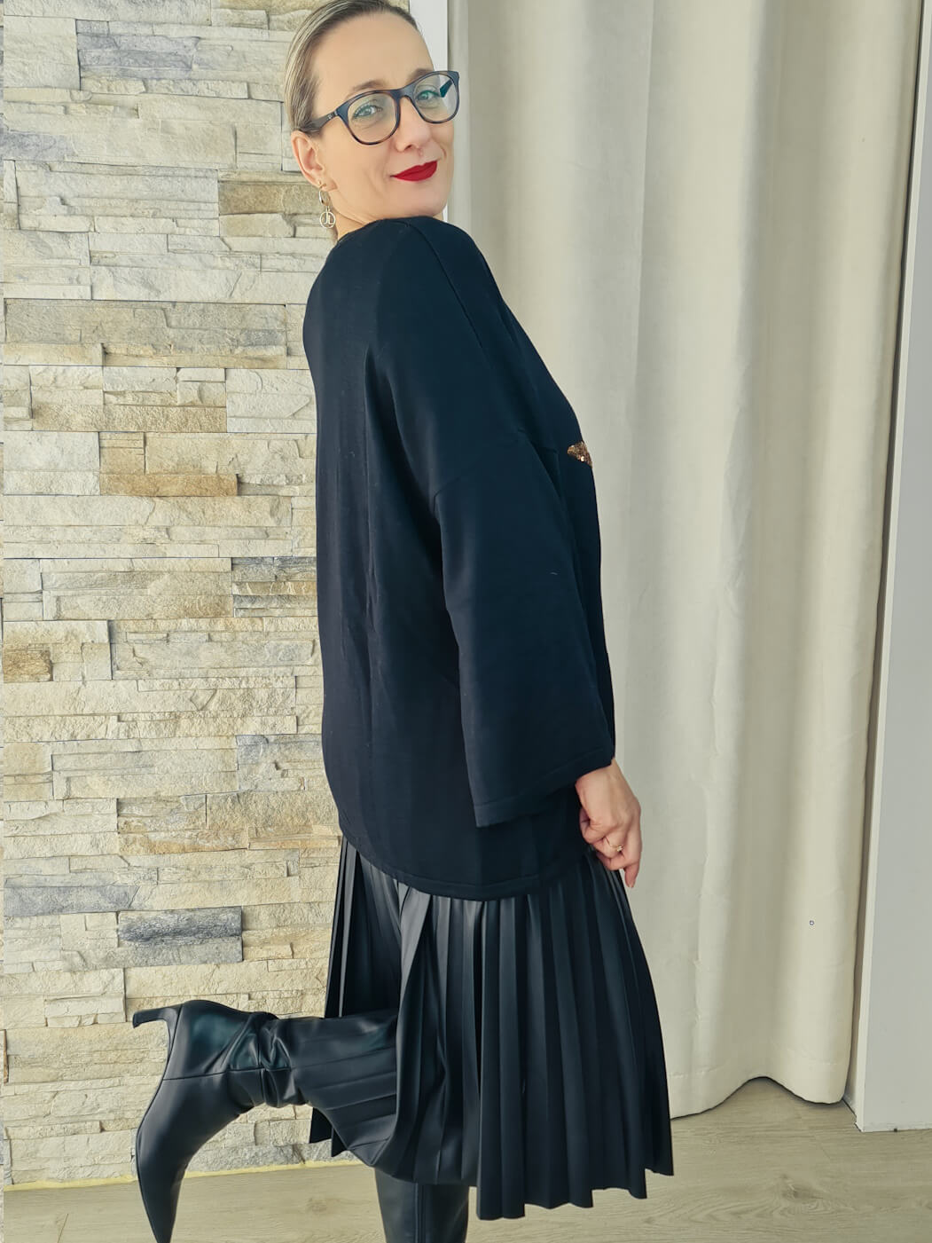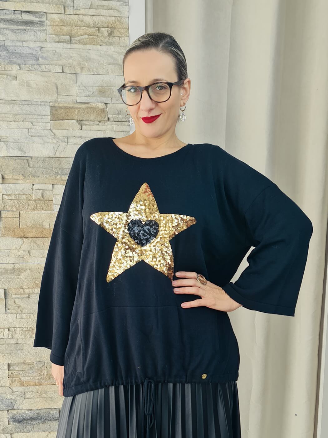 A camisola é preta e apresenta uma grande estrela dourada de lantejoulas no centro da parte frontal. Dentro da estrela dourada, há um pequeno coração preto também feito de lantejoulas. A camisola tem mangas compridas e largas, com um corte mais solto. A bainha da camisola possui um cordão preto ajustável. O decote é redondo.