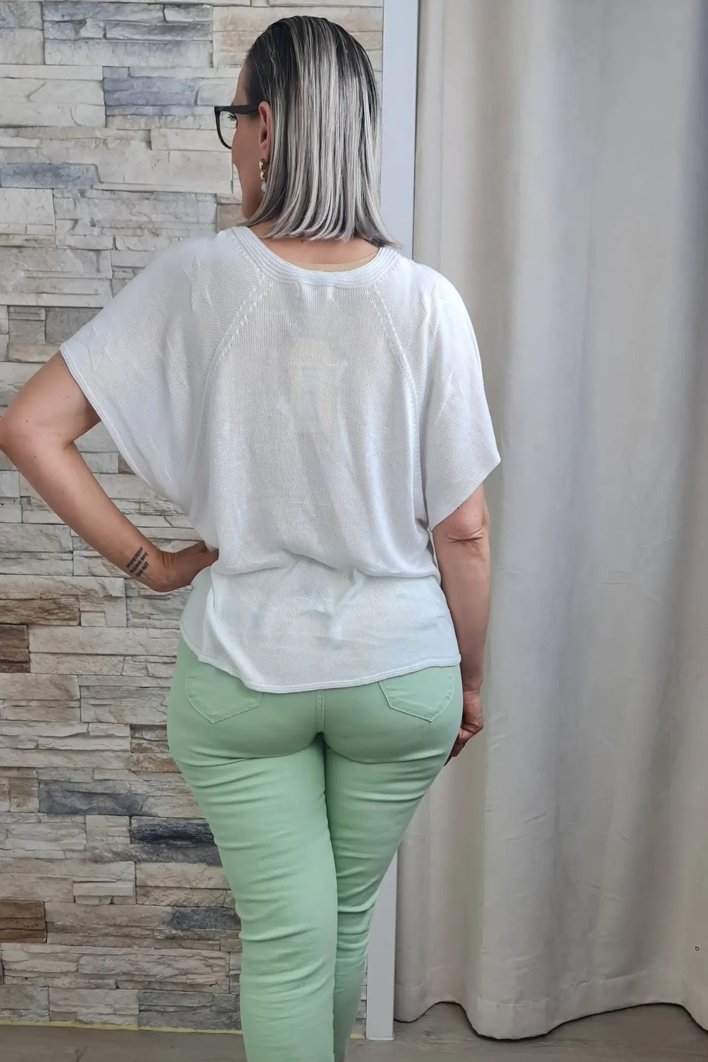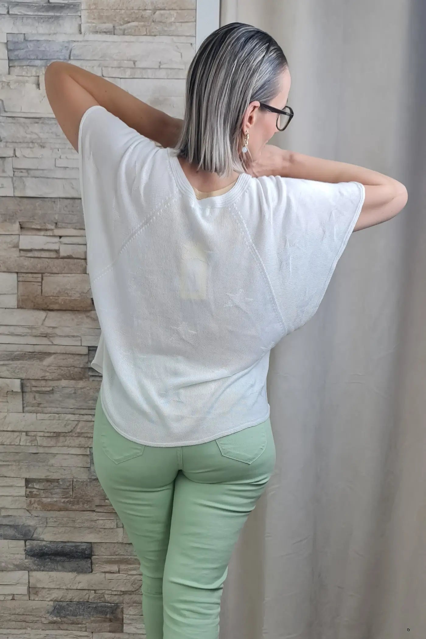 Ao vestir esta camisola, sentirá a leveza da malha, que se adapta ao seu corpo com suavidade. A cor branca, clássica e luminosa, reflete a pureza e a clareza, enquanto os detalhes de estrelas subtis e discretamente brilhantes são um lembrete constante de que a sua essência é única. As mangas tipo morcego conferem um ar solto e elegante, garantindo um visual confortável e sofisticado.