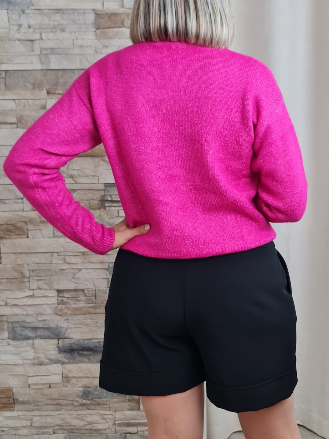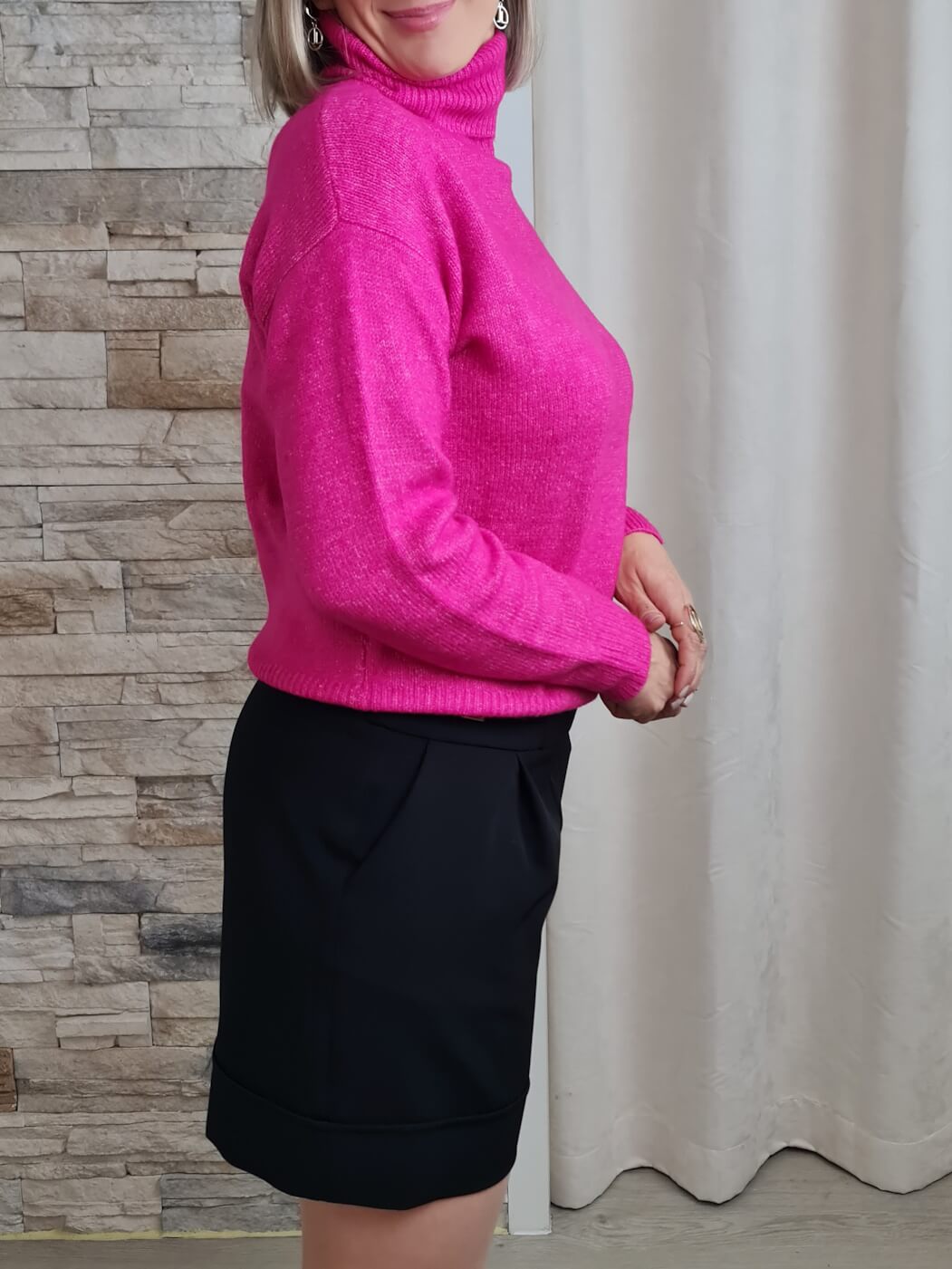 O design é uma fusão de conforto e cor. Com gola alta e mangas compridas, com punhos e barra canelados, destaca-se pela cor rosa pink vibrante, que irradia alegria e modernidade.