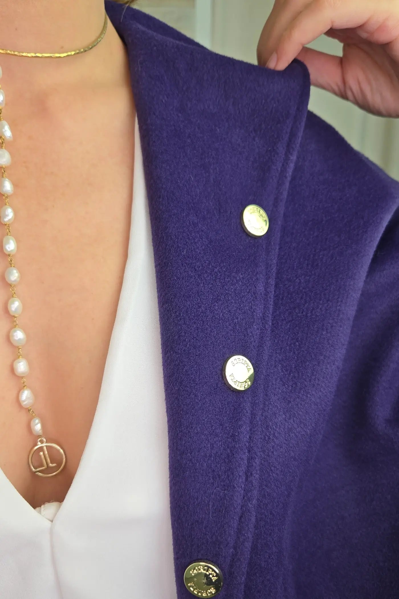 Fecho Dourado Statement: A capa fecha com três botões dourados grandes e redondos dispostos verticalmente, que criam um contraste luxuoso com o roxo profundo do tecido.