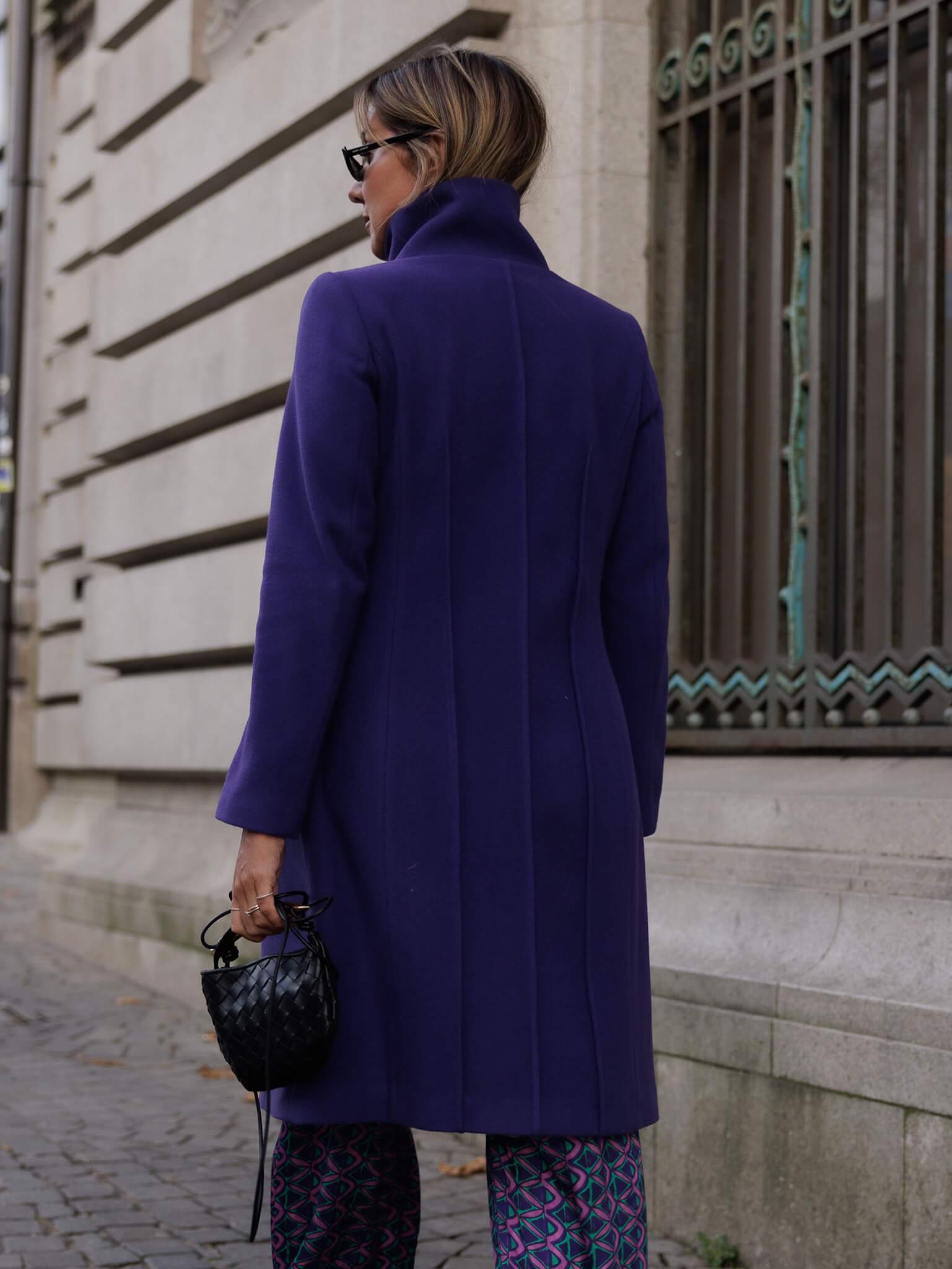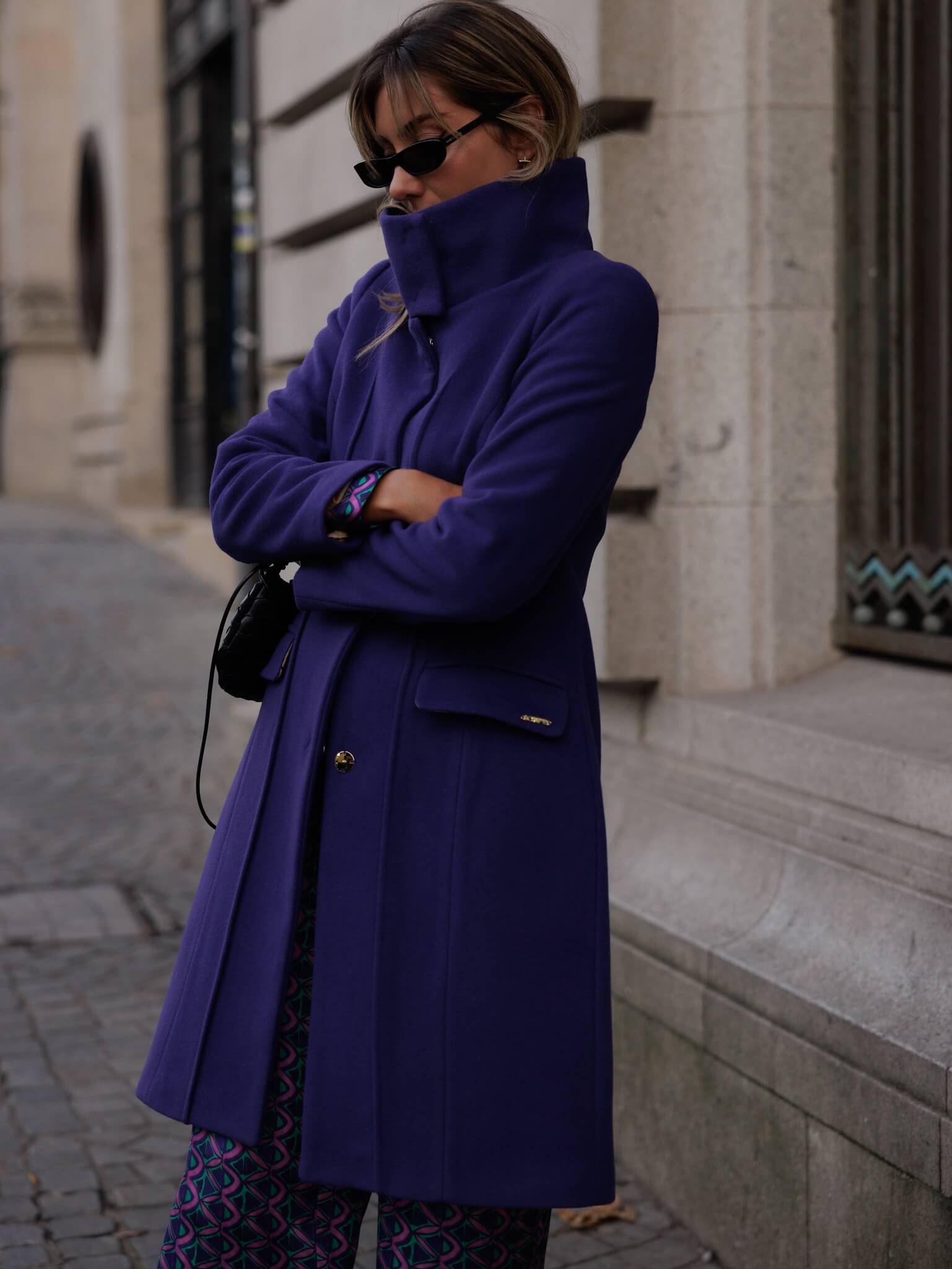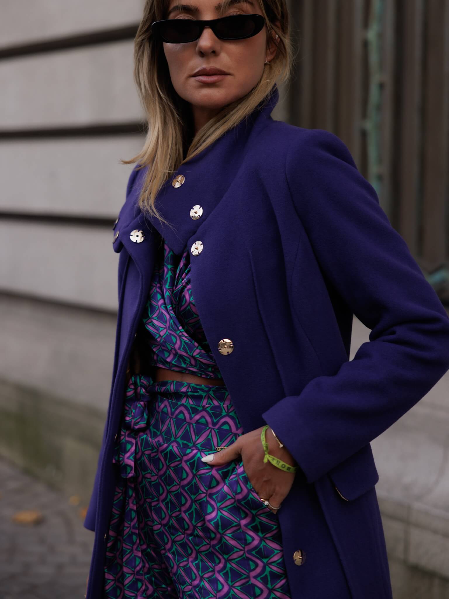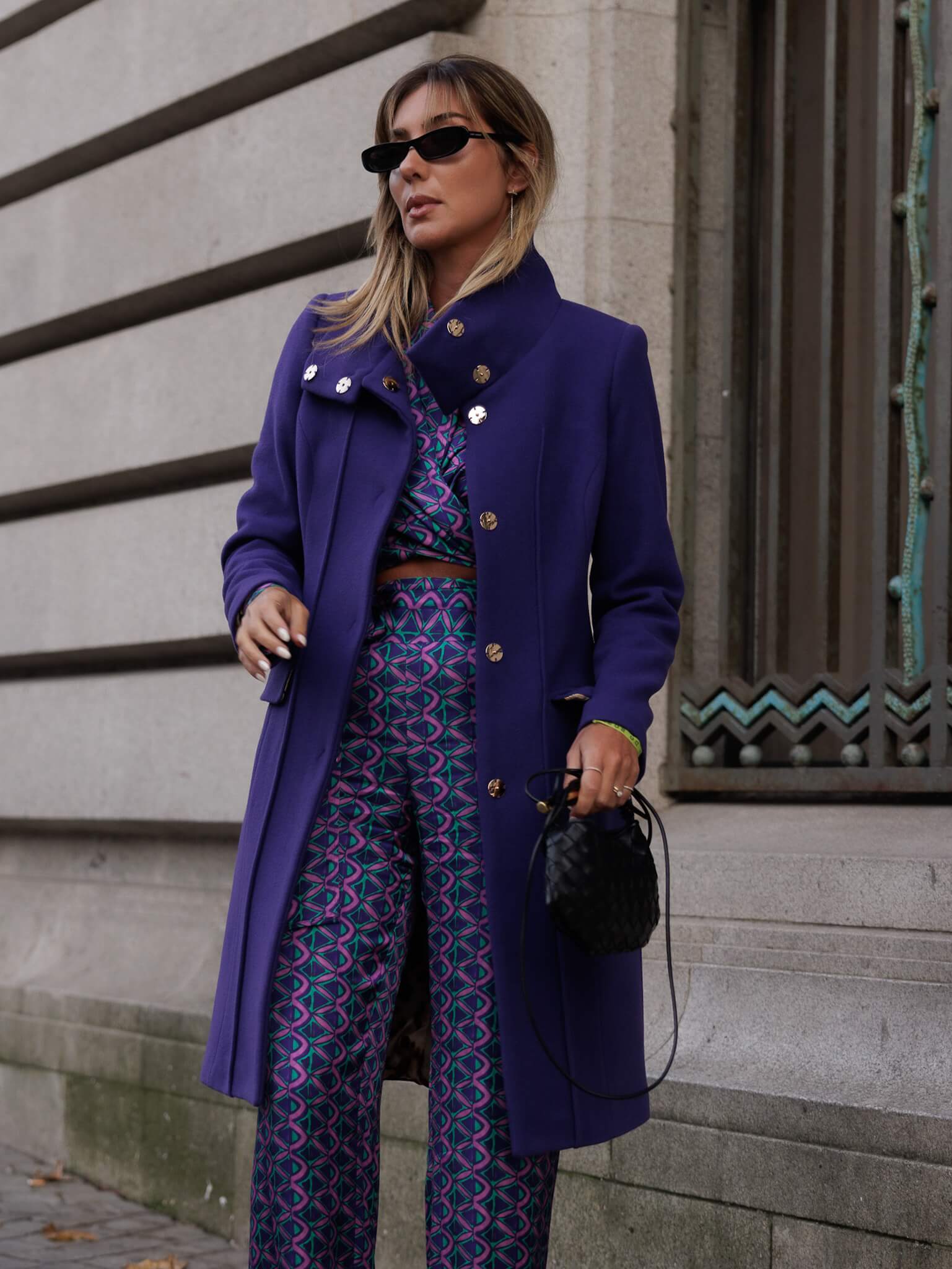 O design é uma fusão de alfaiataria clássica e detalhes luxuosos. Com gola alta, botões dourados e bolsos frontais, destaca-se pela cor roxa vibrante, que irradia originalidade e ousadia.