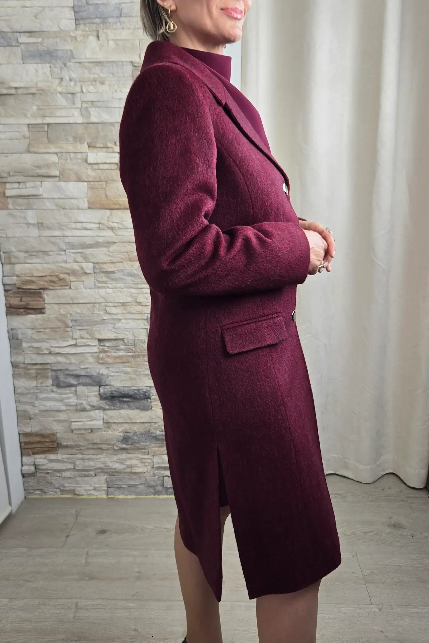 Cor e Tecido: Um tom bordeaux/vinho rico e profundo, perfeito para iluminar o rosto nos dias mais frios. O tecido de fazenda confere estrutura, calor e um caimento pesado e luxuoso.