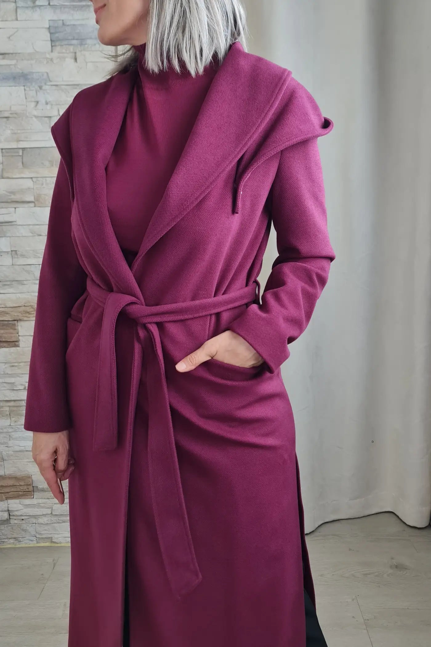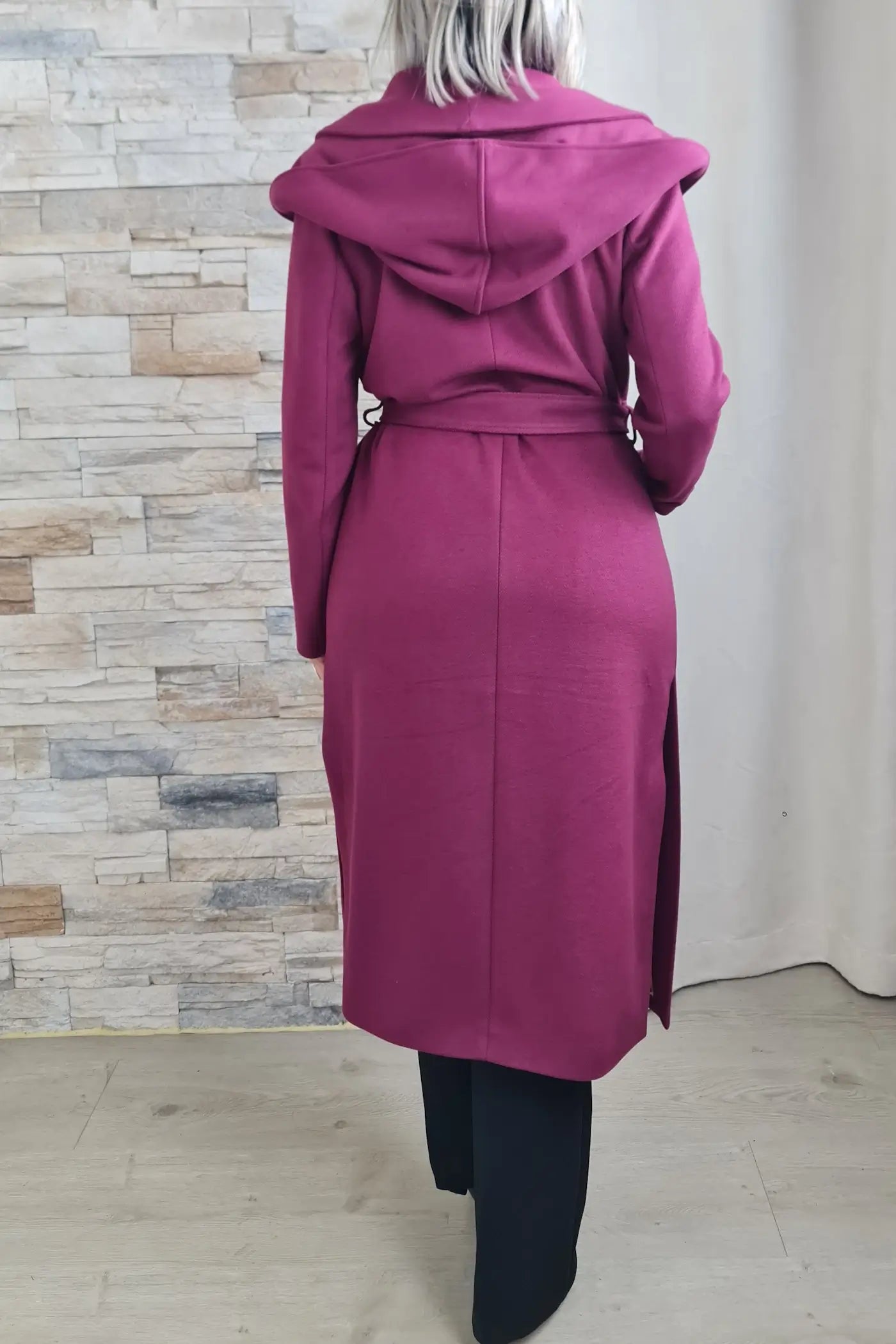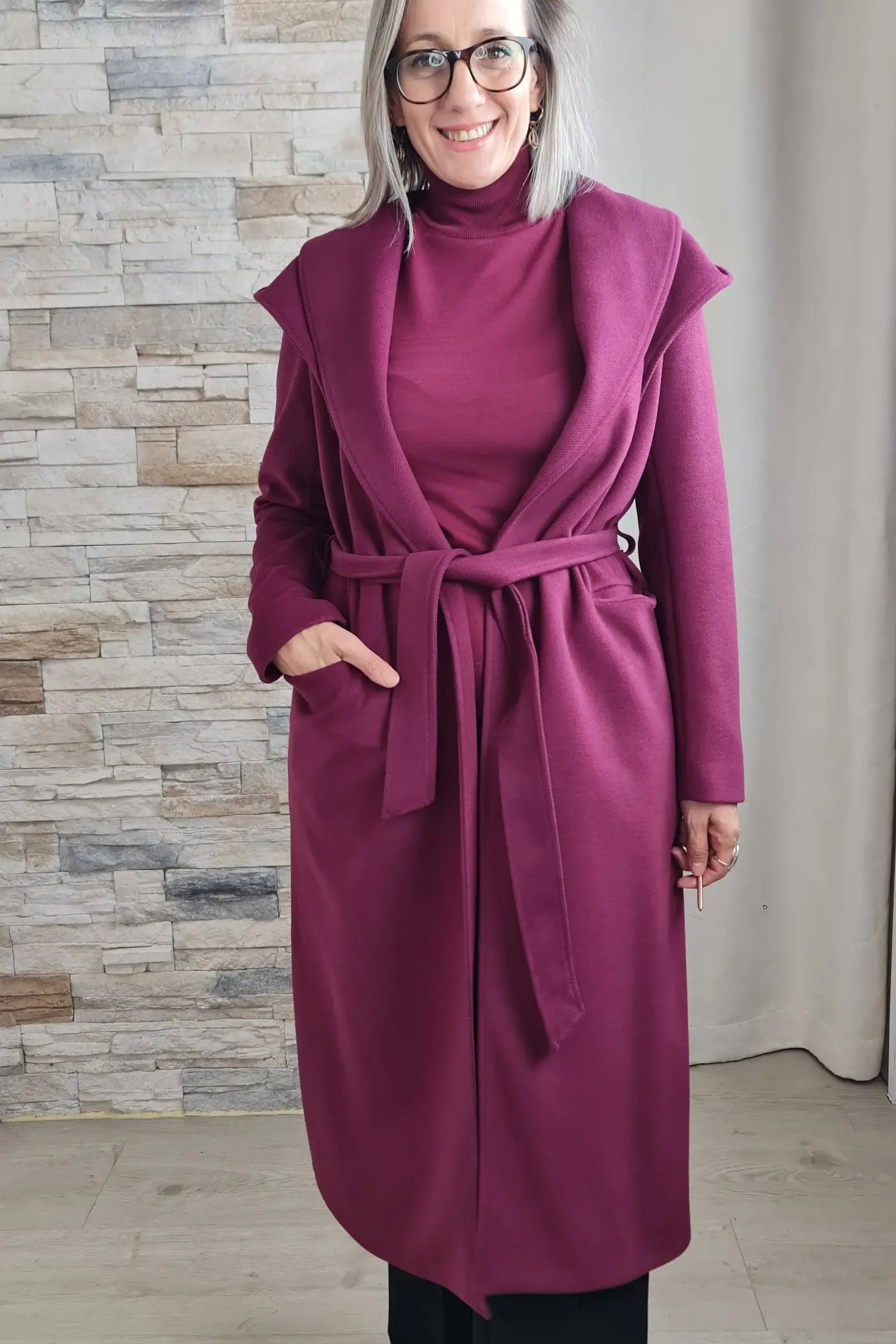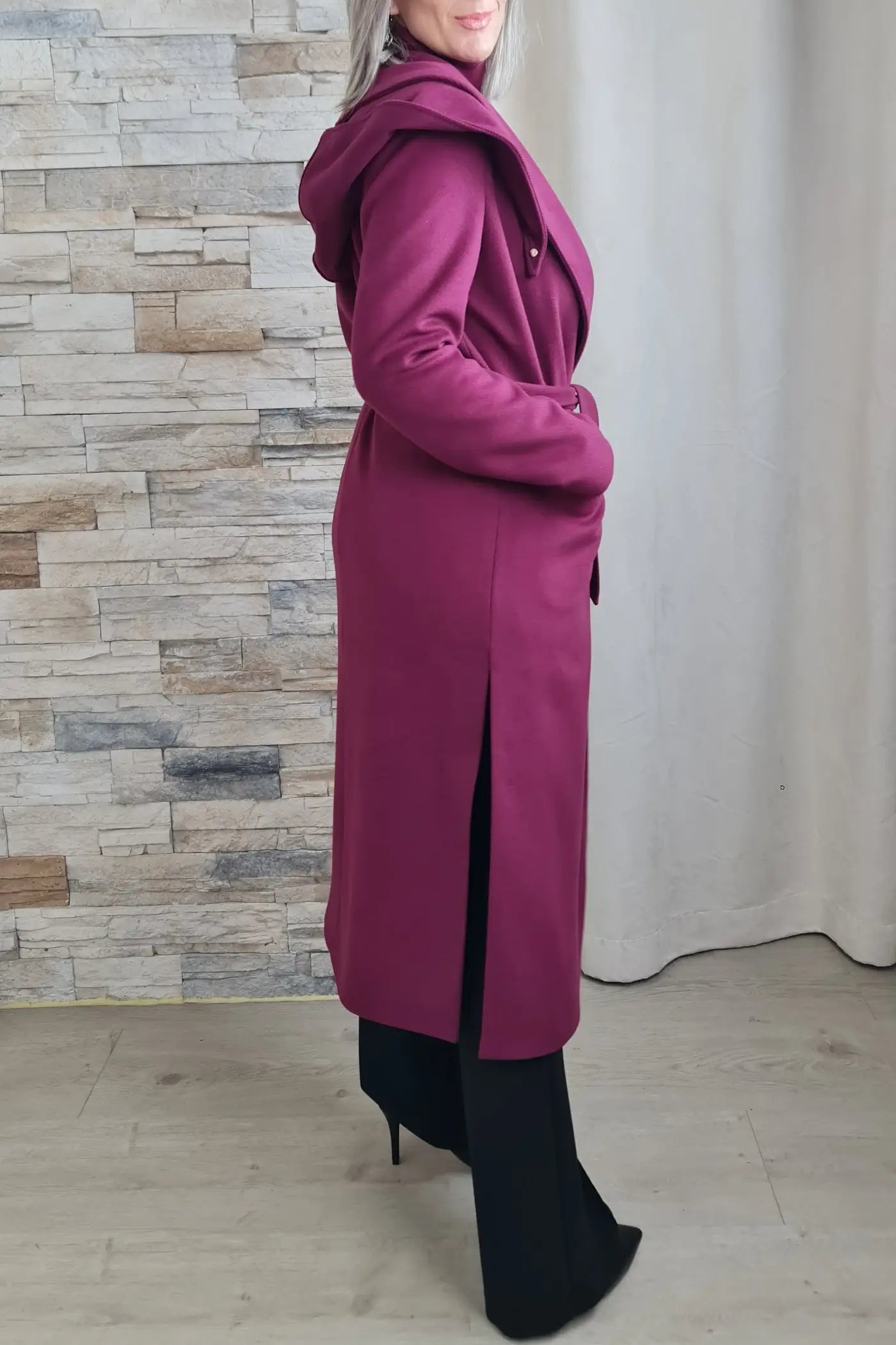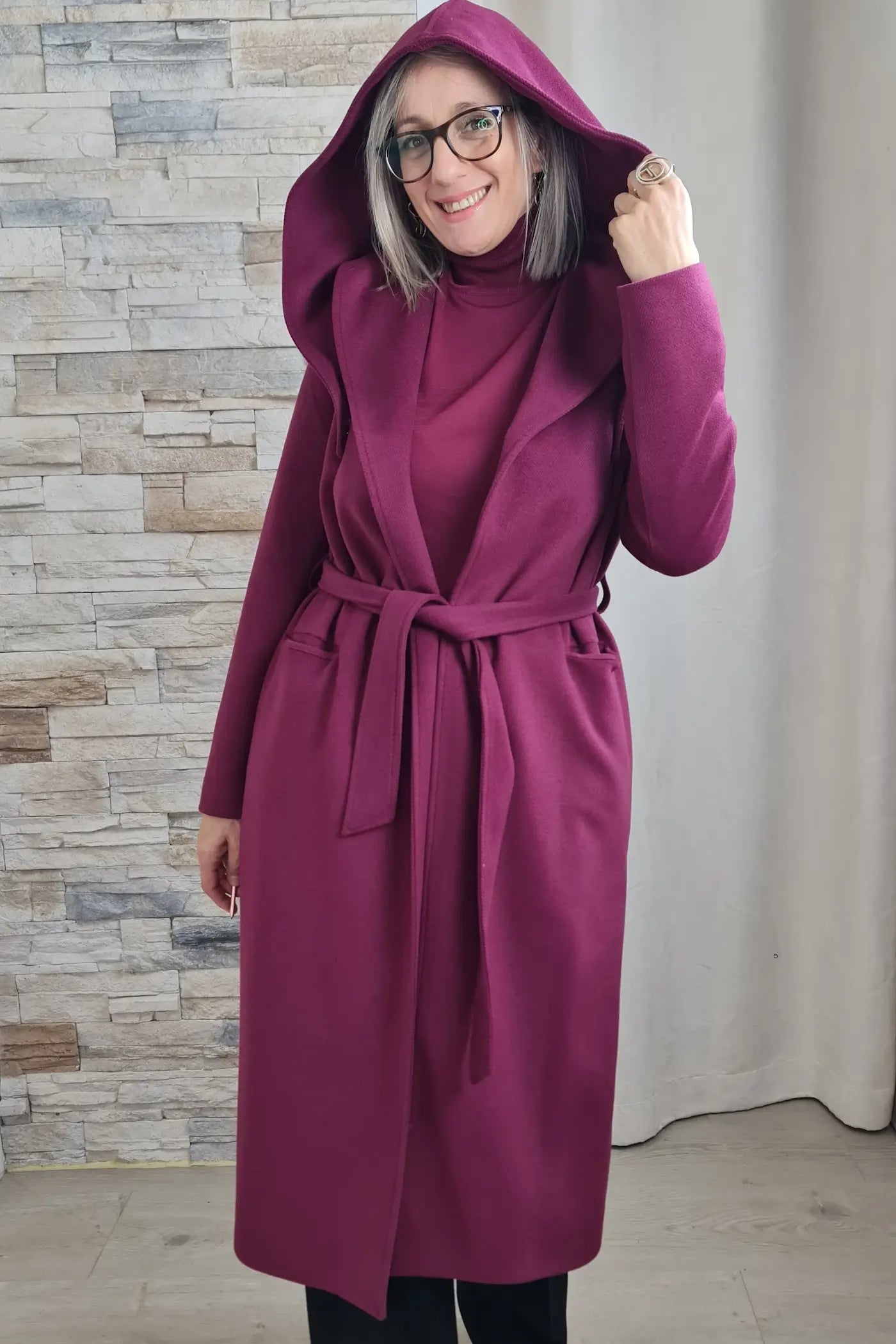 Ao vestir este casaco, o seu tom bordeaux, que evoca a força da natureza e a serenidade, proporciona uma sensação de calma e otimismo. O seu corte reto e o seu tecido de fazenda, confere-lhe um visual profissional e elegante, sem comprometer o conforto. O seu design, com o capuz e o cinto no mesmo tom, confere um toque de originalidade, convidando-a a expressar a sua personalidade de forma autêntica e descomplicada.