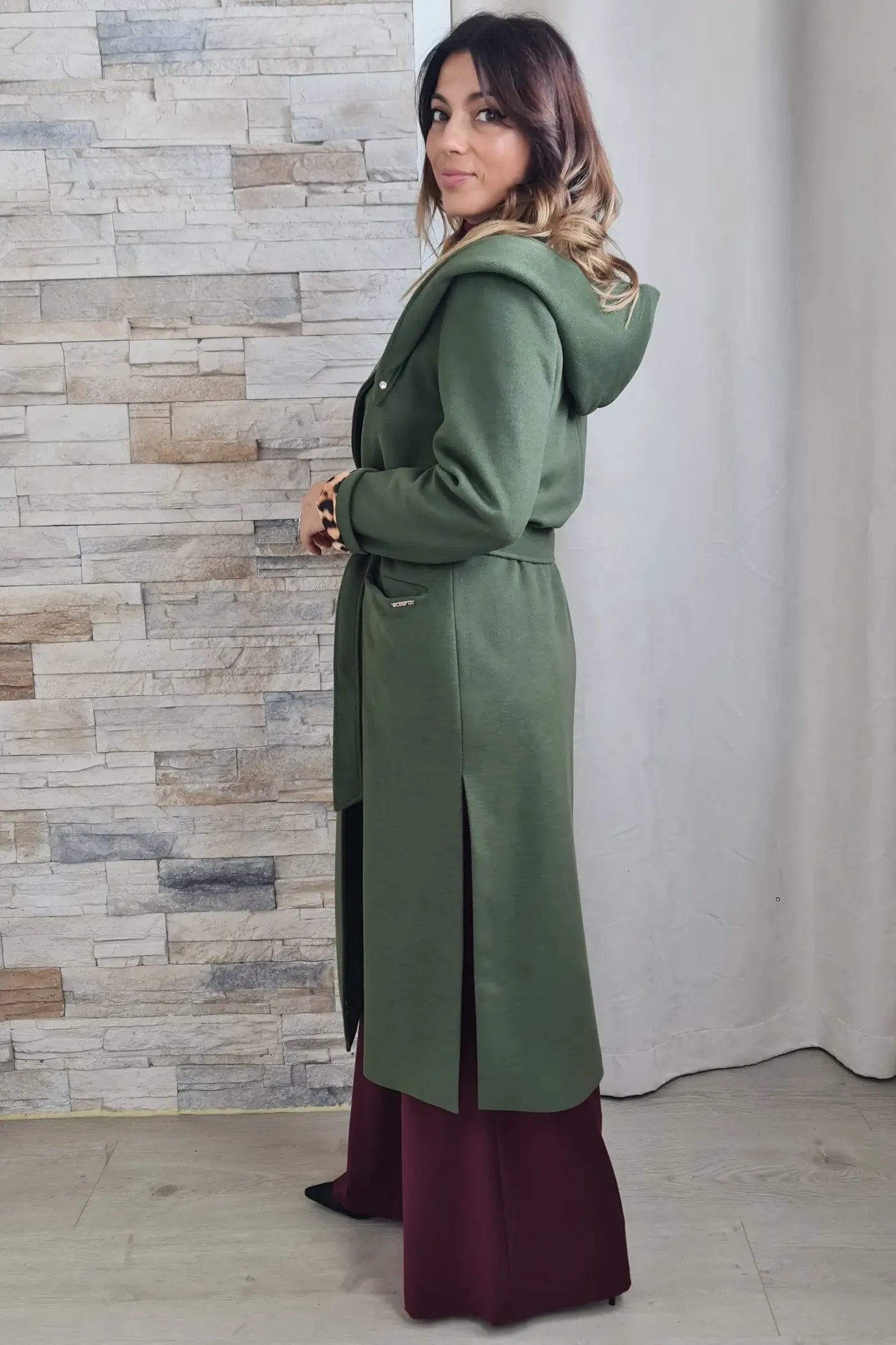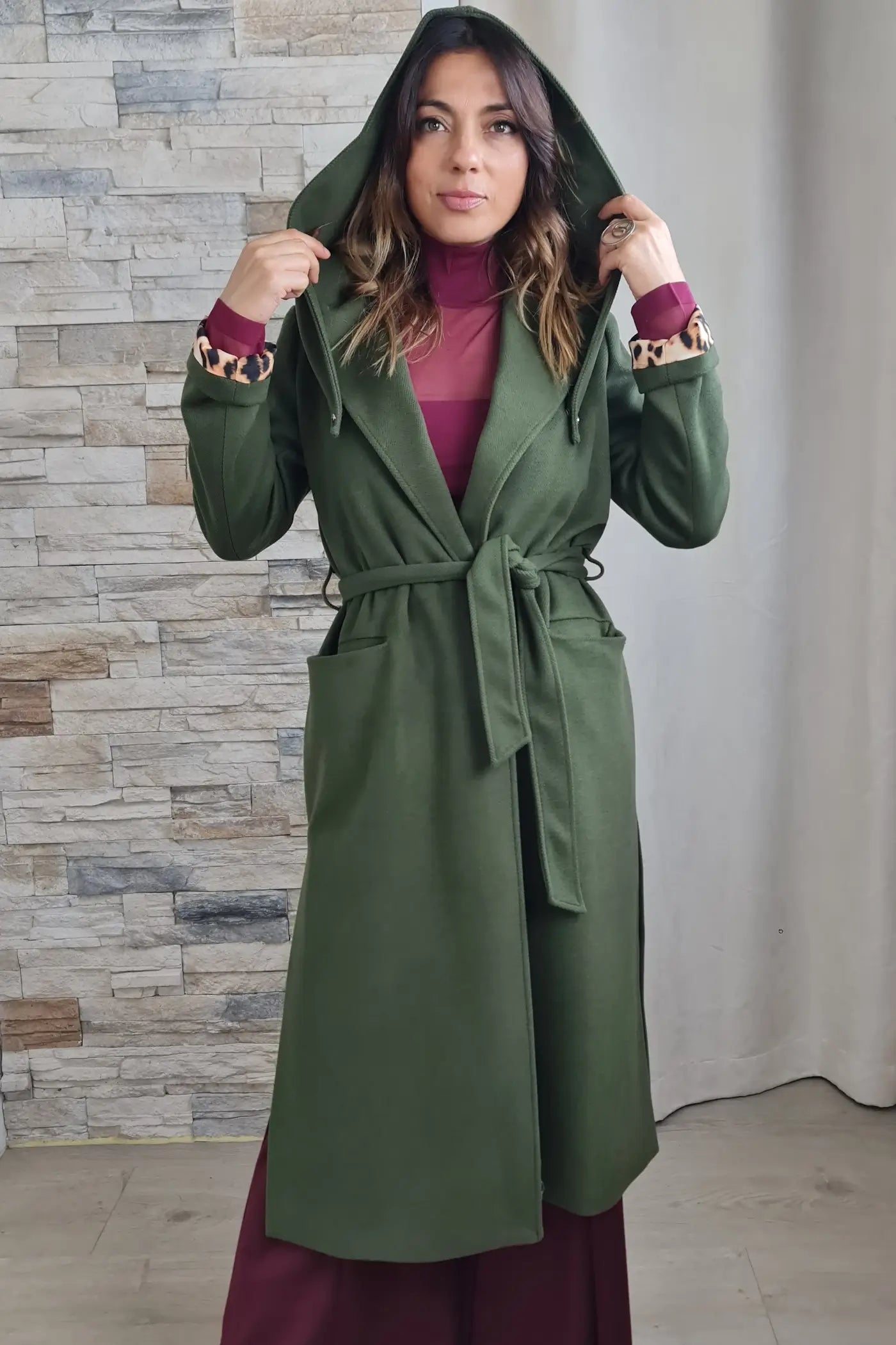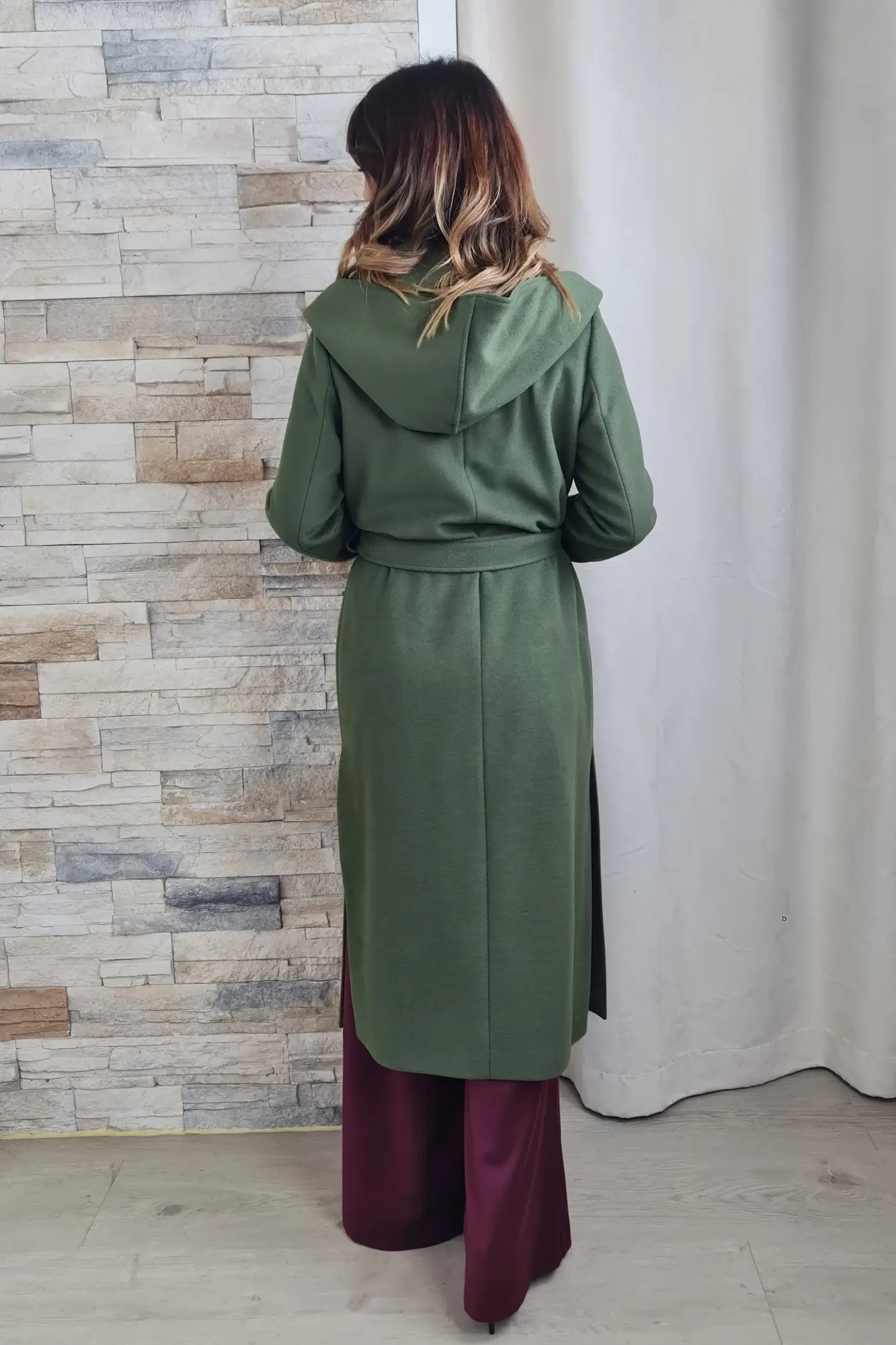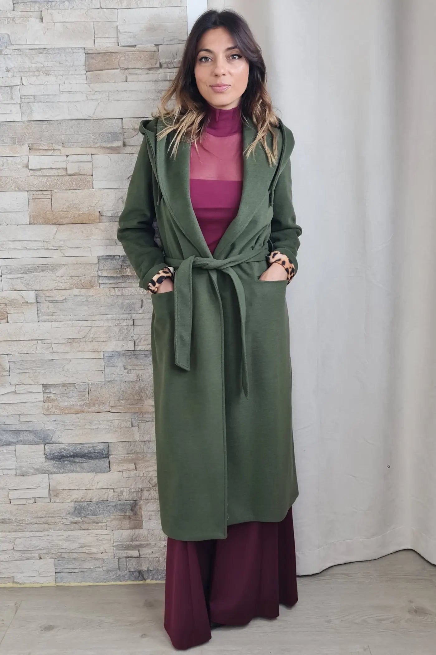 Ao vestir este casaco, a sua cor verde, que evoca a força da natureza e a serenidade, proporciona uma sensação de calma e otimismo. O seu corte reto e o seu tecido de fazenda, confere-lhe um visual profissional e elegante, sem comprometer o conforto. O seu design, com o capuz e o cinto no mesmo tom, confere um toque de originalidade, convidando-a a expressar a sua personalidade de forma autêntica e descomplicada.