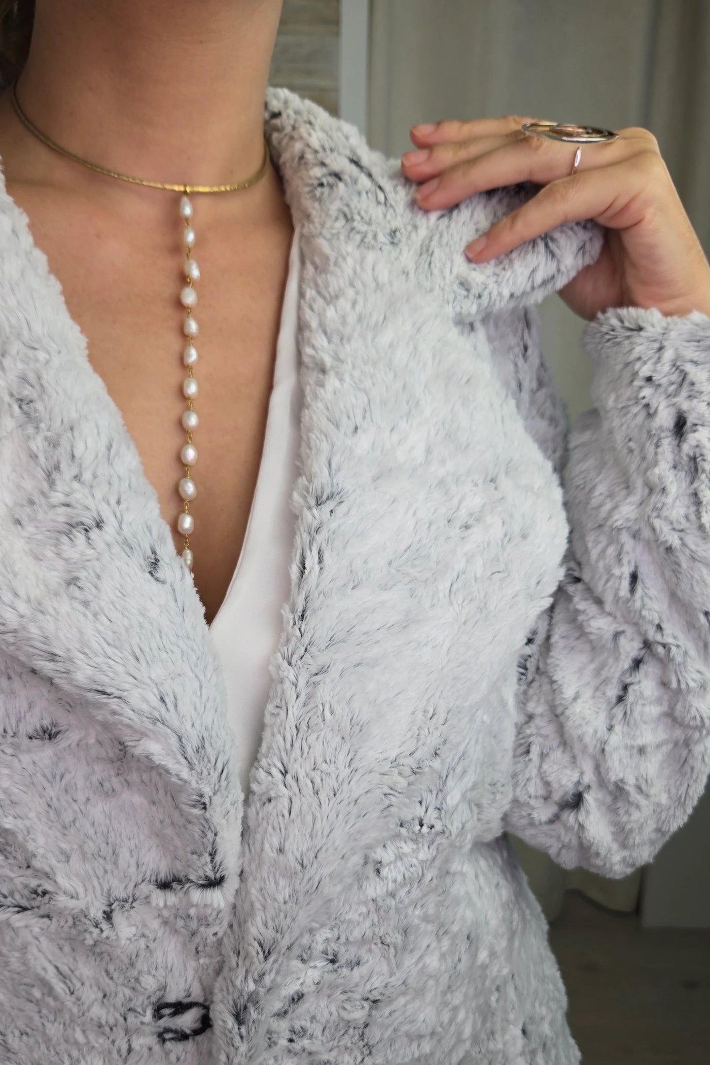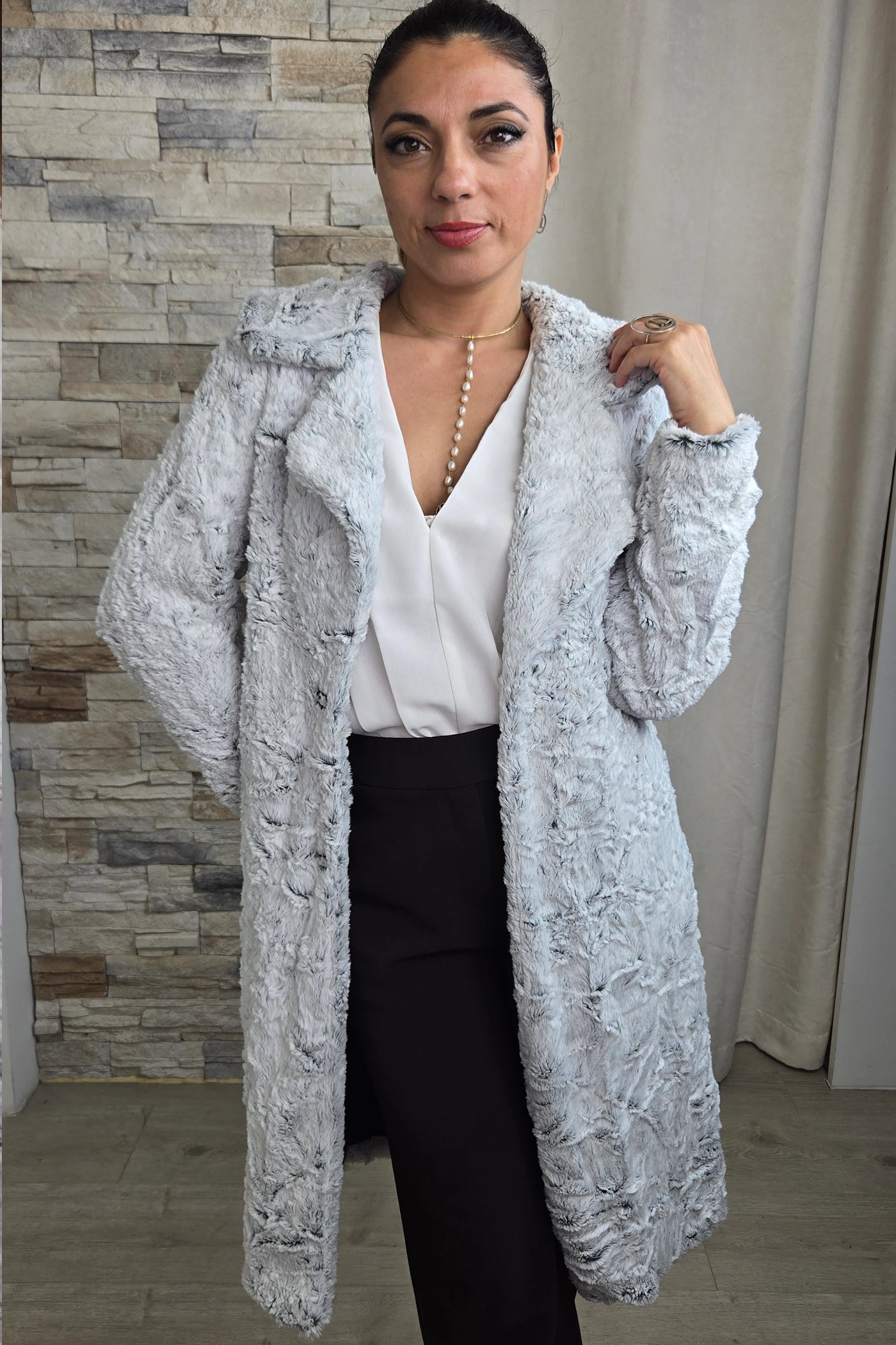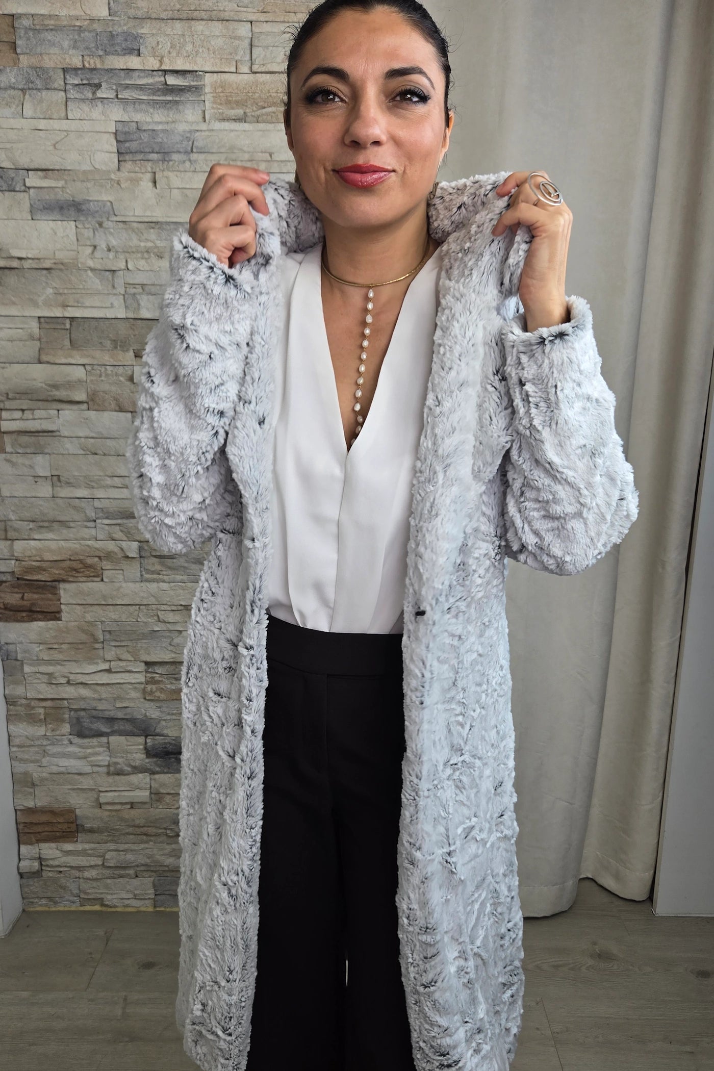 Ao vestir este casaco, sentirá o aconchego e a textura statement do pelo sintético, numa tonalidade branca com nuances cinzentas que evoca a elegância do inverno e o glamour instantâneo.