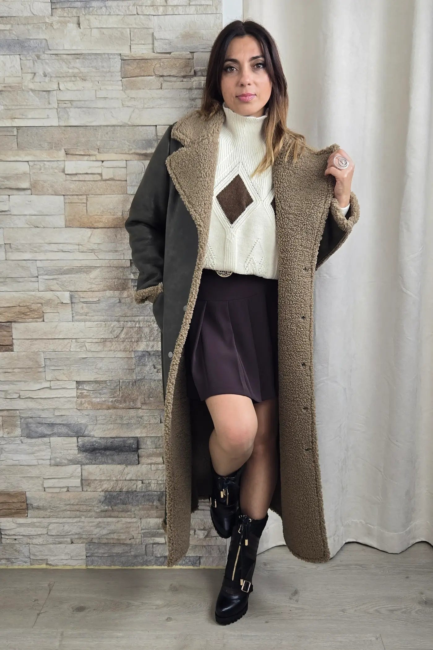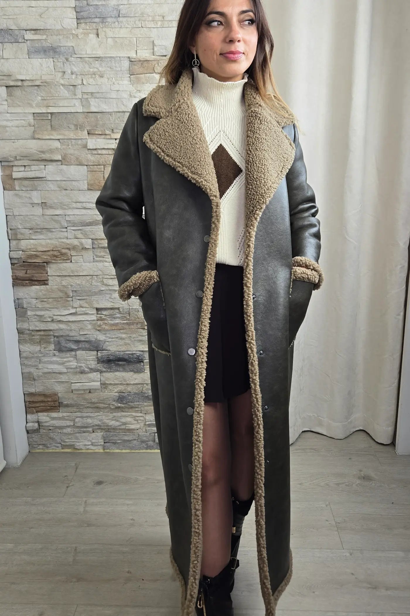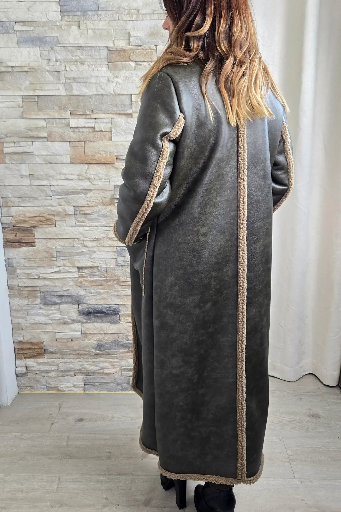 Cor e Textura Dupla: A parte exterior é em polipele (couro sintético) num tom verde-militar, uma cor poderosa e moderna. O interior e todos os acabamentos (golas, punhos e costuras) são revestidos com um pêlo sintético de cor castanho claro, criando um contraste textural delicioso.