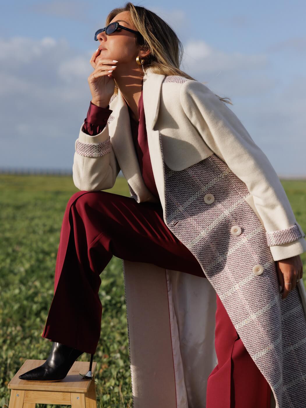 Ao vestir o "Rebeldia Refinada", sentirá uma sensação de conforto e um toque de modernidade. O tecido estruturado e o caimento reto proporcionam bem-estar e a convidam a expressar a sua personalidade marcante.