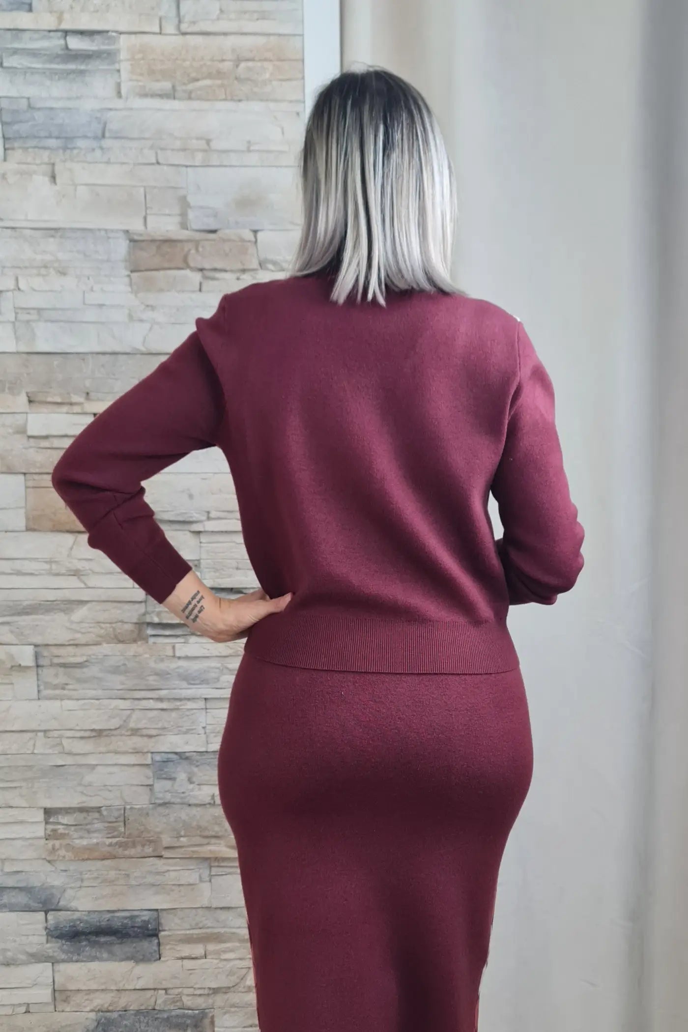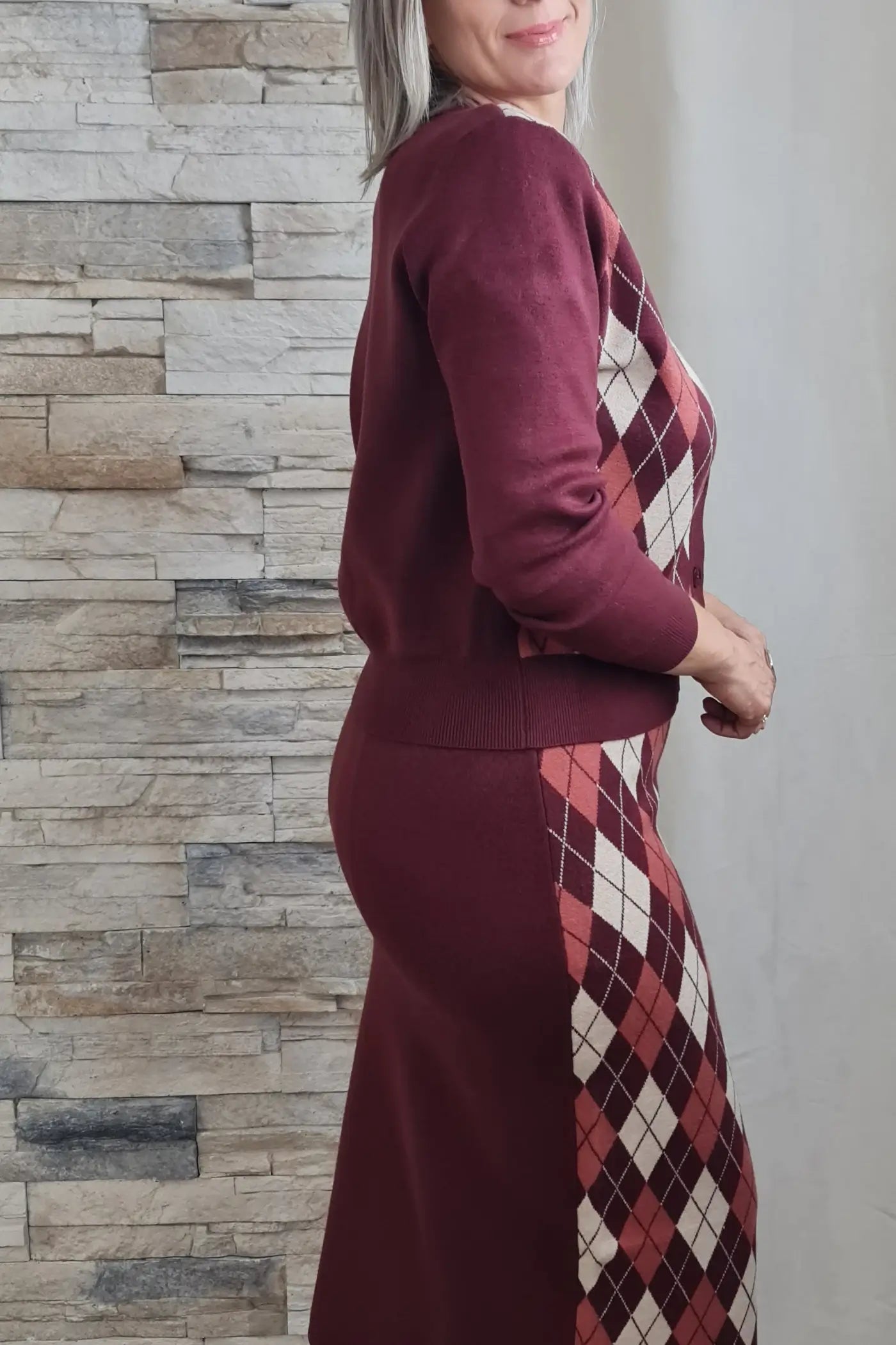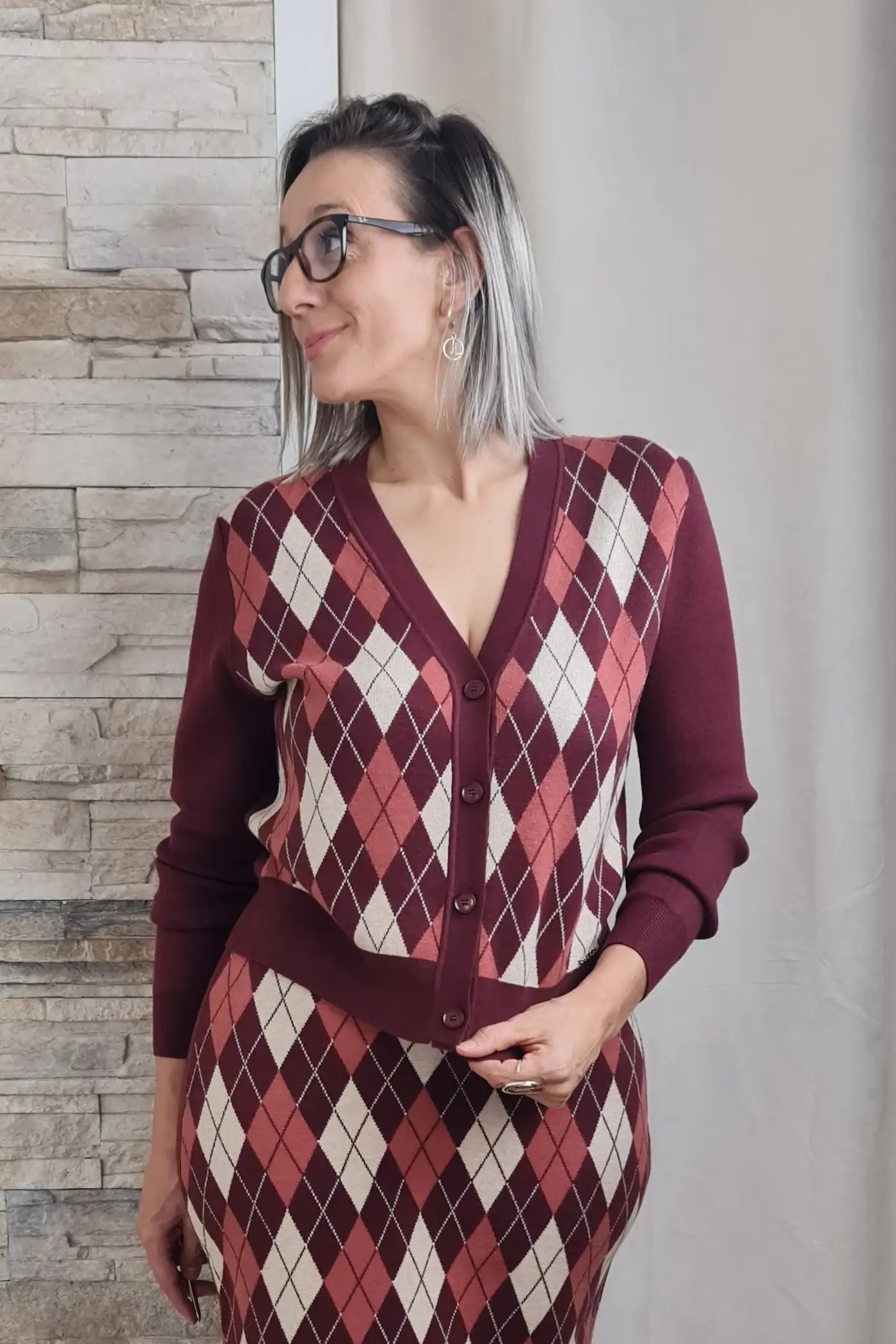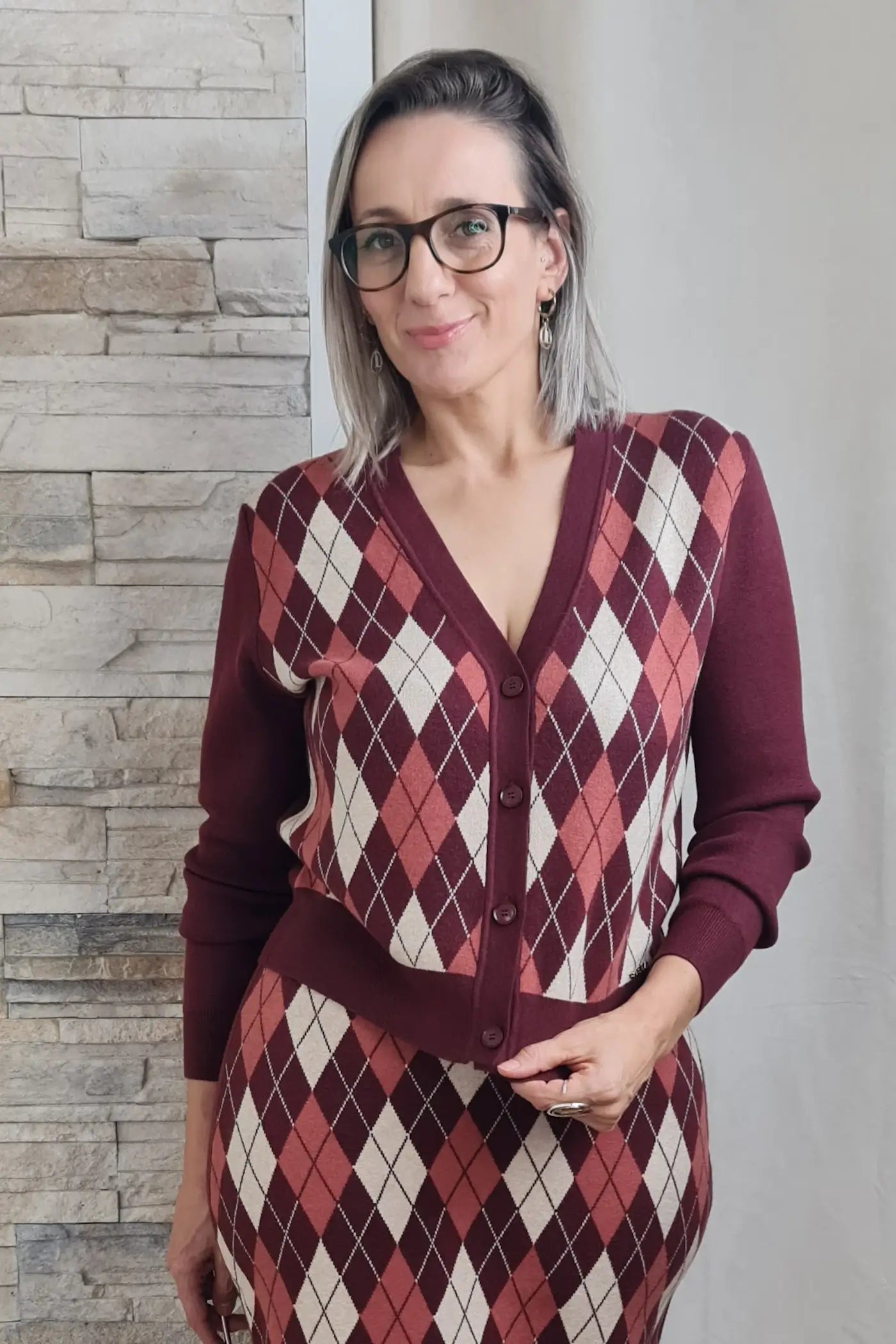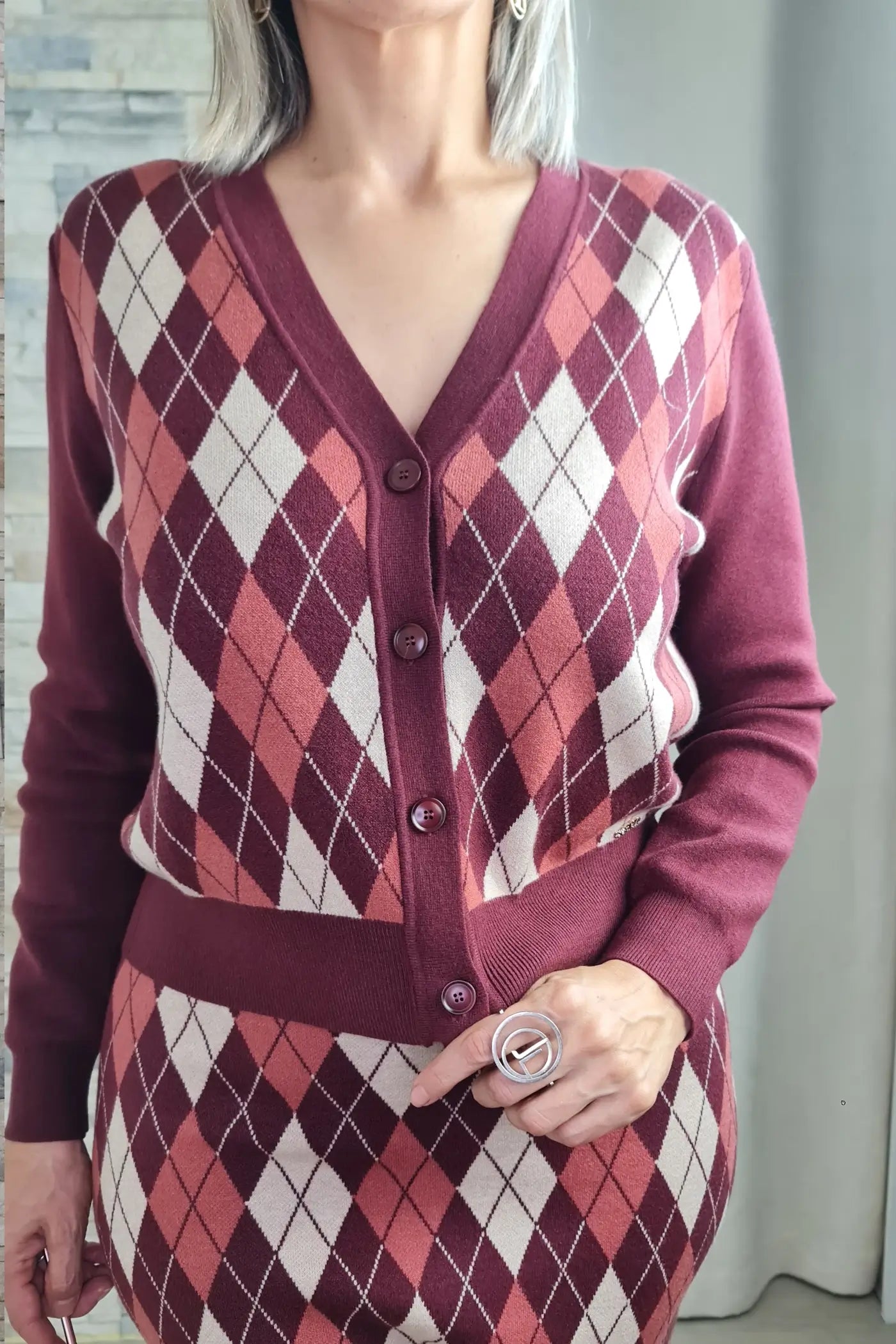 Ao vestir este casaco, sentirá o conforto e a suavidade da malha que envolve o corpo com suavidade. O seu padrão clássico de losangos em tons de bordeaux, bege e branco transmite uma elegância intemporal, evocando um estilo que é simultaneamente sofisticado e versátil. O decote em V e o fecho de botões conferem um toque de requinte, enquanto as mangas compridas e o corte justo valorizam a silhueta, sem comprometer o conforto.