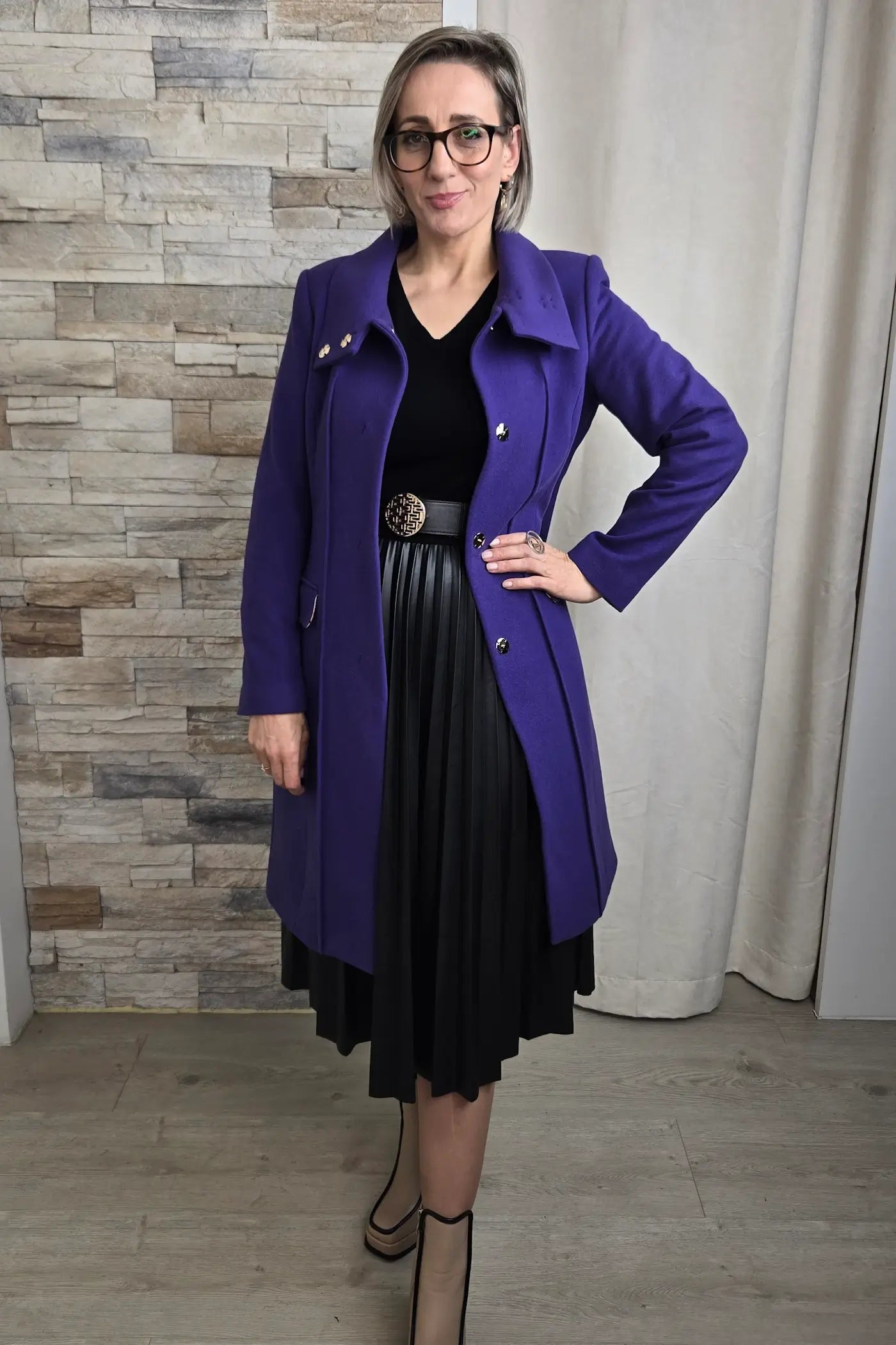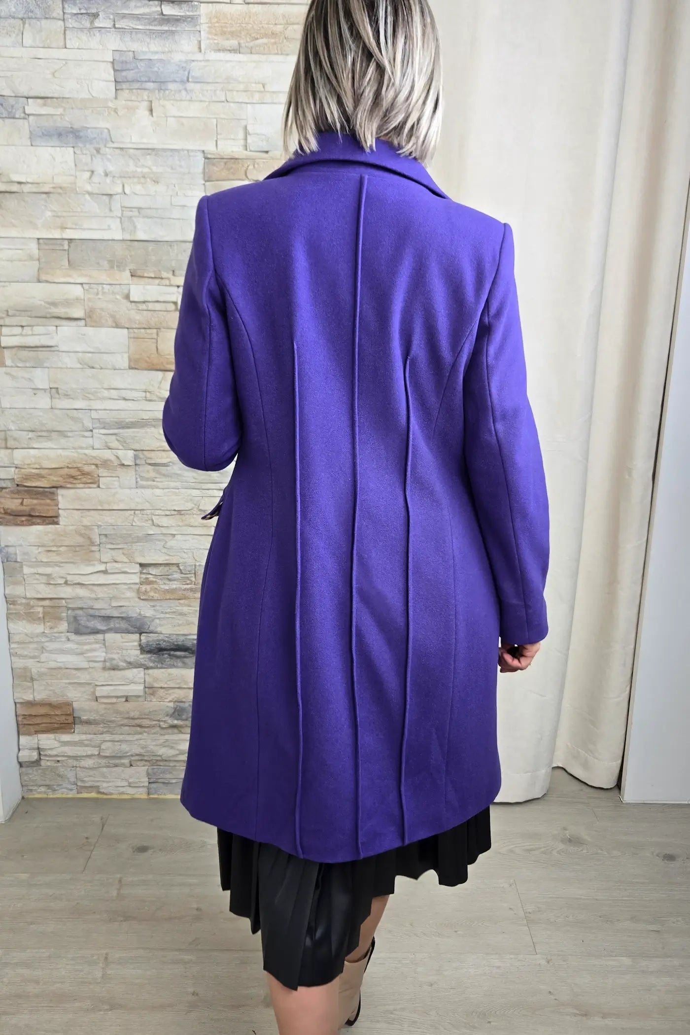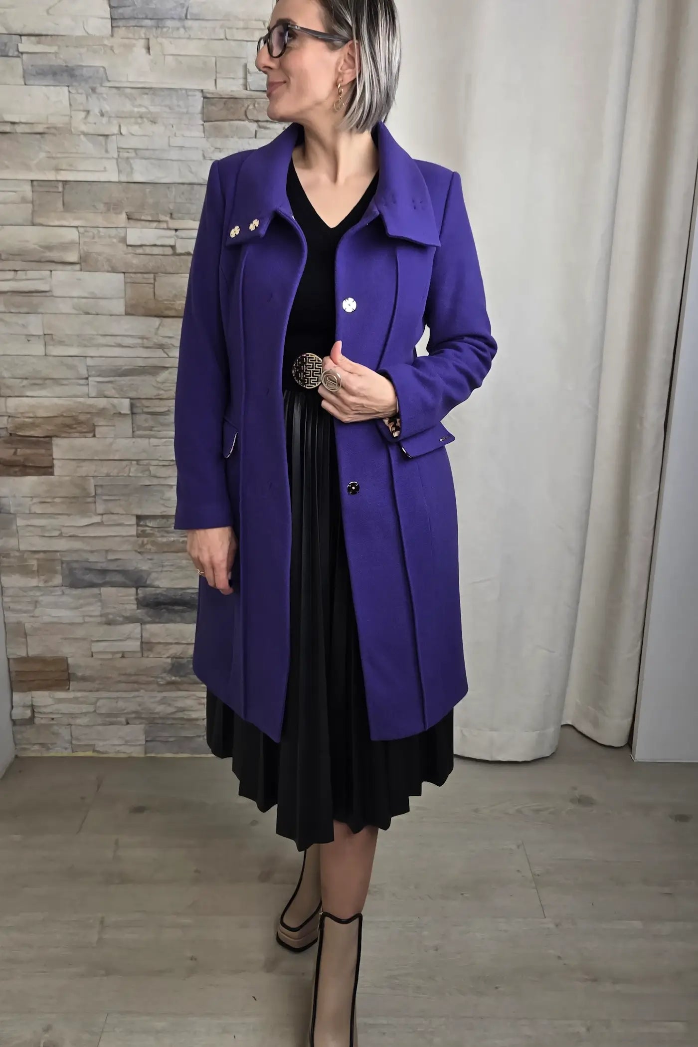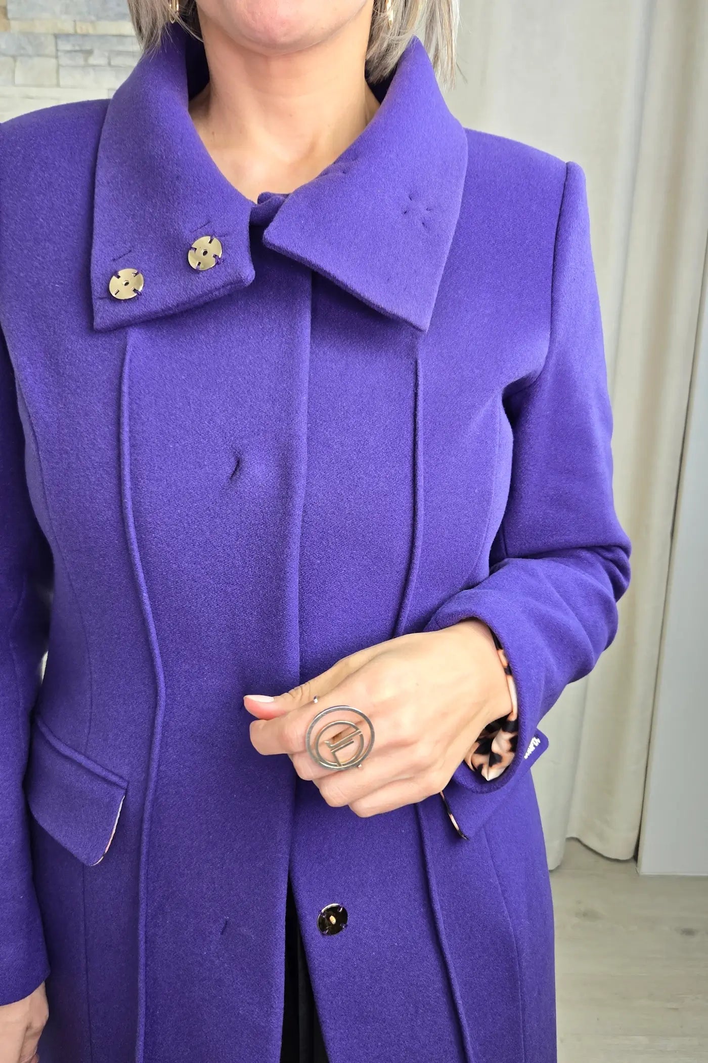 O design é uma fusão de alfaiataria clássica e detalhes luxuosos. Com gola alta, botões dourados e bolsos frontais, destaca-se pela cor roxa vibrante, que irradia originalidade e ousadia.