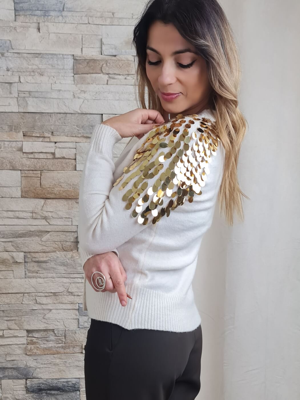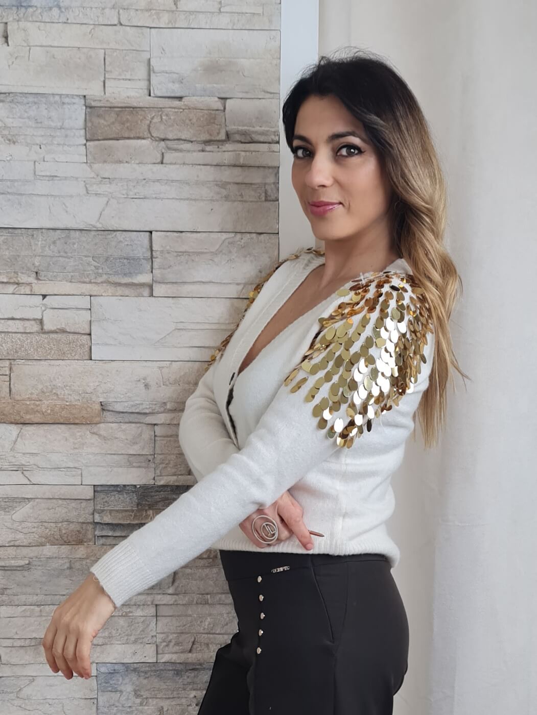 O casaco em destaque é um cardigan de malha branca com detalhes em lantejoulas douradas nos ombros. A peça apresenta um design clássico e elegante, com decote em V e botões frontais. As lantejoulas douradas adicionam um toque de brilho e sofisticação ao visual, tornando-o ideal para ocasiões especiais.