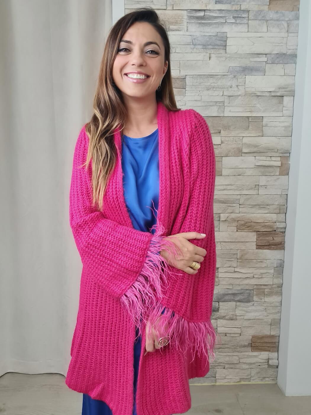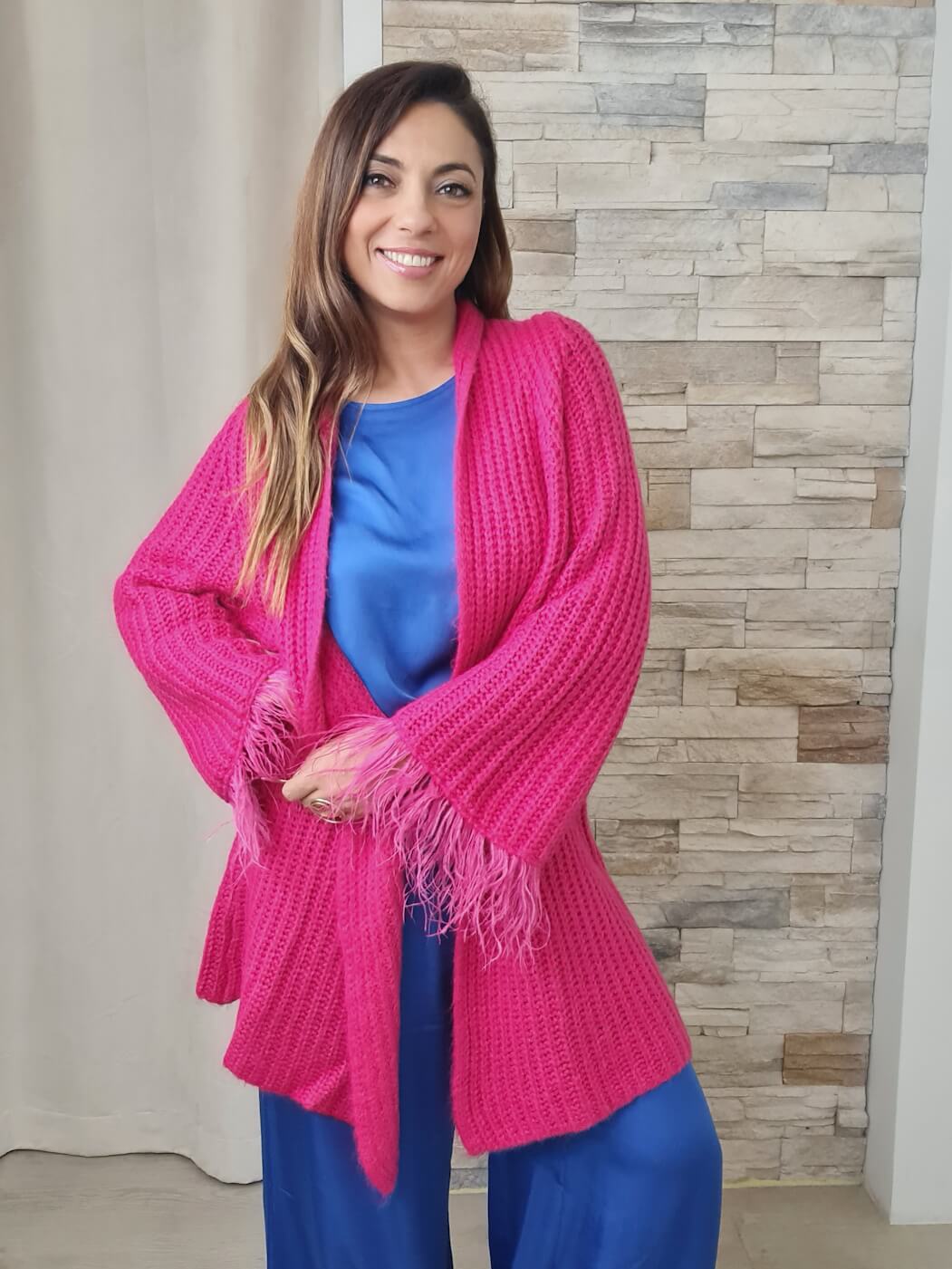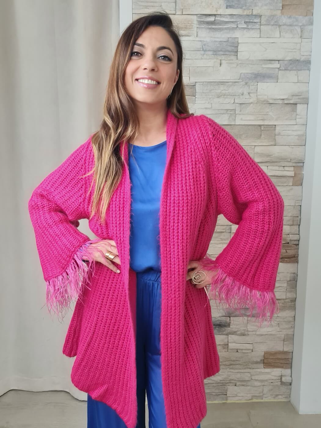 O design é uma fusão de conforto e detalhes únicos. Com uma abertura frontal e mangas largas, destaca-se pela cor rosa pink vibrante e as aplicações de plumas ao longo das mangas, adicionando um toque de glamour e originalidade.