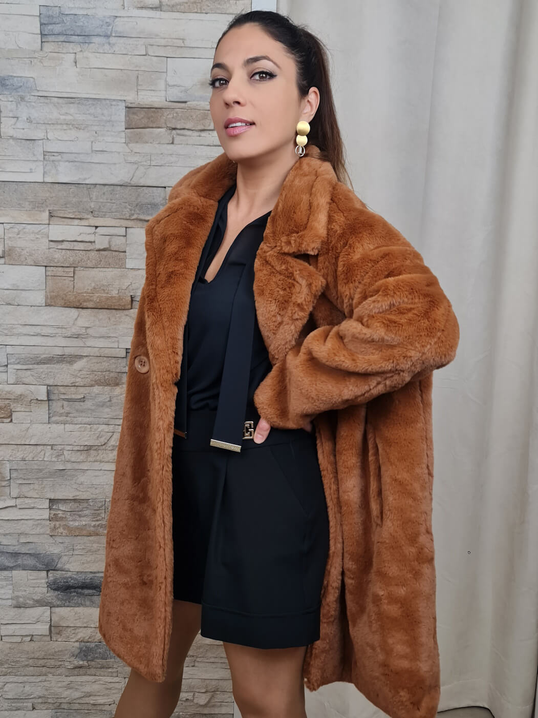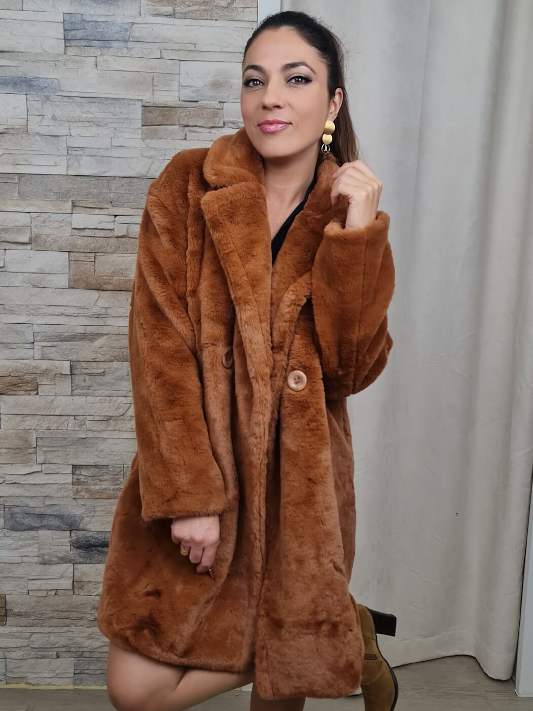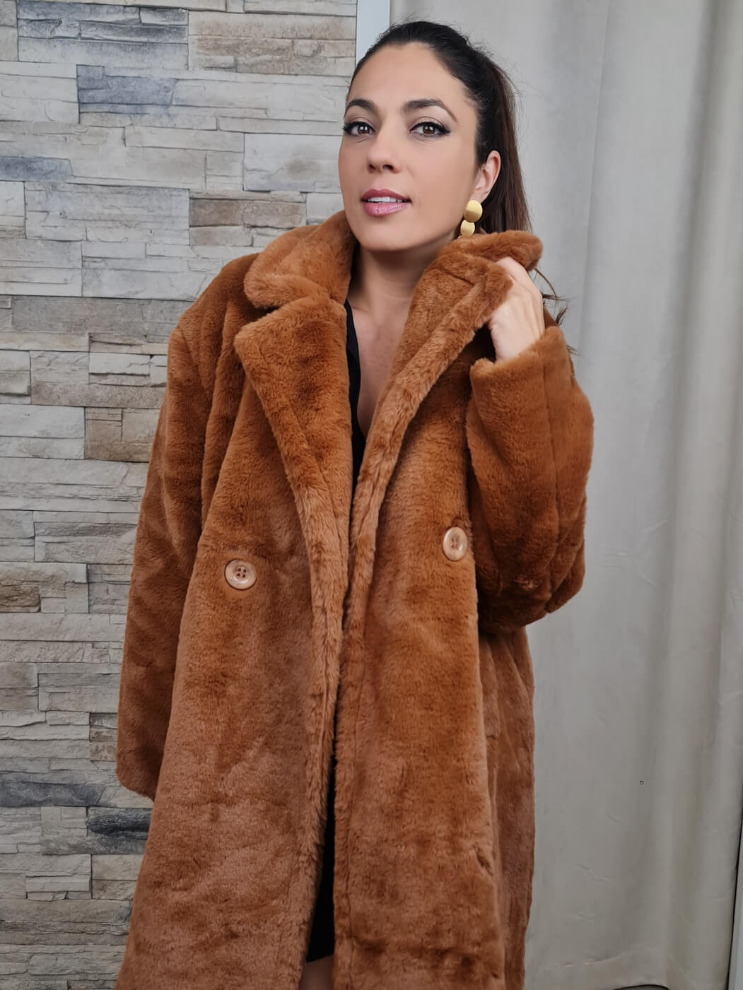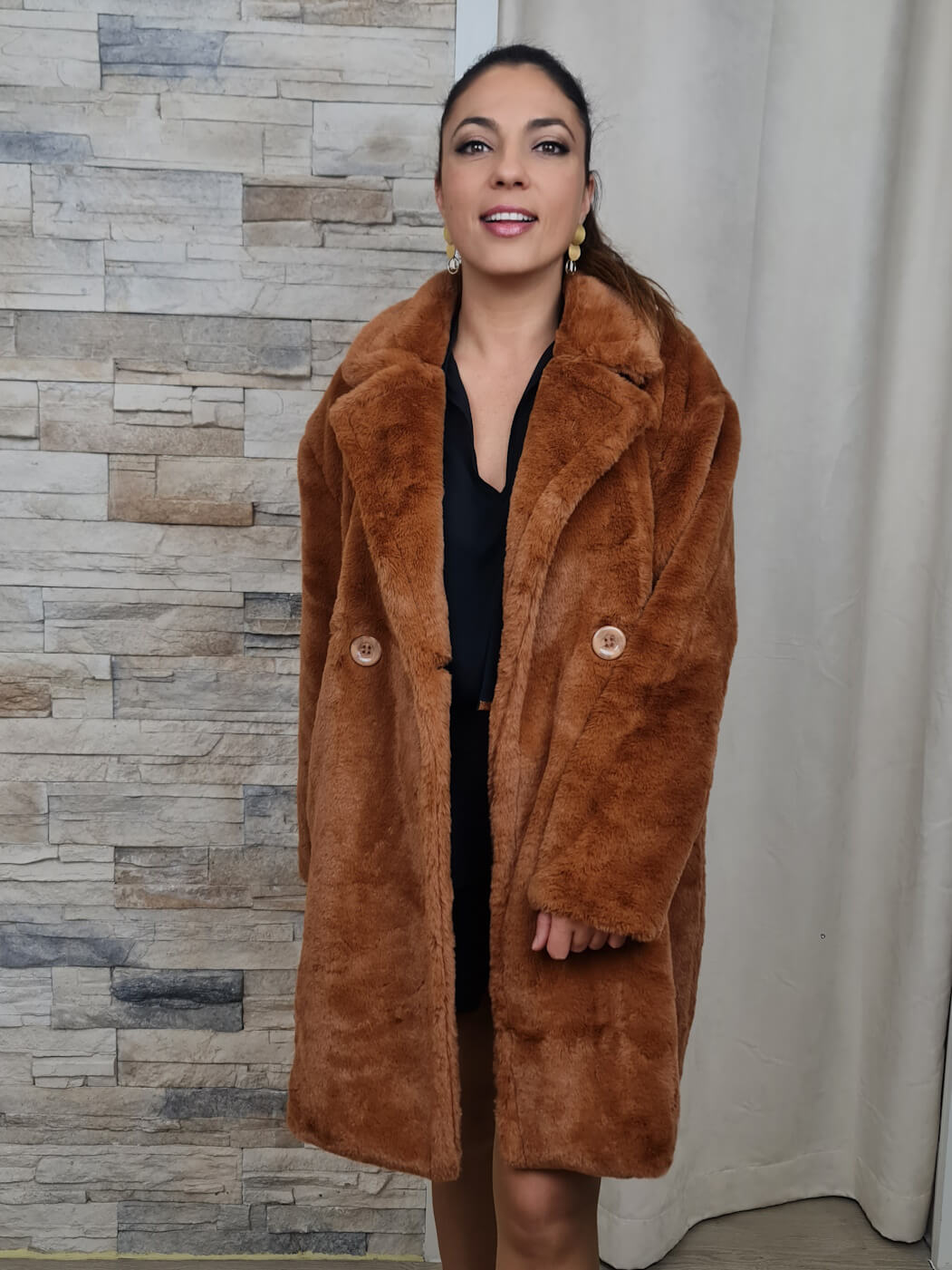 O casaco é comprido, na cor castanho caramelo e feito de um material sintético, com uma textura fofa e macia. Possui gola e lapelas clássicas, e o fecho frontal é feito por dois grandes botões redondos na mesma tonalidade do casaco. As mangas são compridas e largas. O corte do casaco é amplo e confortável, ideal para os dias mais frios.