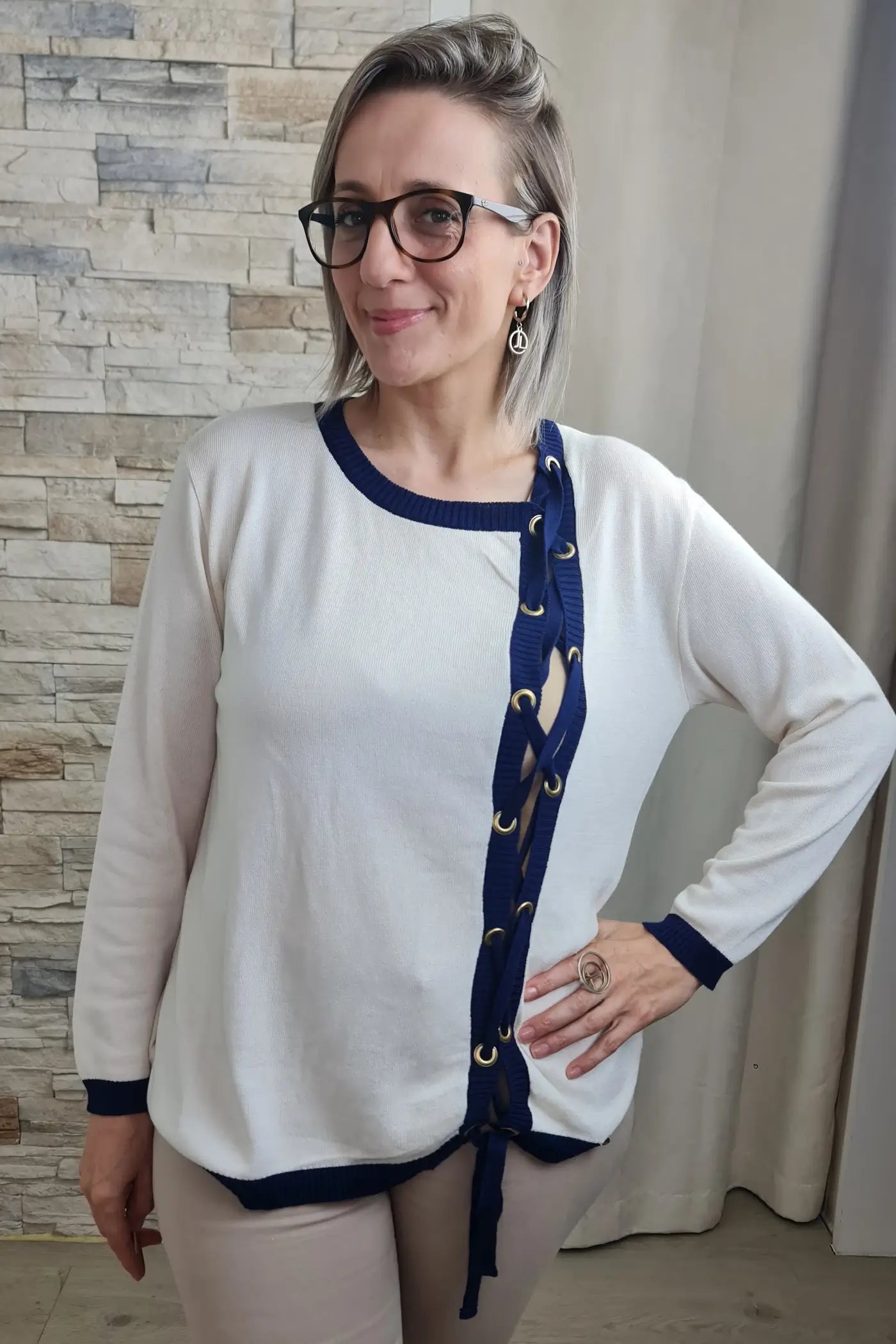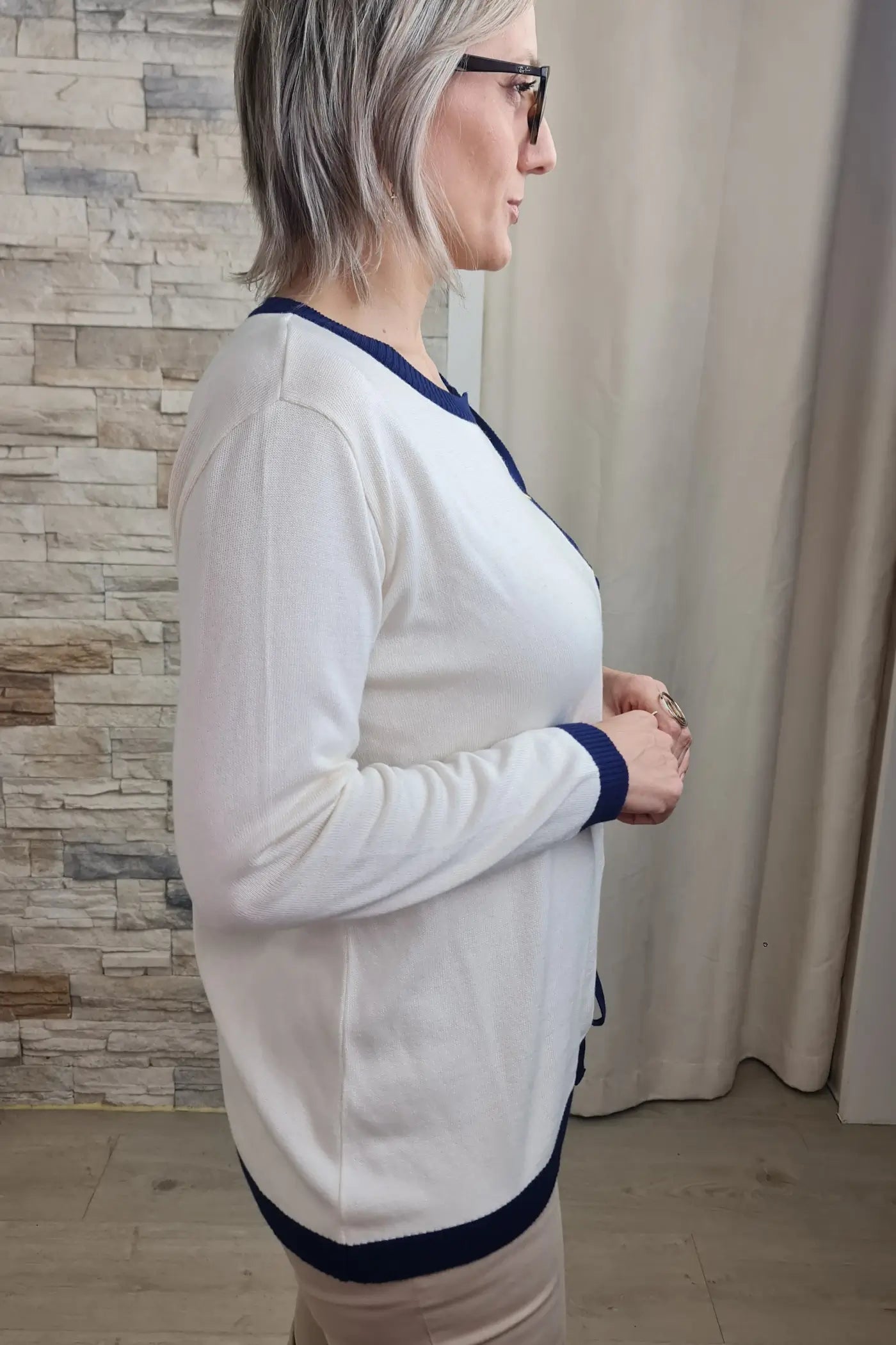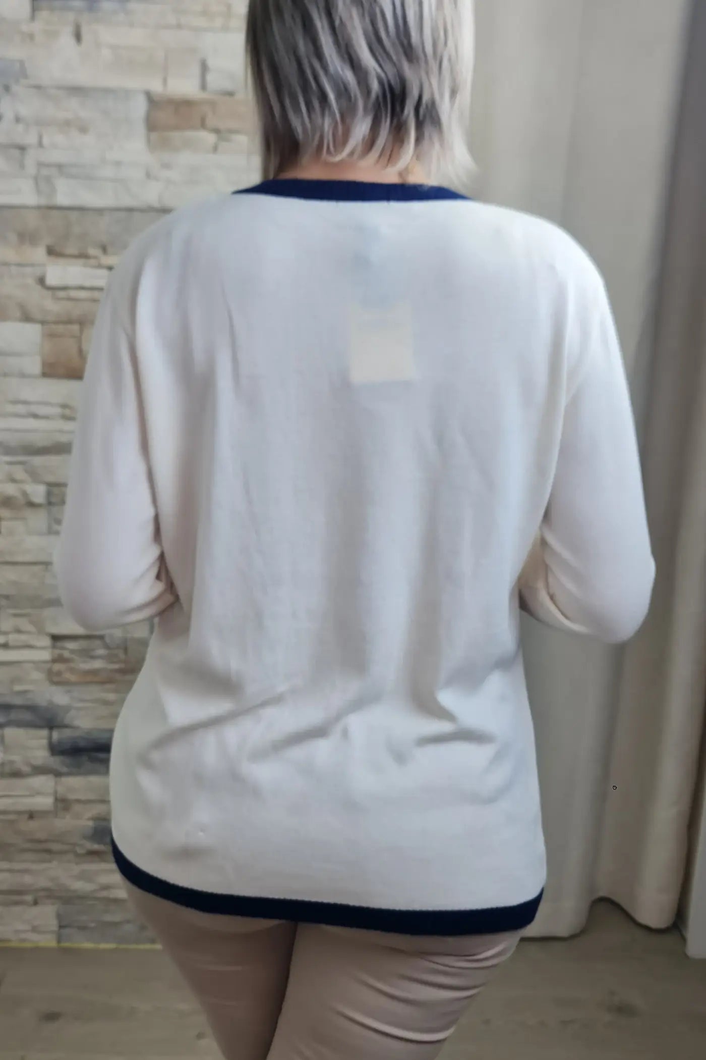 Ao vestir esta peça, sentirá o conforto da malha suave e leve, perfeita para a meia estação. A sua cor bege muito claro confere um visual clean e elegante, que é realçado pelos acabamentos em azul-marinho no decote, punhos e bainha, criando um contraste navy.