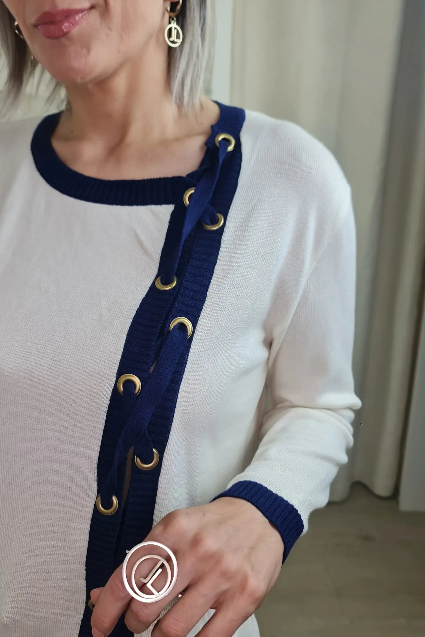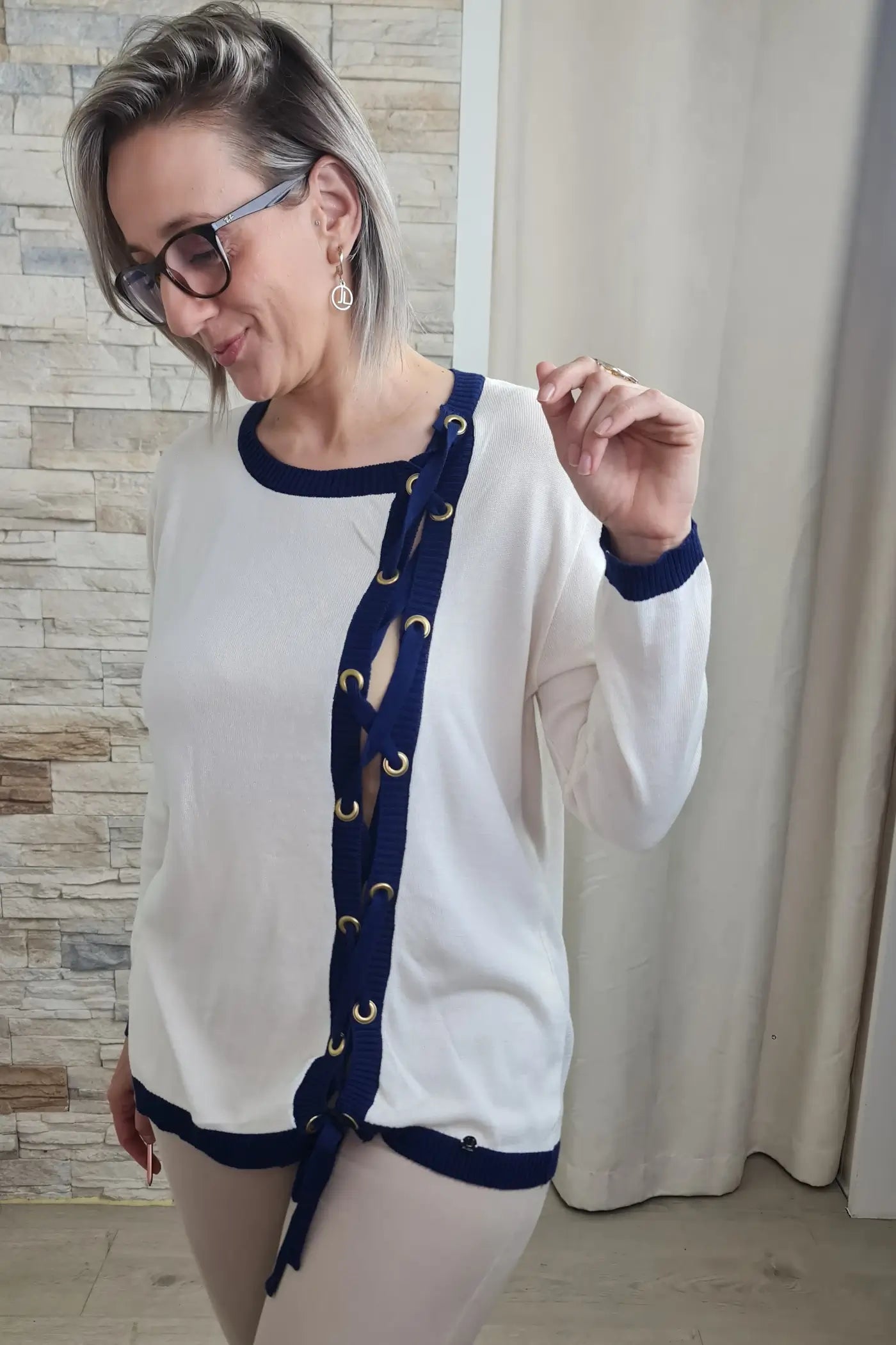 O Casaco "Laço Marinheiro" é a peça ideal para quem procura na moda uma forma de se expressar com autenticidade, misturando o conforto da malha com a ousadia dos ilhoses. Use-o por dentro de calças de cintura subida ou por cima de uma t-shirt justa para um look que irradia a sua luz por onde for.