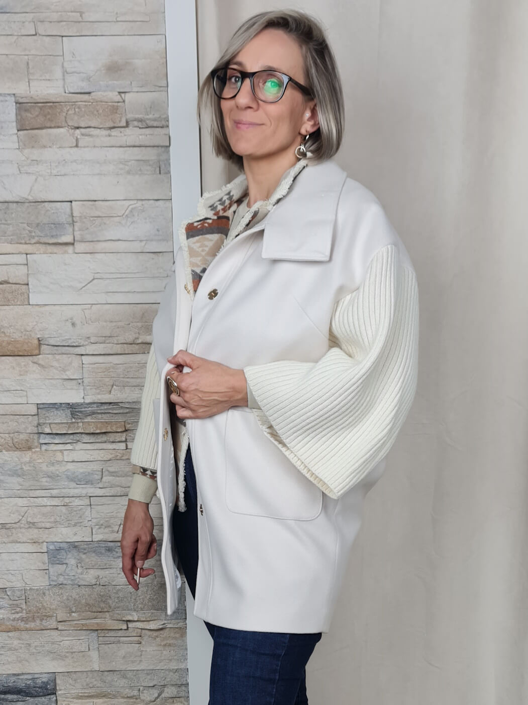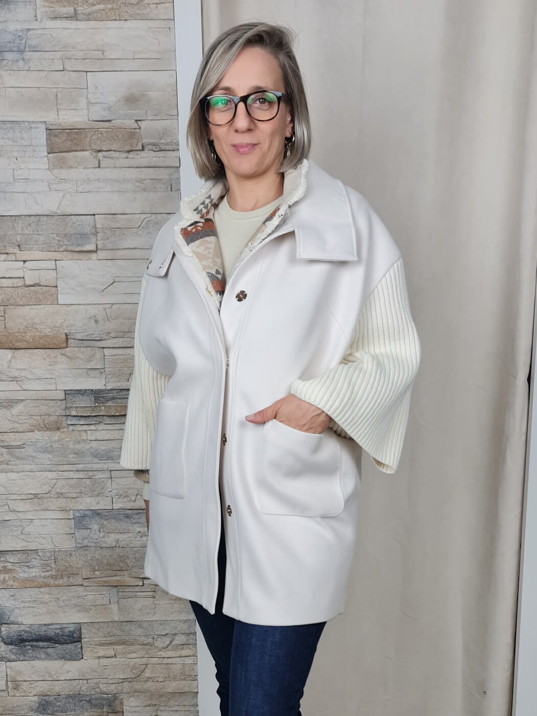 Casaco tecido liso de comprimento médio e gola. Possui bolsos de chapa, ombro descaído e manga 3/4 em malha. A frente do casaco aperta com molas douradas. O fitting da peça é solto.