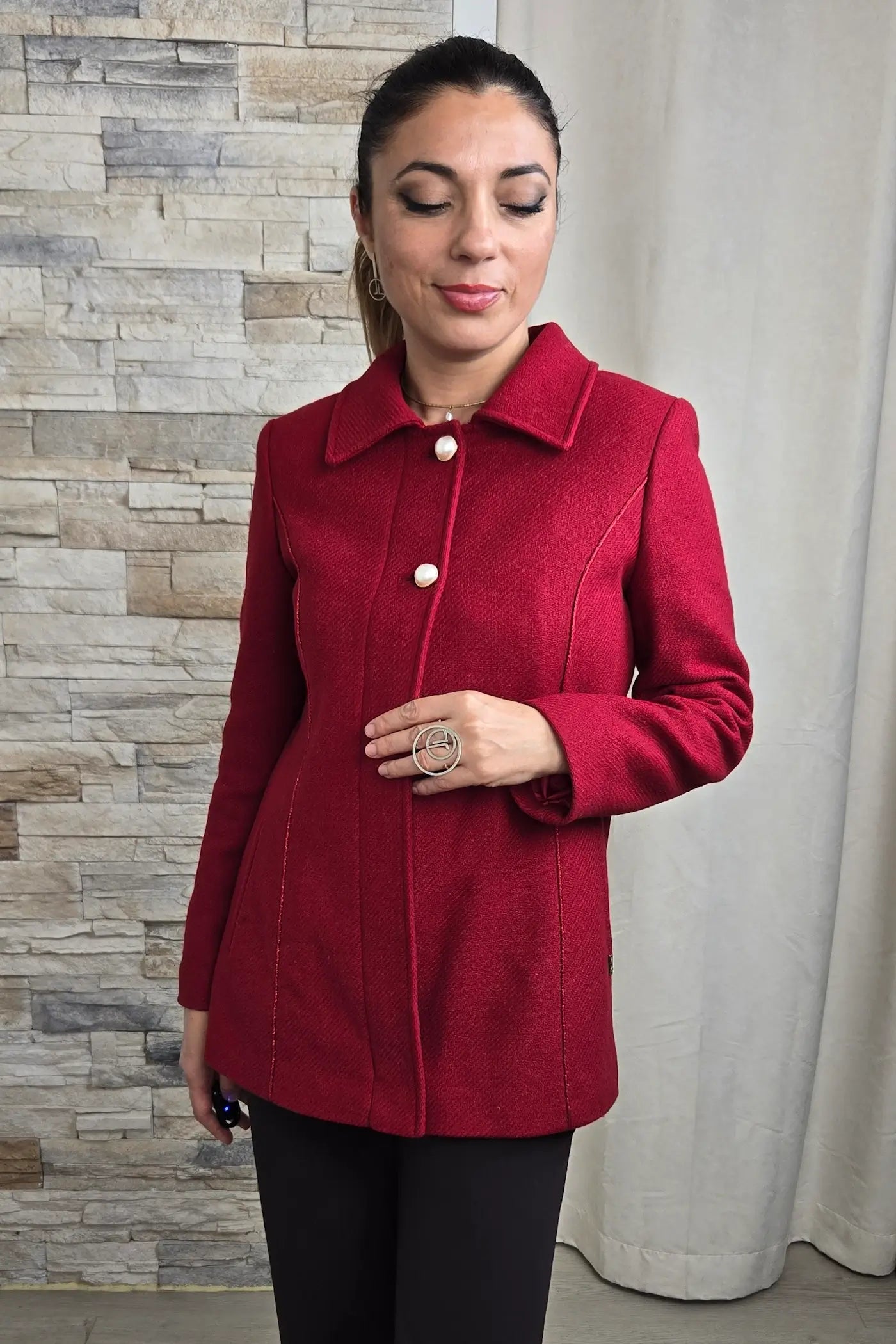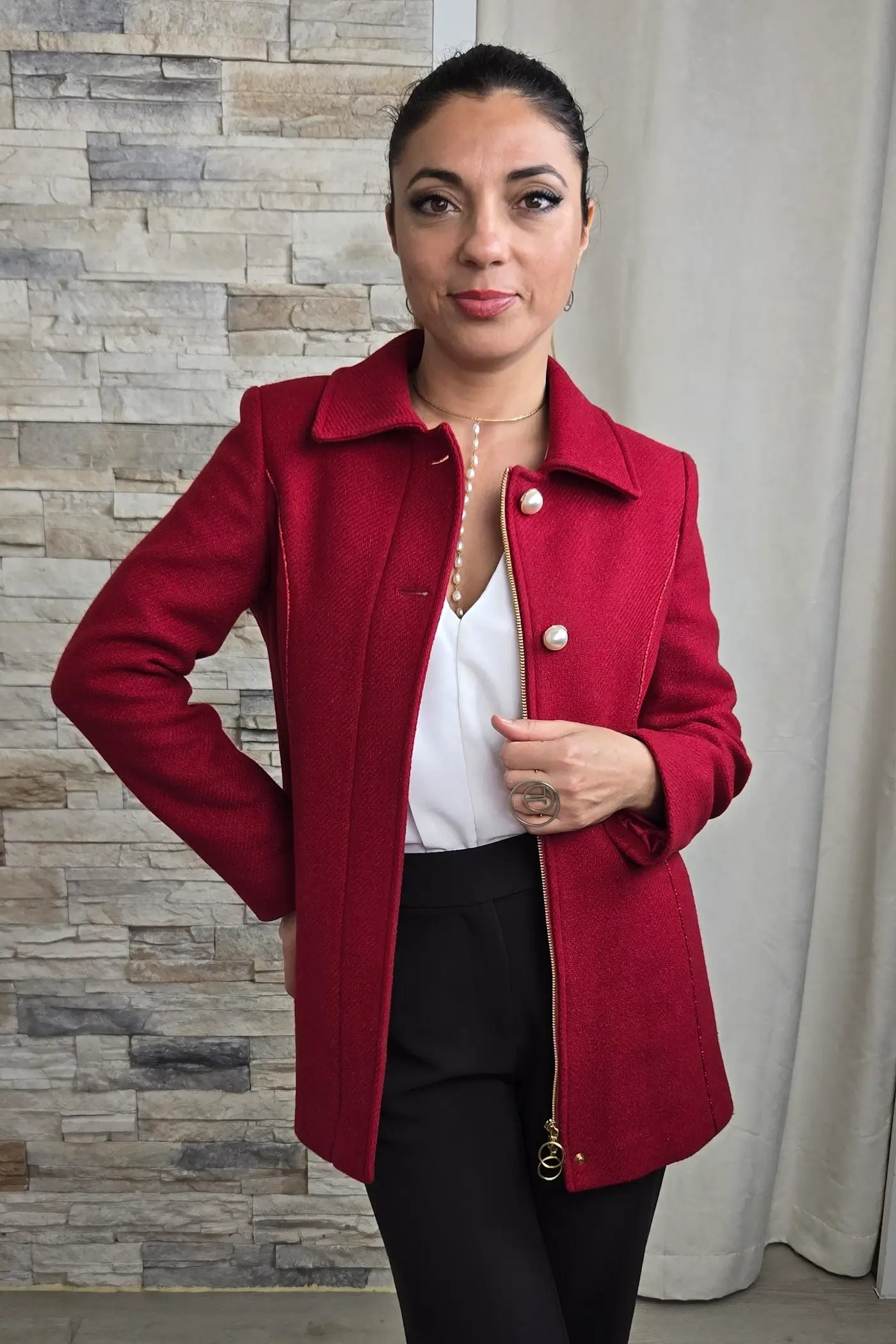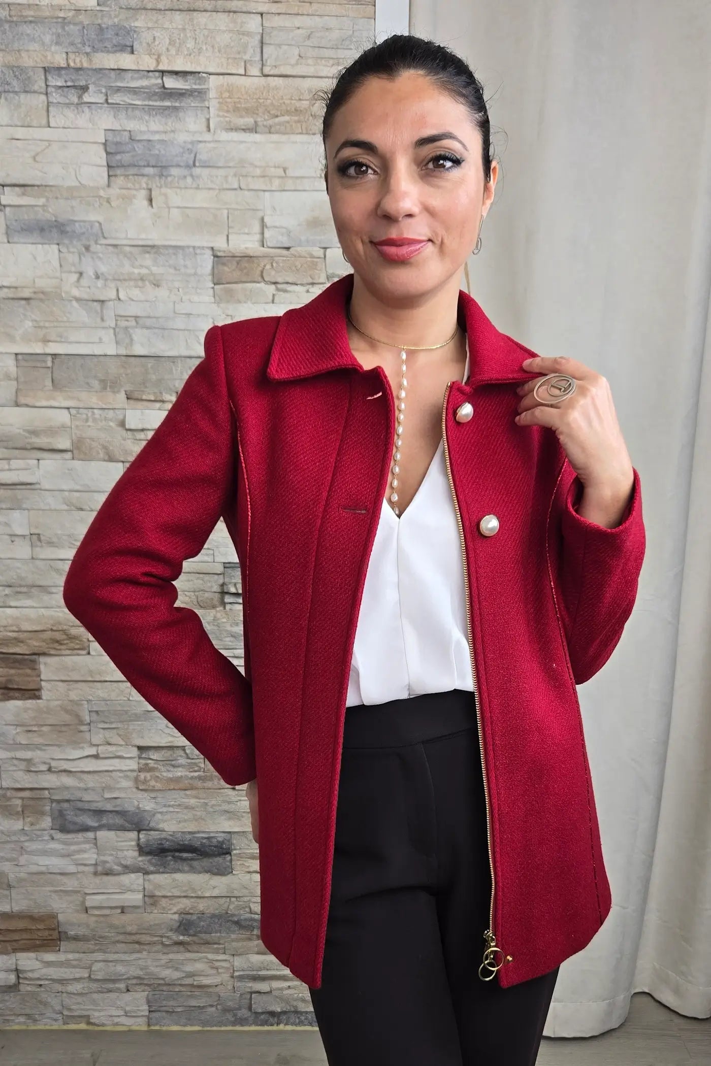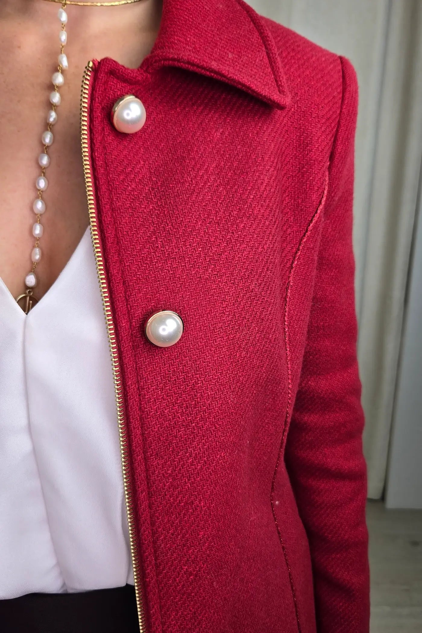 Quando a rotina do dia a dia tenta diminuir o seu valor, o Casaco Curto "Diva Escarlate" é a sua aliada. Esta peça foi criada para ser a sua ferramenta de transformação, adicionando um toque de ousadia, elegância clássica e glamour à sua vida diária.