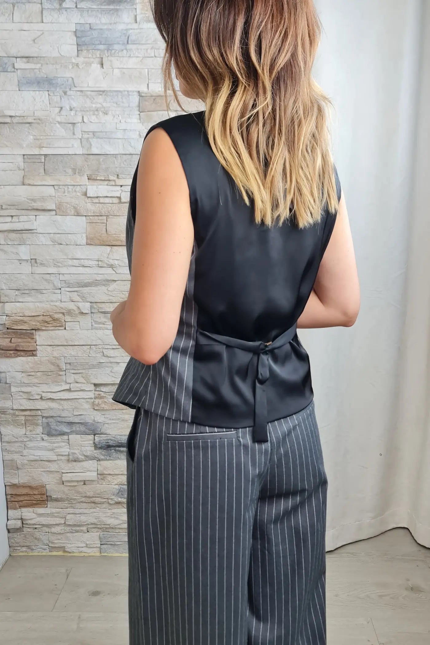 Este colete não é apenas uma peça de vestuário; é uma afirmação do seu bom gosto e da sua capacidade de se sentir poderosa e elegante, seja para um compromisso profissional, um encontro casual ou para elevar o seu visual diário. Combine-o com o blazer e a calça a condizer para um look executivo imbatível, ou use-o sobre uma blusa simples para um toque de estilo.