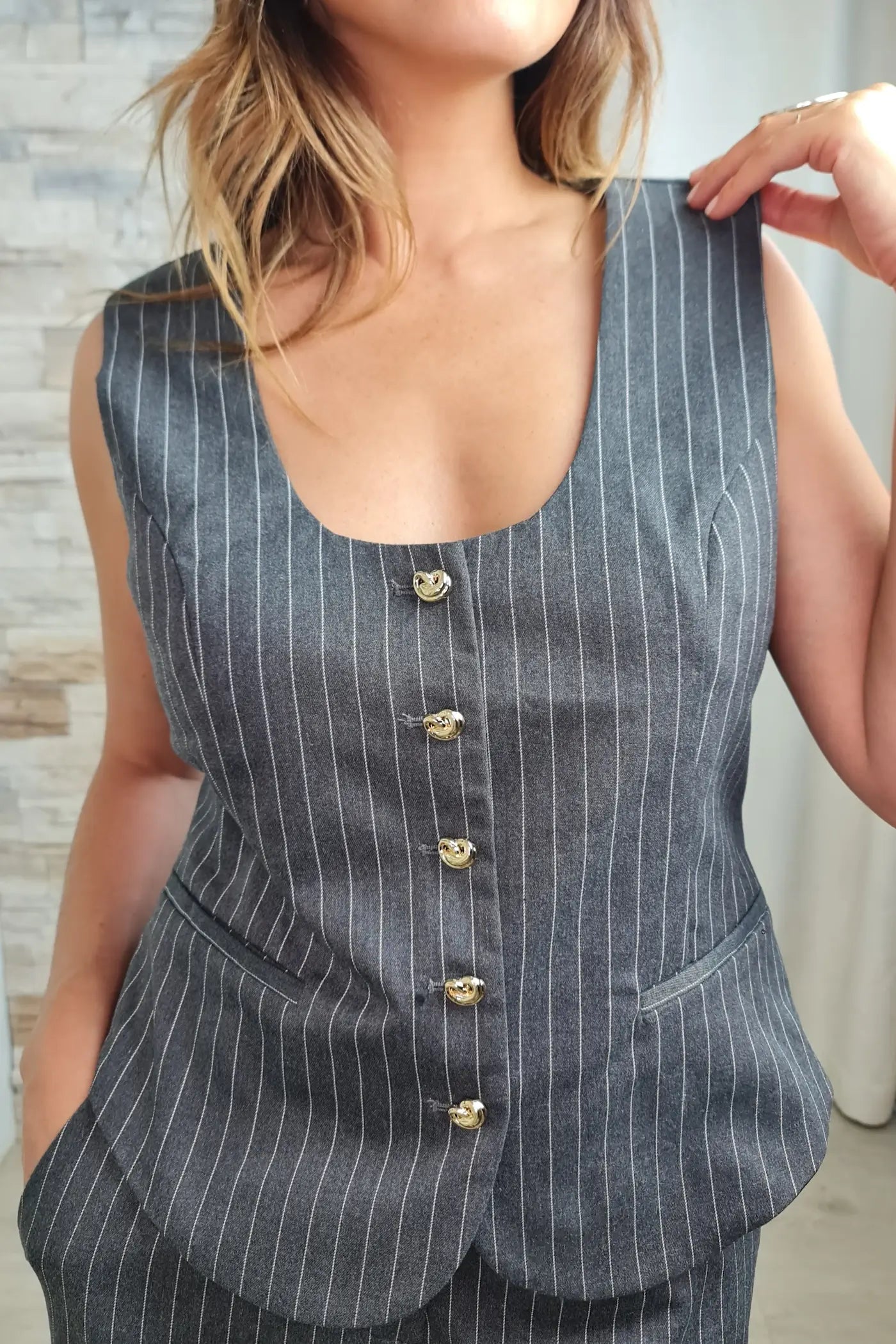 Ao vestir este colete, sentirá a força e a sofisticação da cor cinzenta, que evoca o profissionalismo e a determinação, proporcionando uma sensação de controlo e confiança. As riscas de giz finas bege não são apenas um padrão clássico; são uma afirmação da sua capacidade de se destacar com subtileza e requinte. O seu corte ajustado e elegante é perfeitamente complementado pelos botões dourados de destaque, que adicionam um toque de luxo e personalidade.