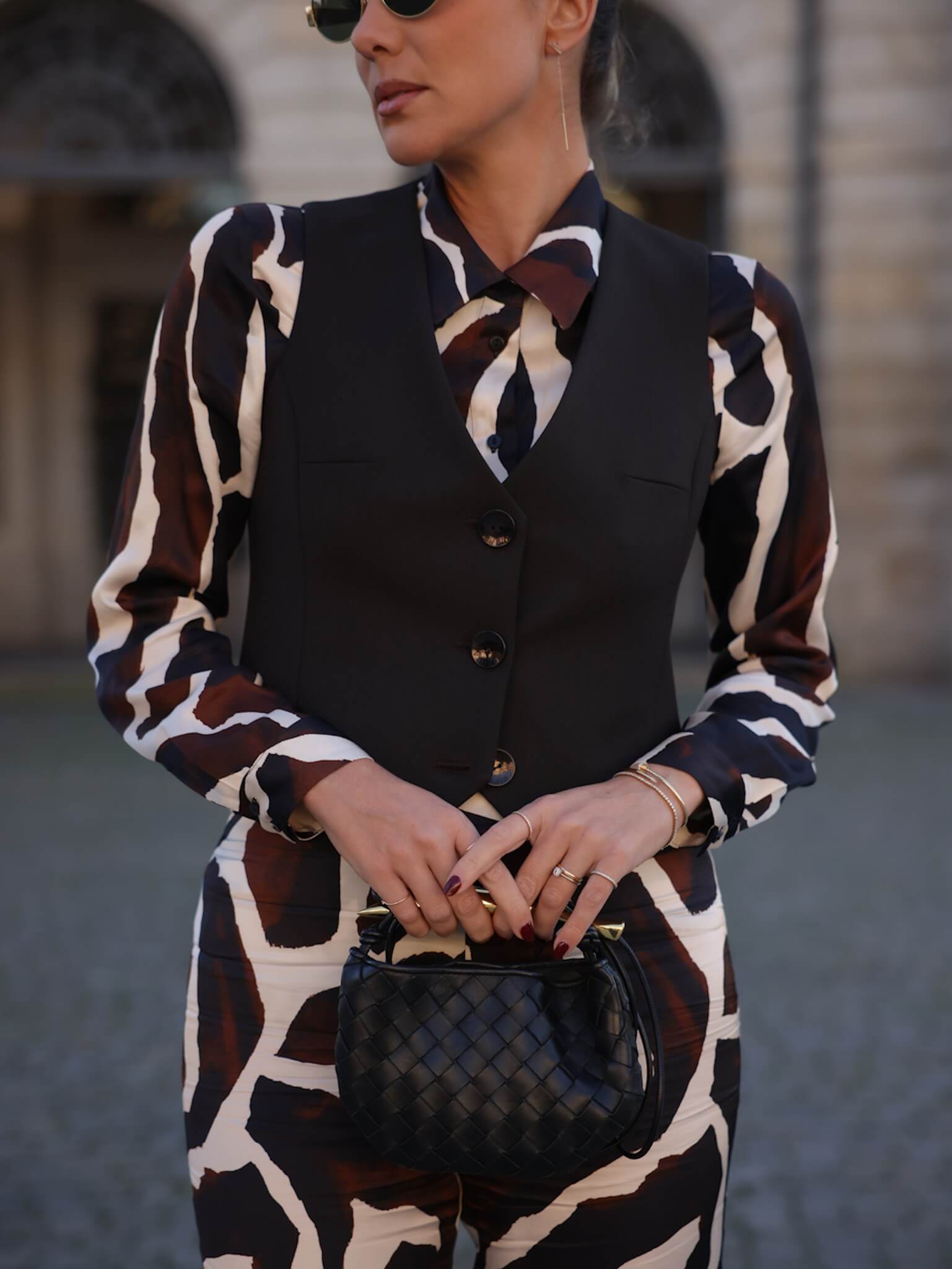Este colete foi pensado para momentos em que você procure conforto, destaque e uma injeção de estilo atemporal. Perfeito para um visual de trabalho elegante, um evento casual ou para adicionar um toque de inspiração e autenticidade ao seu quotidiano.