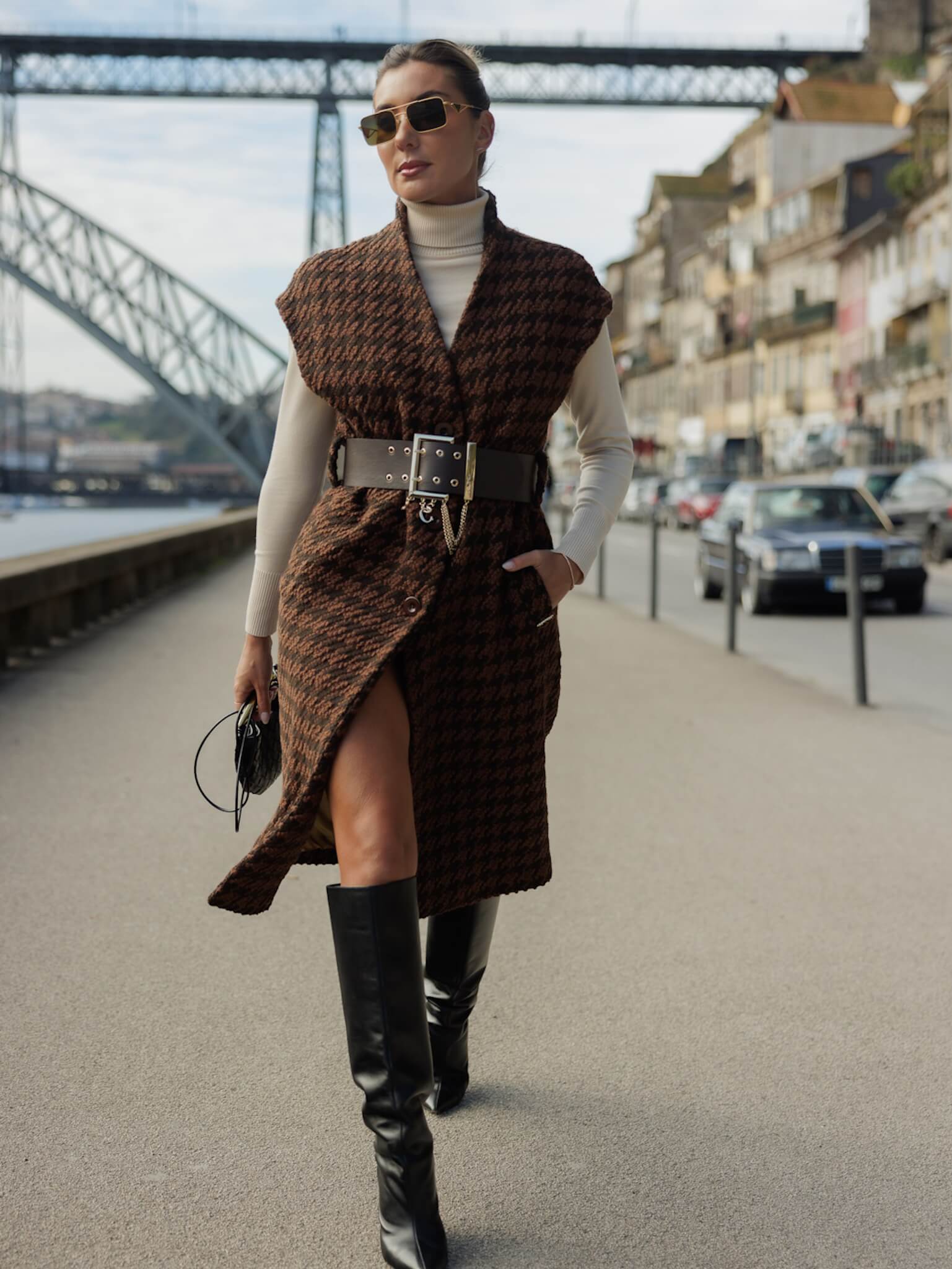 Ao vestir o "Glamour Sofisticado", sentirá uma sensação de conforto e um toque de requinte. O tecido estruturado e o caimento alongado proporcionam bem-estar e a convidam a expressar a sua personalidade marcante.