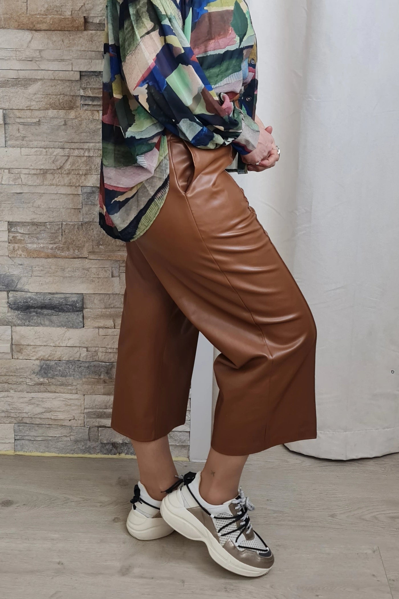 As cullotes exibidas são de polipele, com um acabamento liso e um leve brilho. Apresentam um corte direito e amplo, terminando abaixo do joelho, na altura da barriga da perna. Possuem cintura subida e um fecho frontal que não está totalmente visível. Há detalhes de costuras verticais ao longo das pernas, tanto na frente quanto atrás, que ajudam a estruturar a peça.