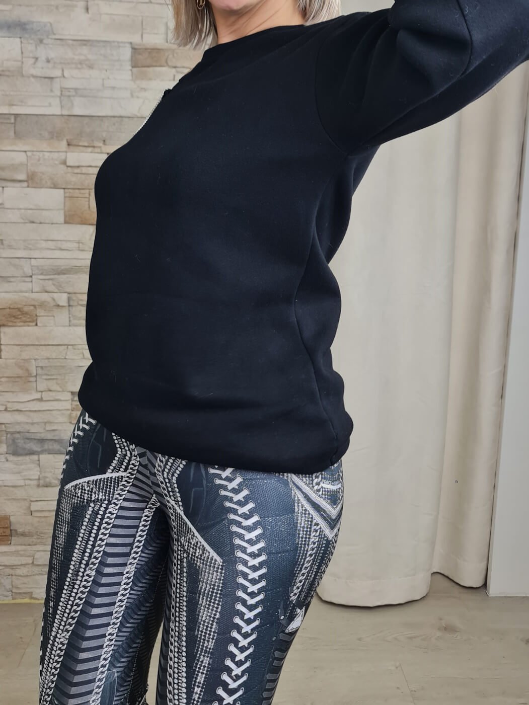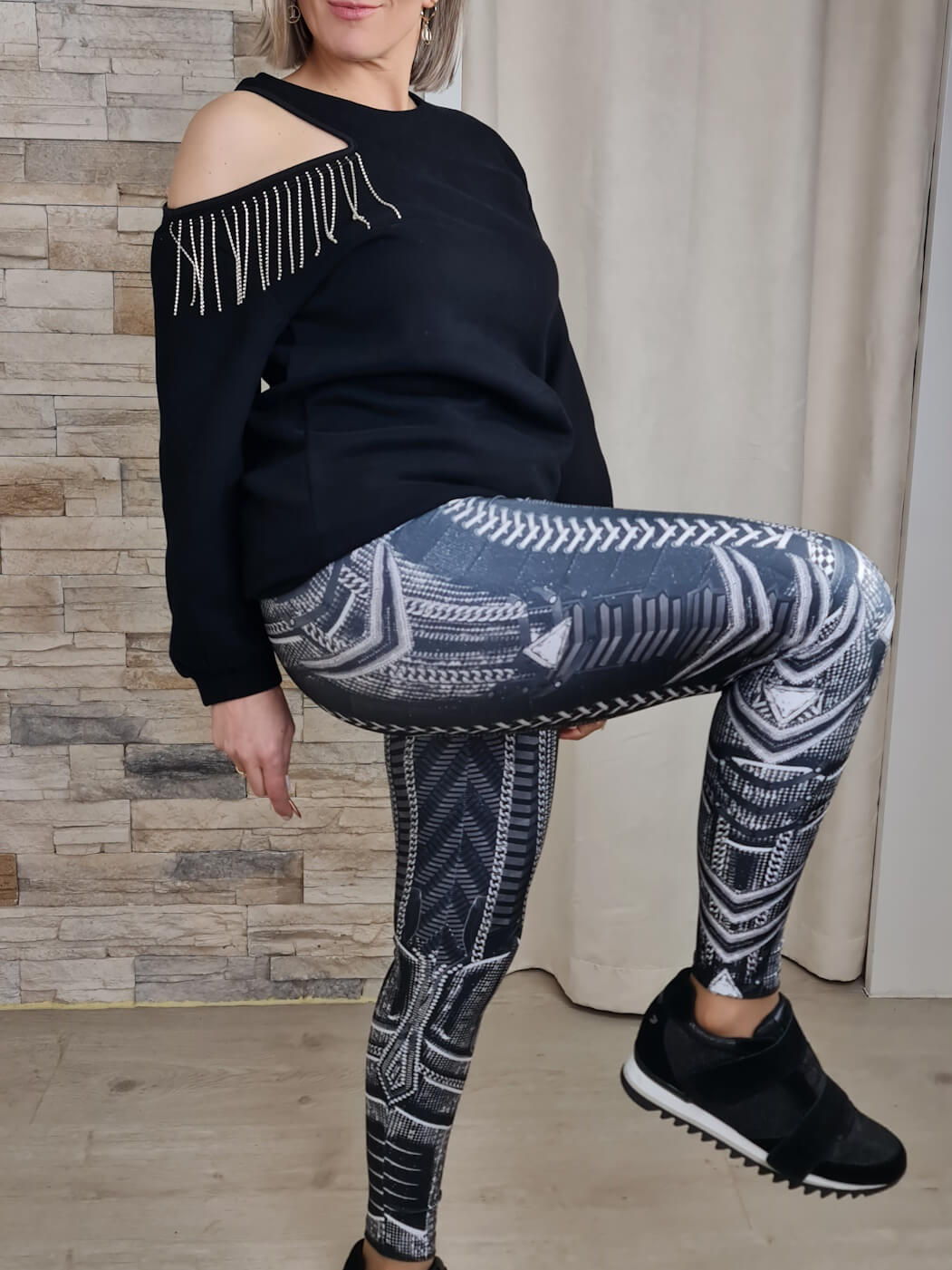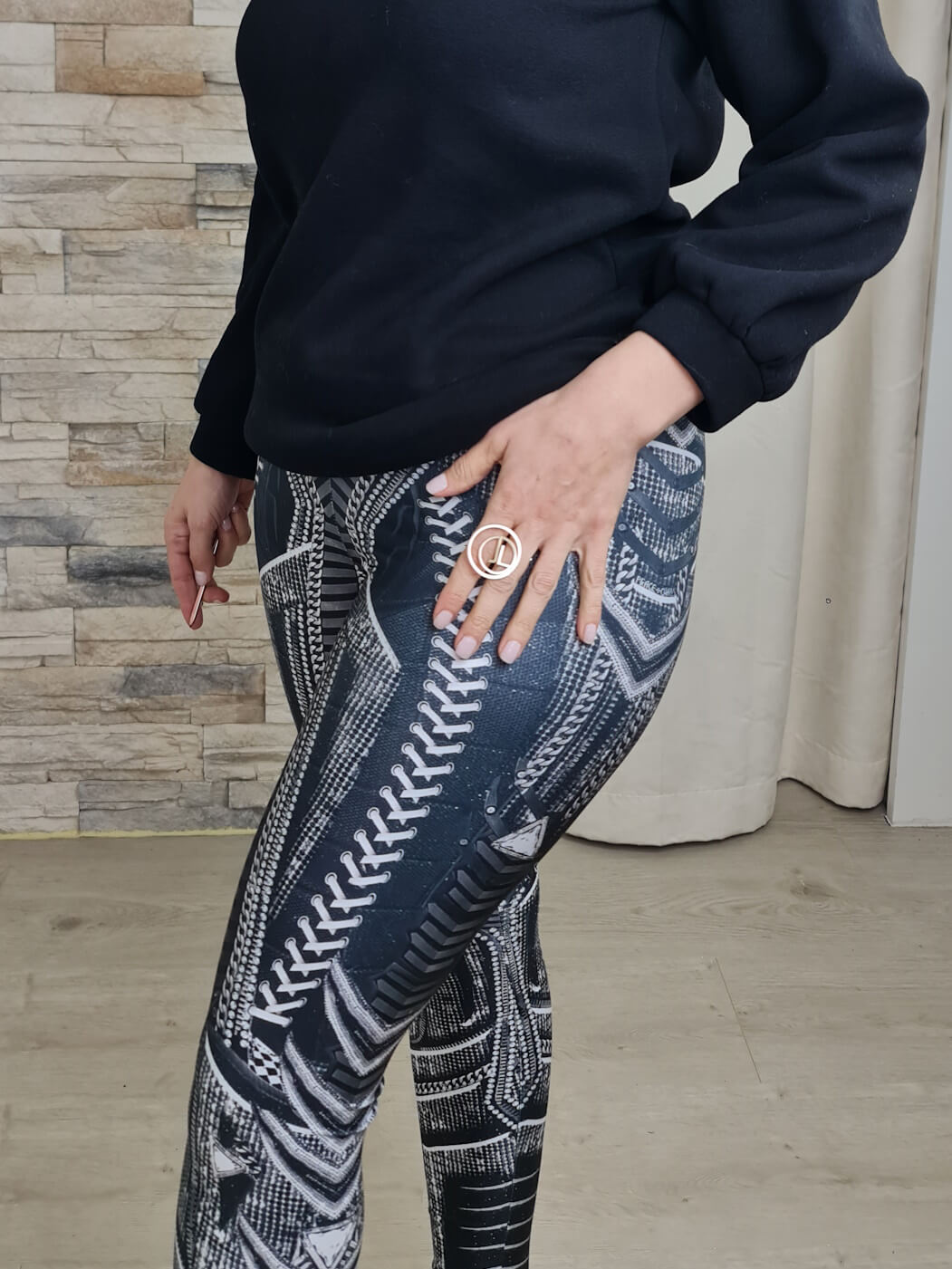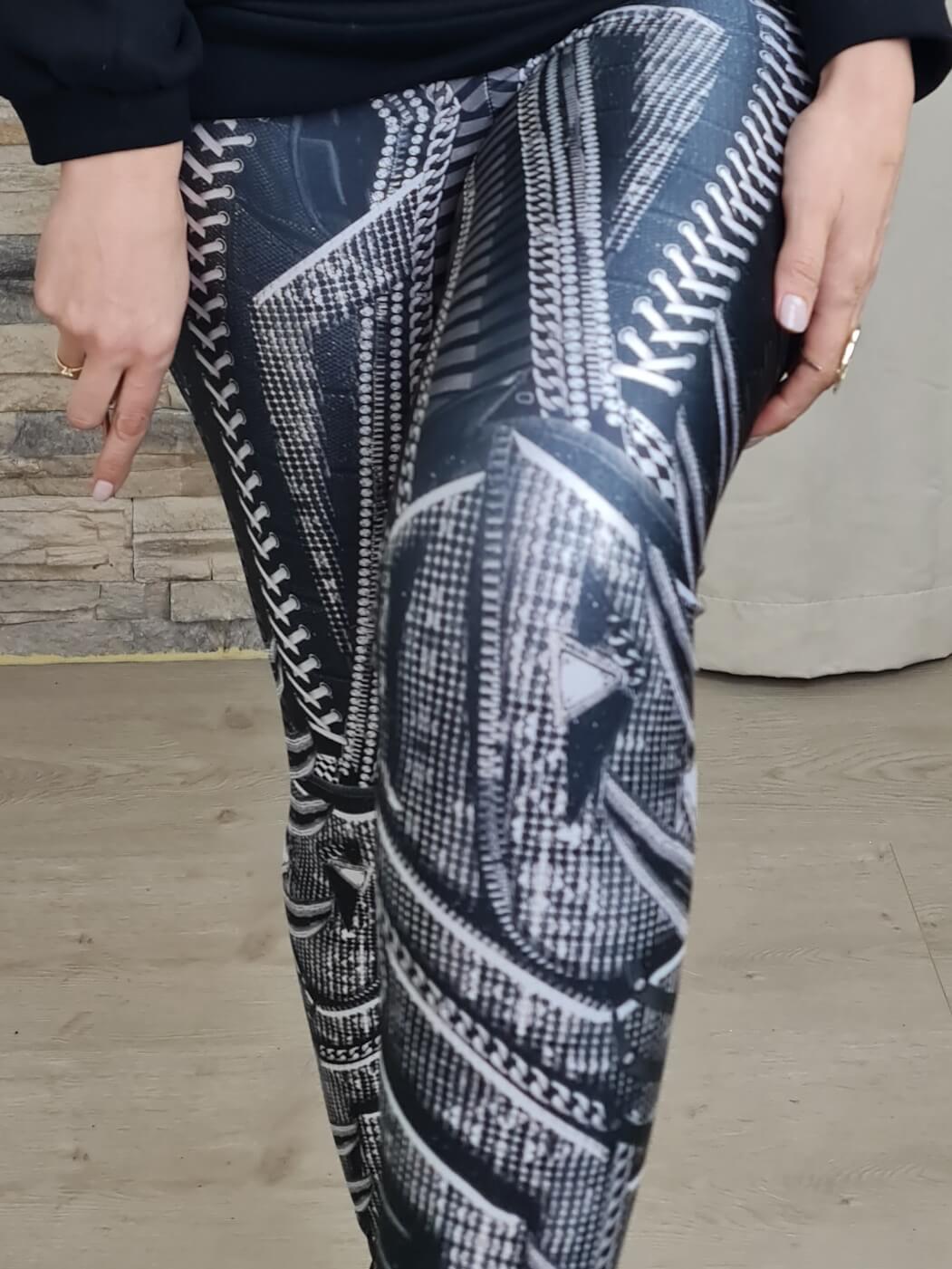 As leggings em destaque na imagem apresentam um design moderno e arrojado, com um padrão geométrico em tons de preto, branco e cinza. O padrão cria um efeito visual interessante, com linhas e formas que se entrelaçam, dando um toque de originalidade à peça.