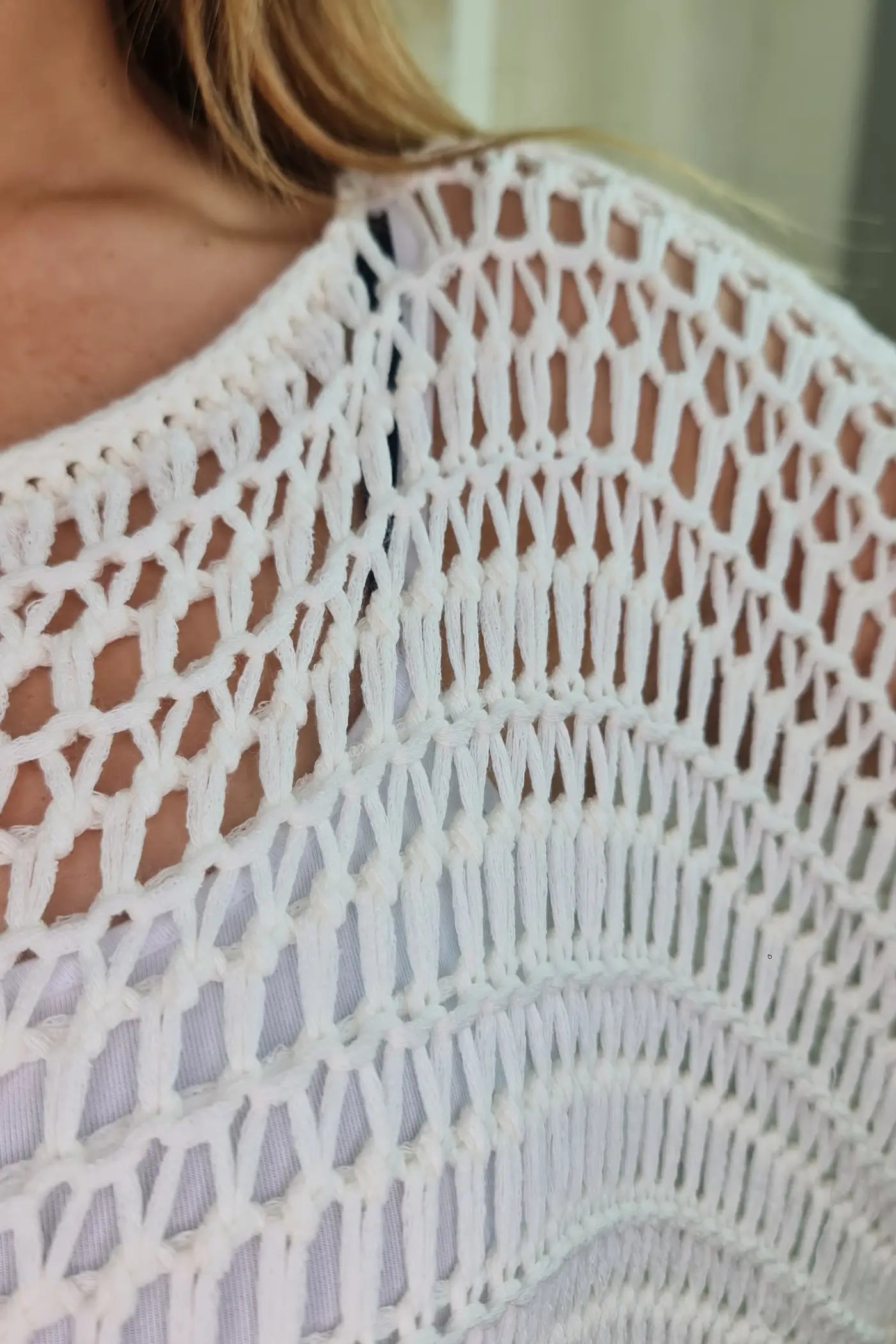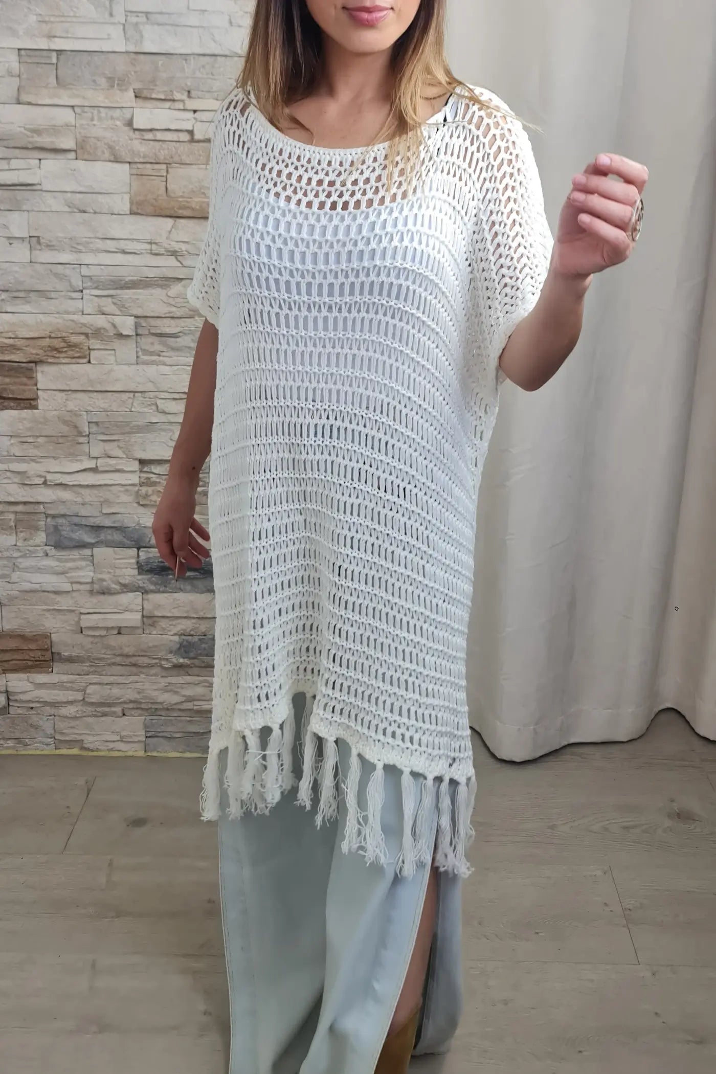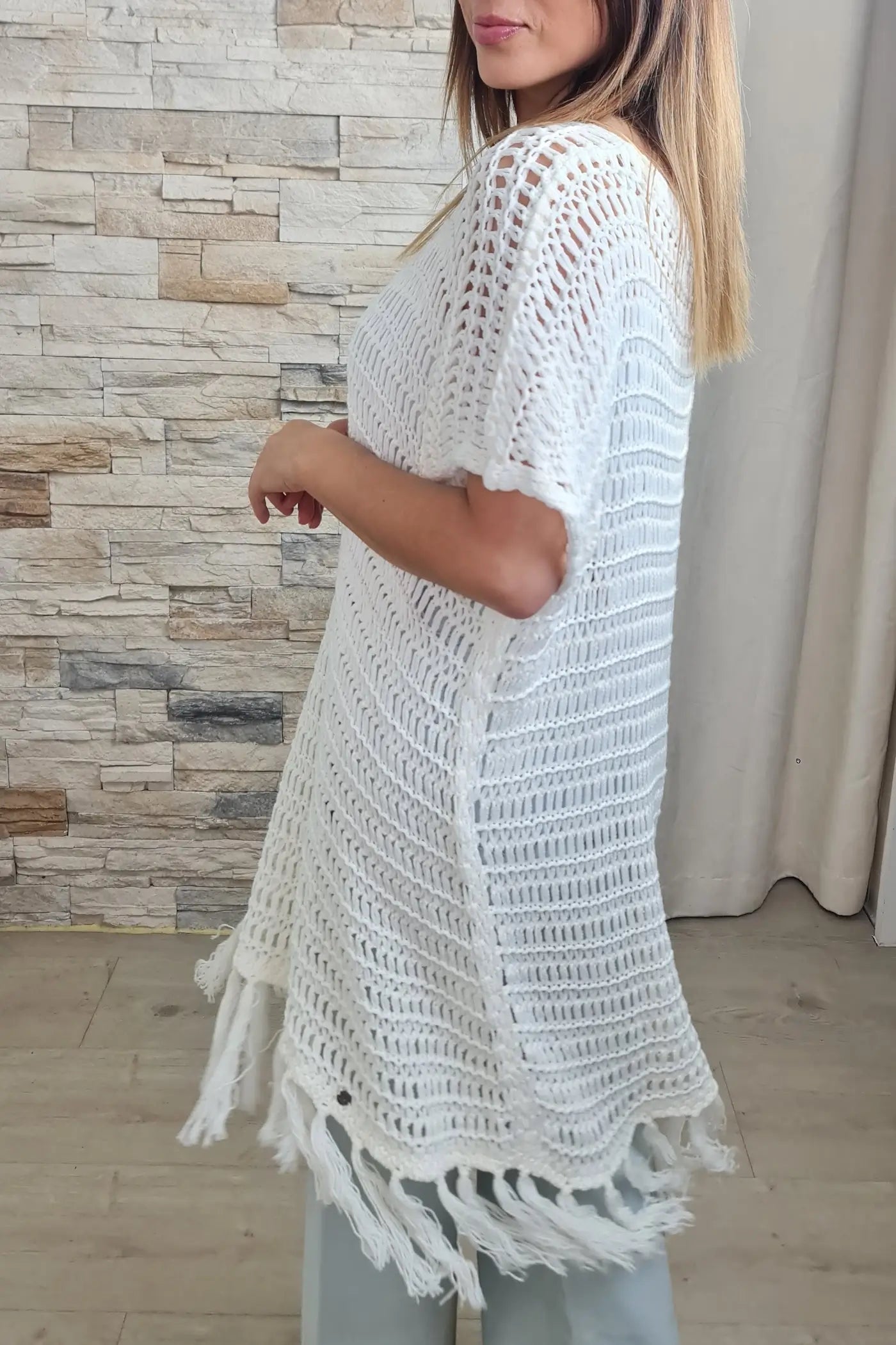 Ao vestir este poncho, sentirá a leveza e a fluidez da malha de algodão, perfeita para sobreposições. A sua cor branca é intemporal, evocando a serenidade e a versatilidade. O corte oversized com mangas curtas e fit folgado confere um visual relaxado, ideal para o estilo de verão ou para momentos de descontração.