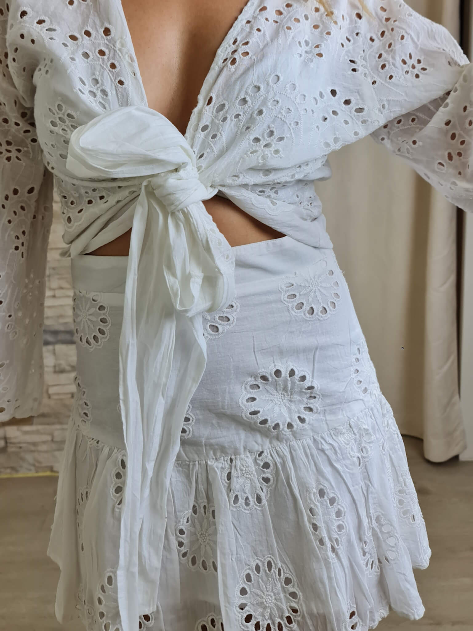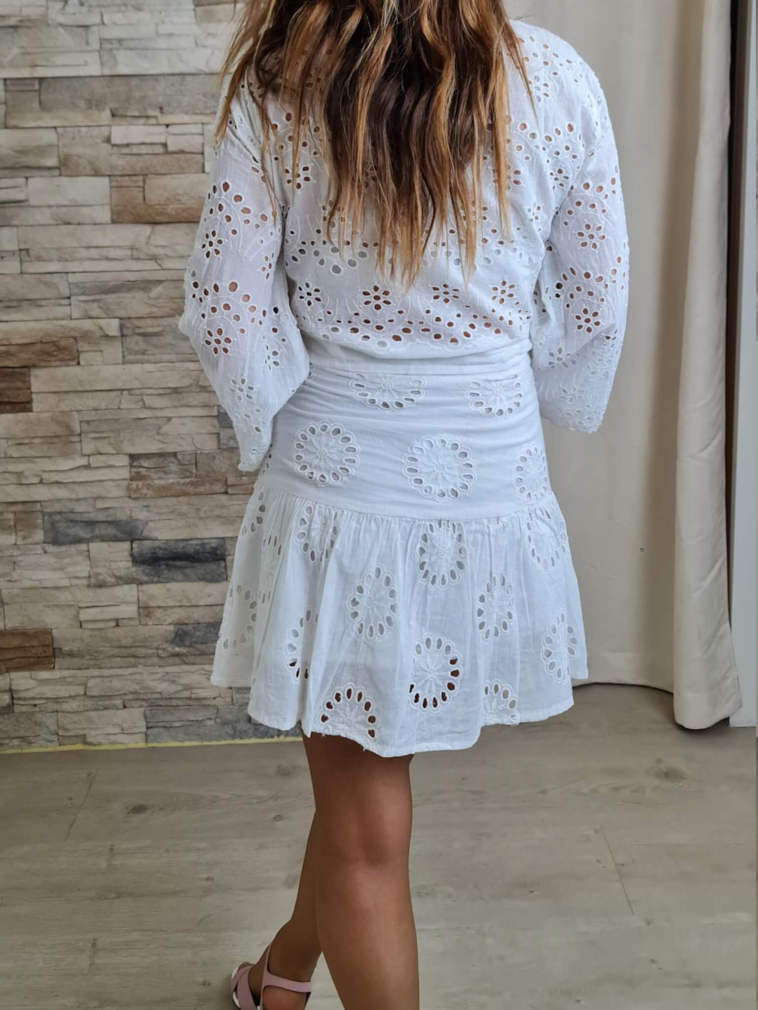 O design é uma fusão de clássico e moderno. Com cintura subida e comprimento acima do joelho, destaca-se pela cor branca pura e o bordado inglês com padrões florais, que adicionam um toque de romantismo e frescura.