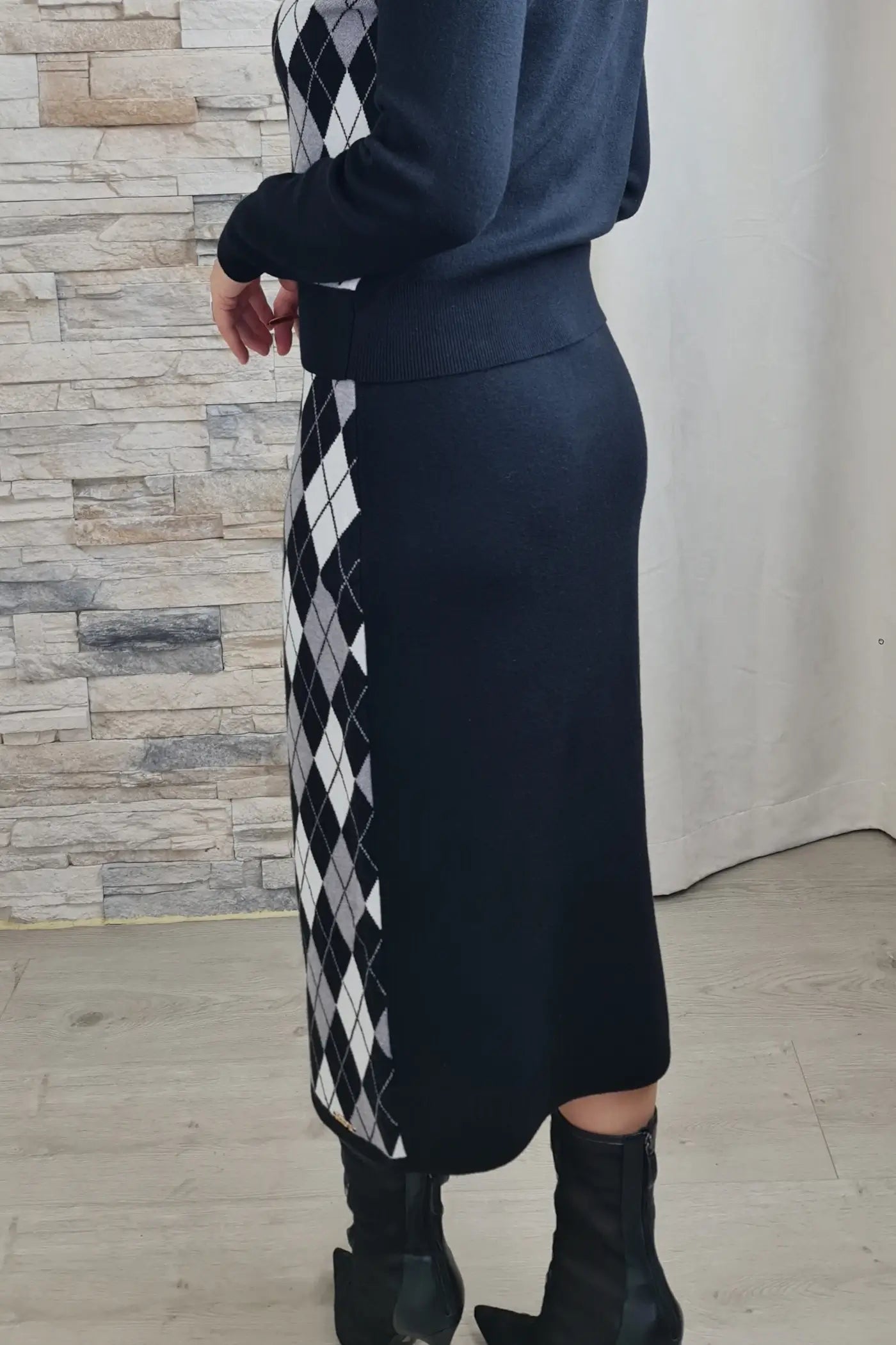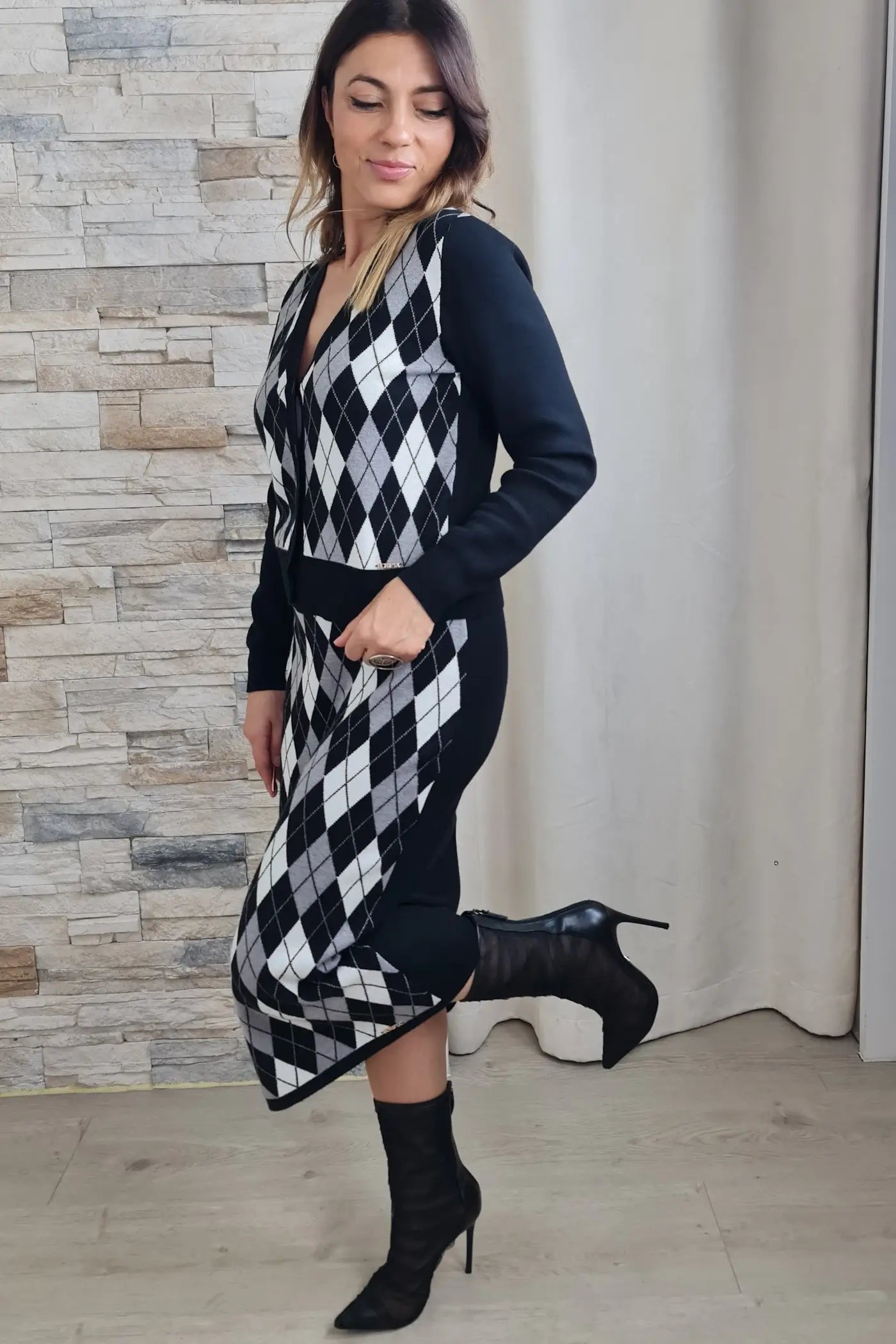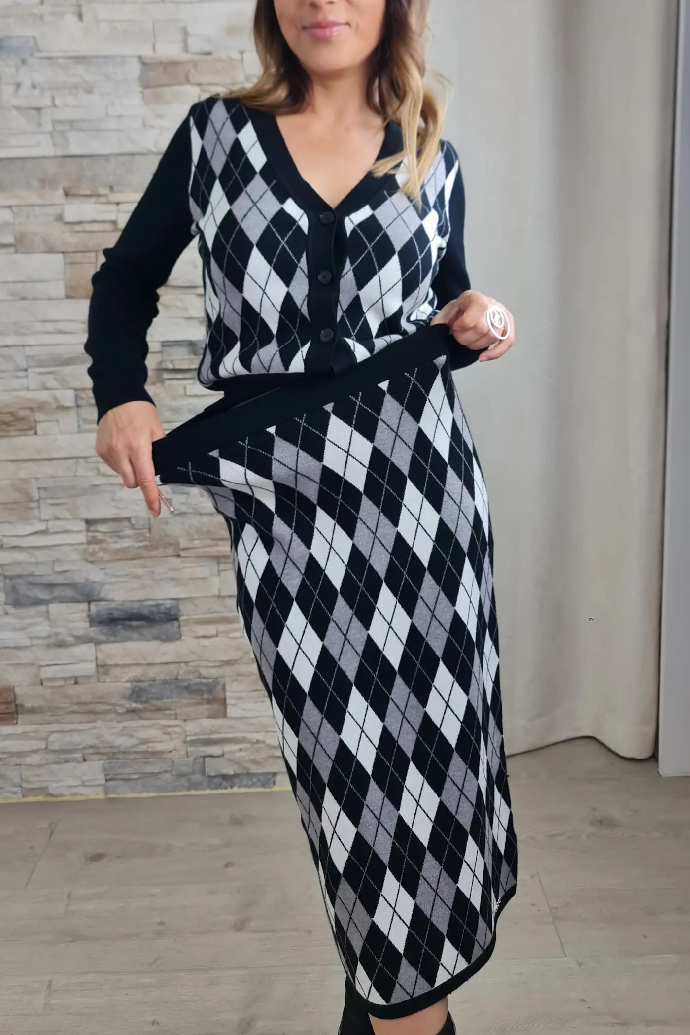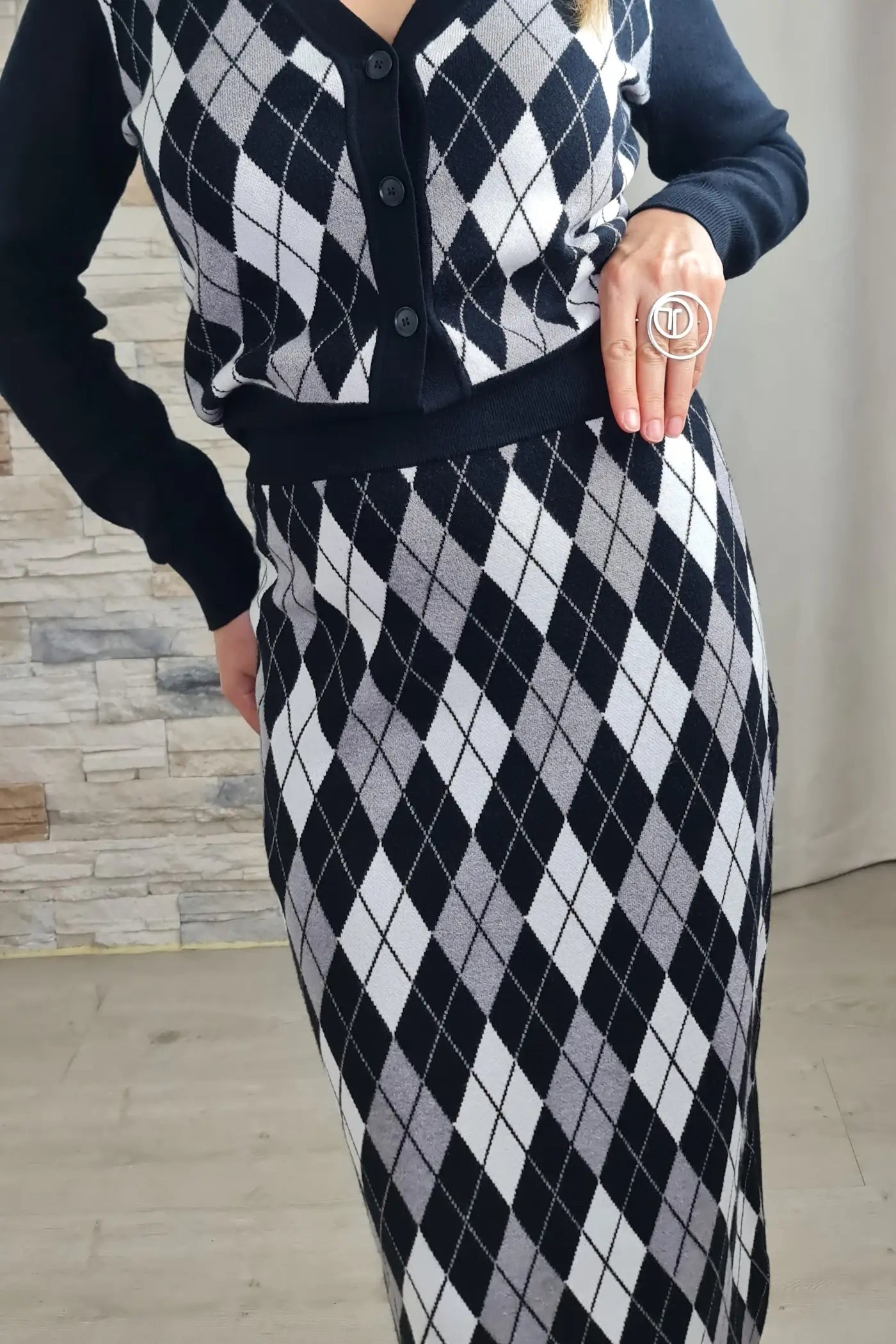 Ao vestir esta saia, sentirá o conforto e a suavidade do tecido que envolve o corpo, proporcionando uma sensação de bem-estar imediato. O seu padrão clássico de losangos em preto, branco e cinzento transmite uma elegância intemporal, evocando um estilo que é simultaneamente sofisticado e versátil. O seu corte ajustado, com a cintura marcada e o comprimento midi, confere um visual elegante e confiante, sem comprometer o conforto.
