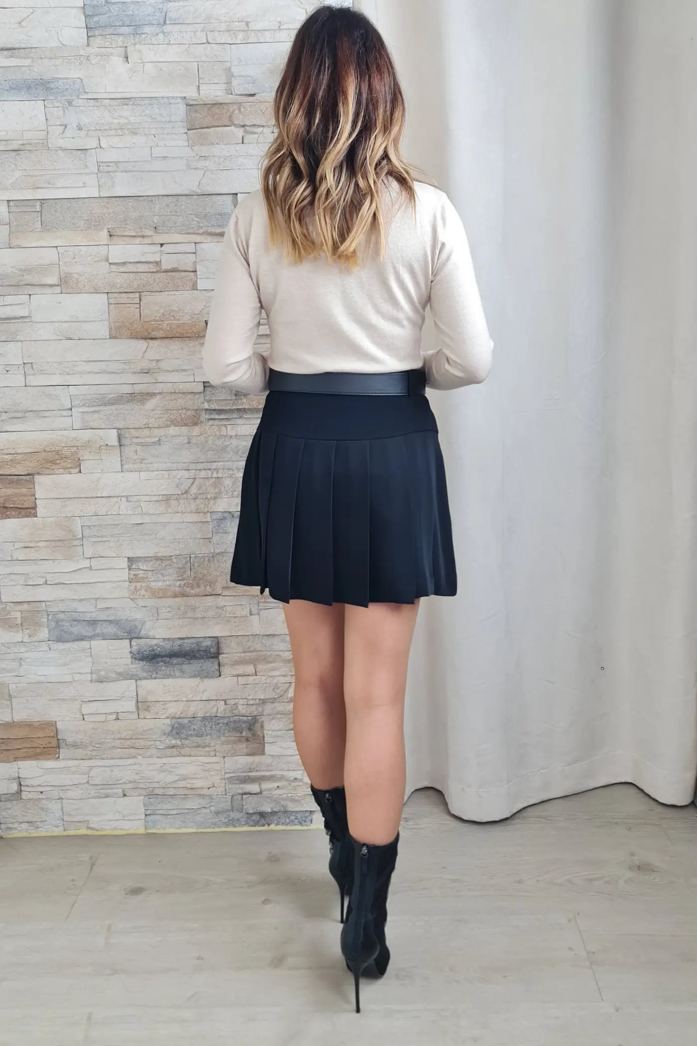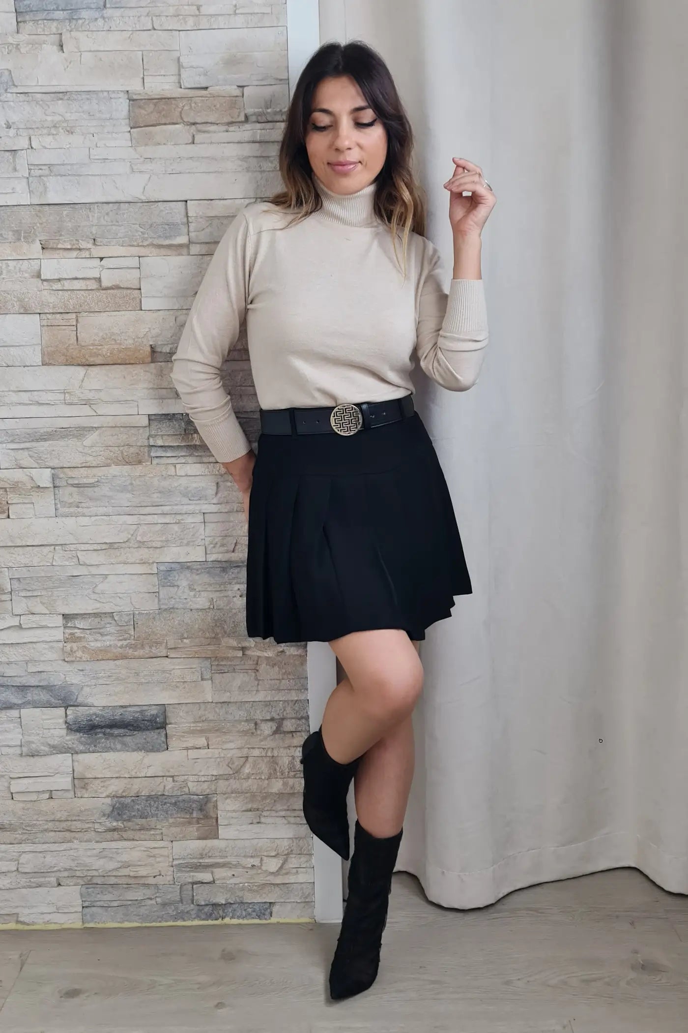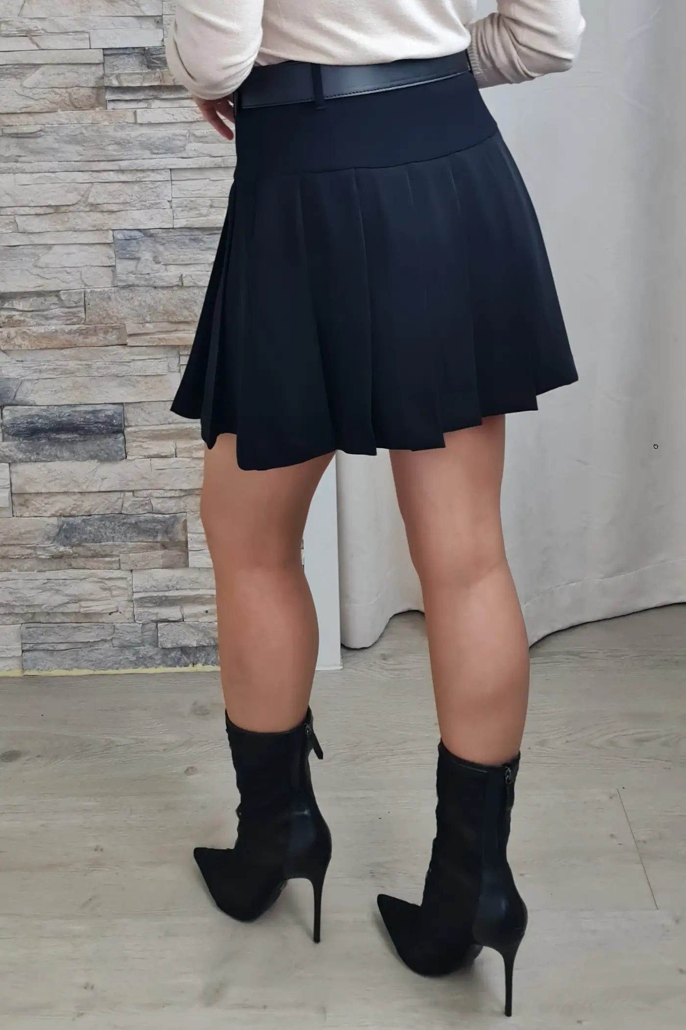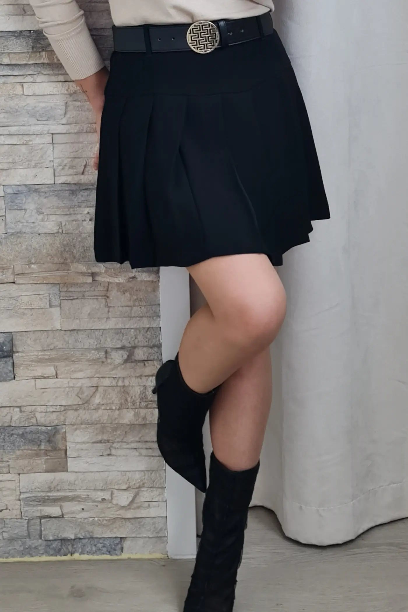 Ao vestir esta saia, sentirá o tecido leve e fluído a mover-se com elegância, proporcionando uma sensação de liberdade e alegria. A sua cor preta intensa é mais do que um tom; é uma afirmação de poder e sofisticação intemporal. O corte curto, com pregas delicadas e o cinto no mesmo tom com uma fivela dourada, confere um visual único e expressivo, convidando-a a abraçar a sua confiança e a mostrar a sua luz interior.