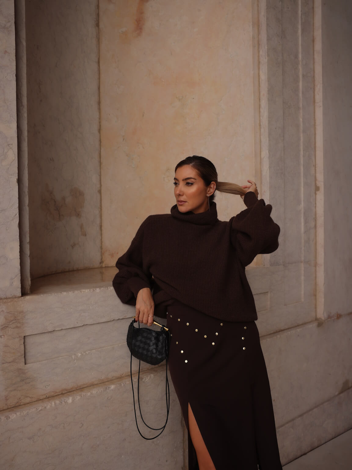 O design é clássico com um toque moderno. Em tom castanho escuro, destaca-se pelas tachas douradas aplicadas em padrão na parte frontal, adicionando um detalhe refinado e único. A fenda lateral confere um toque sensual e permite liberdade de movimento.
