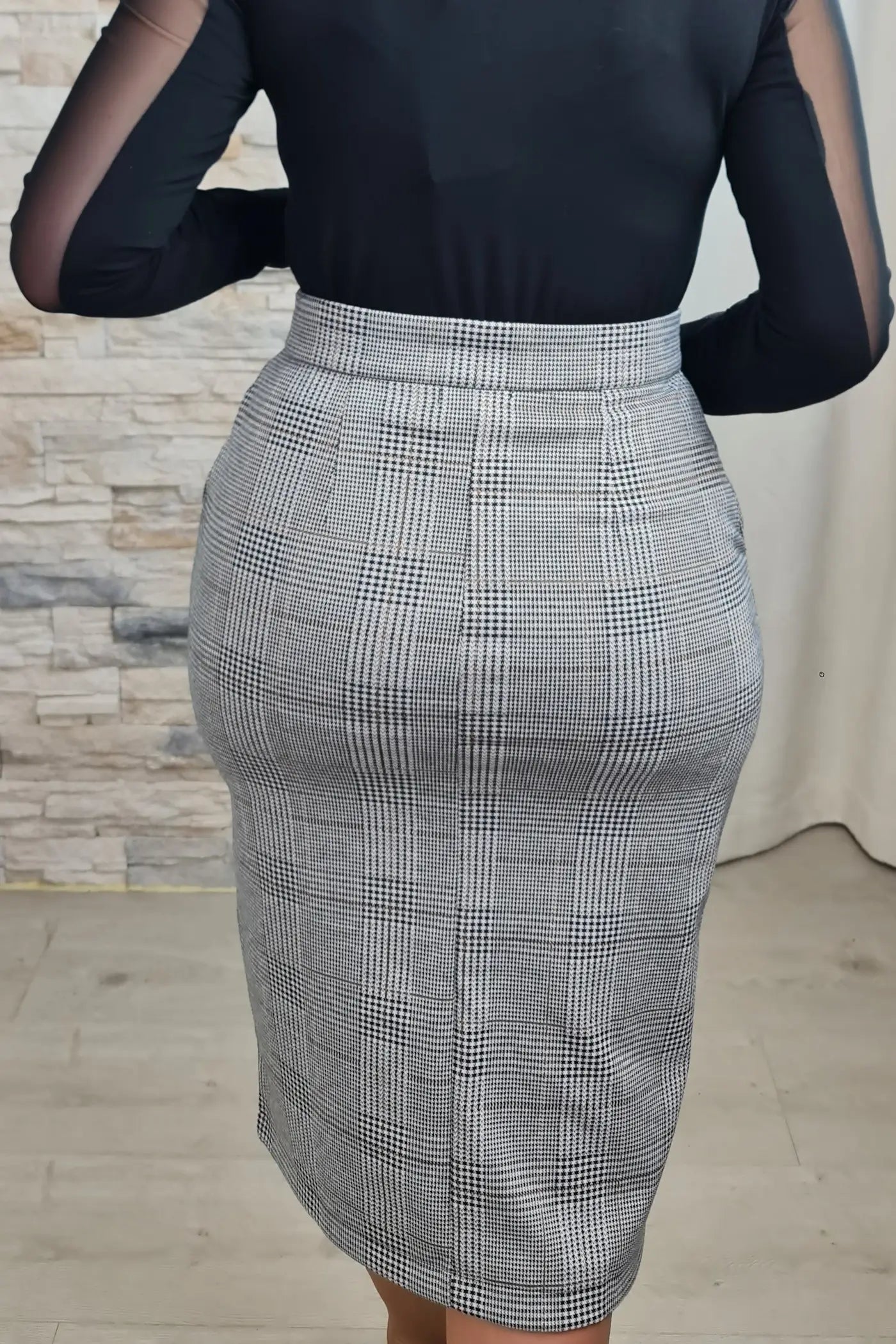Ao vestir esta saia, sentirá o conforto e a estrutura do tecido que se molda elegantemente ao corpo. O seu padrão clássico em xadrez (em tons de cinzento, preto e branco) evoca uma sofisticação intemporal, tornando-a uma peça statement no seu guarda-roupa. O corte midi (pelo joelho) tipo tubo e a cintura alta valorizam a silhueta, enquanto a fila de botões frontais no mesmo tom e os bolsos laterais adicionam um charme funcional e um toque de originalidade, convidando-a a expressar a sua personalidade de forma autêntica e descomplicada.