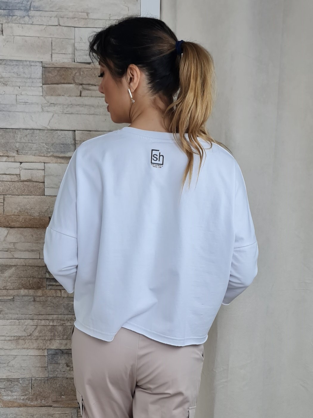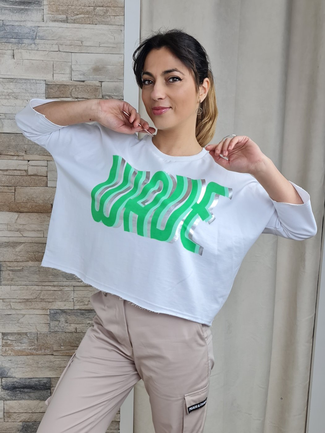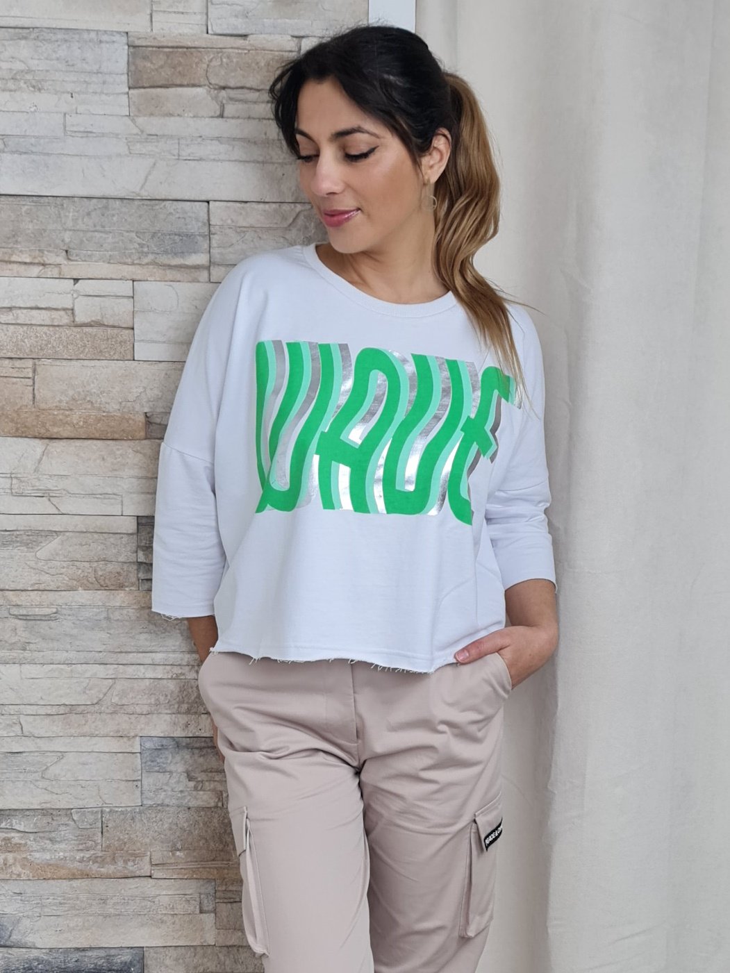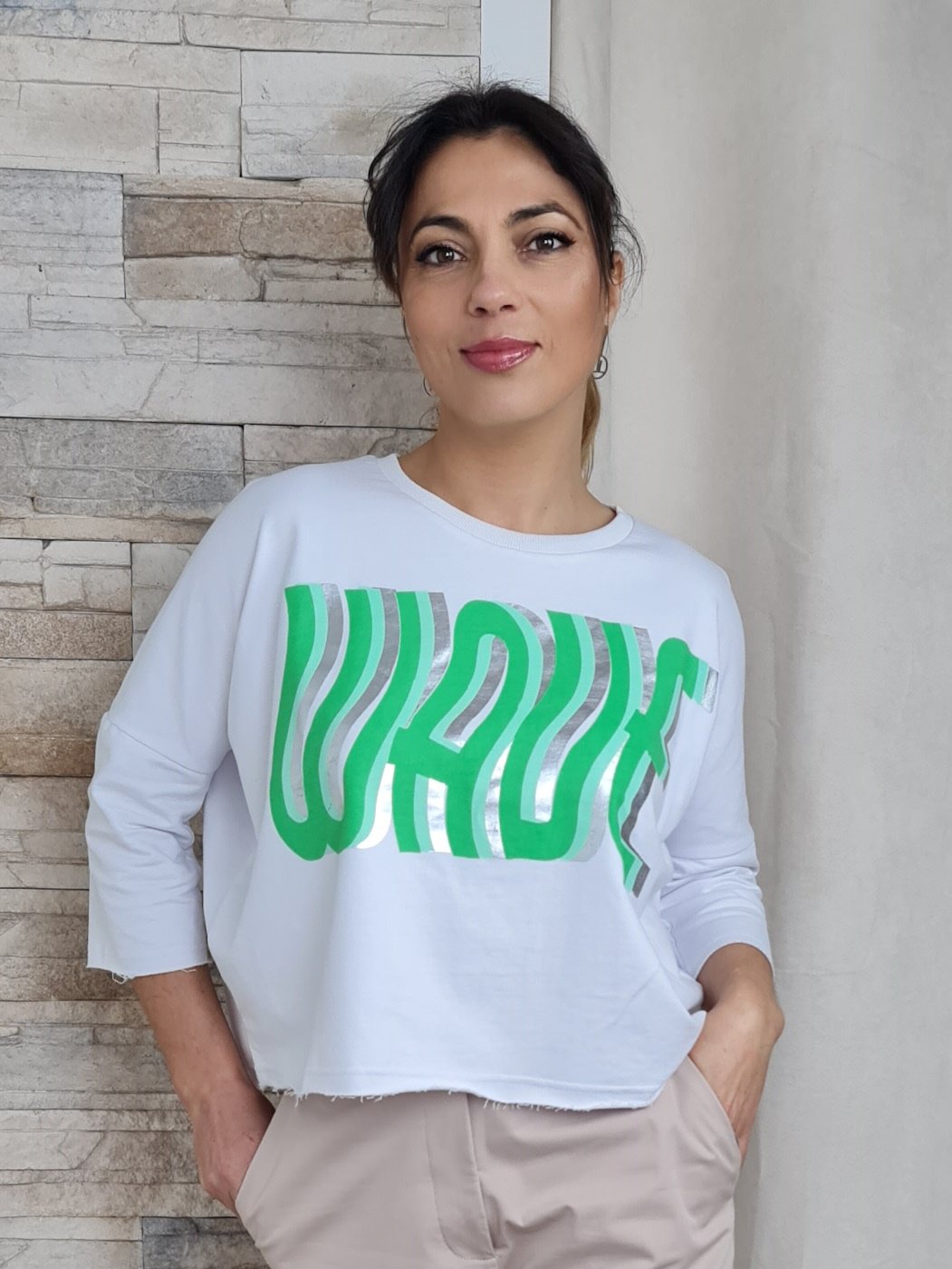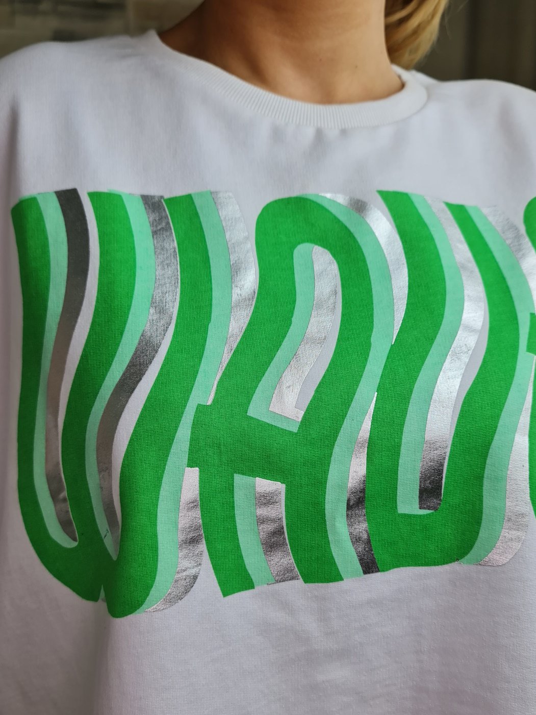 A sweatshirt em destaque na imagem apresenta um design moderno e descontraído, com mangas 3/4 e decote redondo. A cor branca da peça serve de tela para uma estampa com a palavra "WOW" em tons de verde e prateado, criando um efeito visual interessante e original. A barra da sweatshirt possui um acabamento desfiado, adicionando um toque de estilo e personalidade à peça.