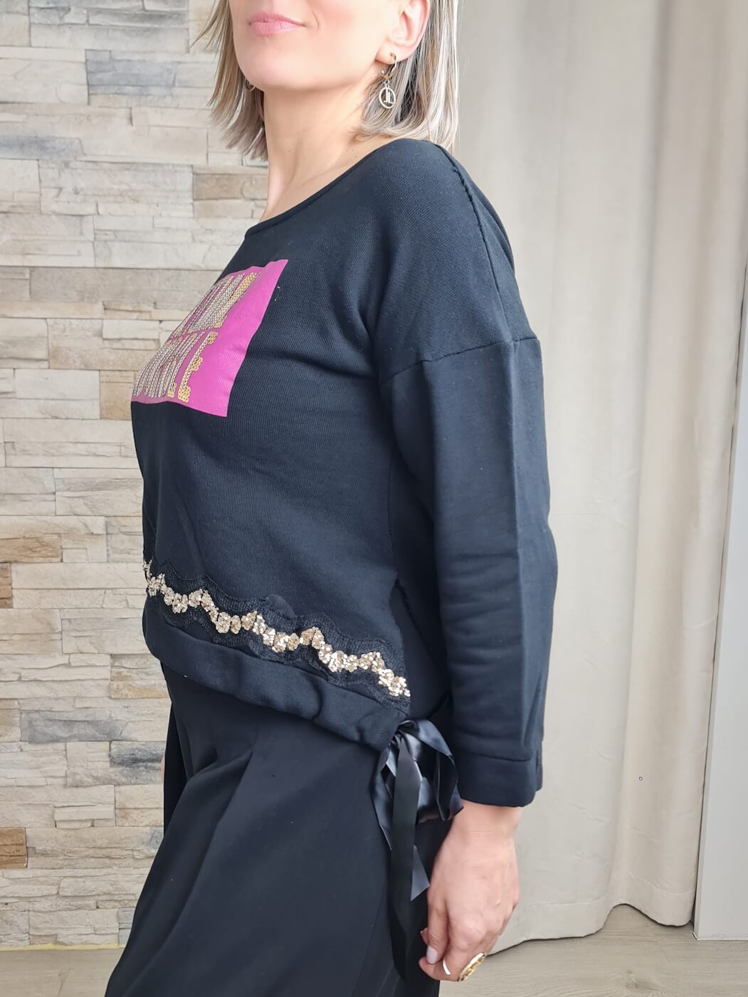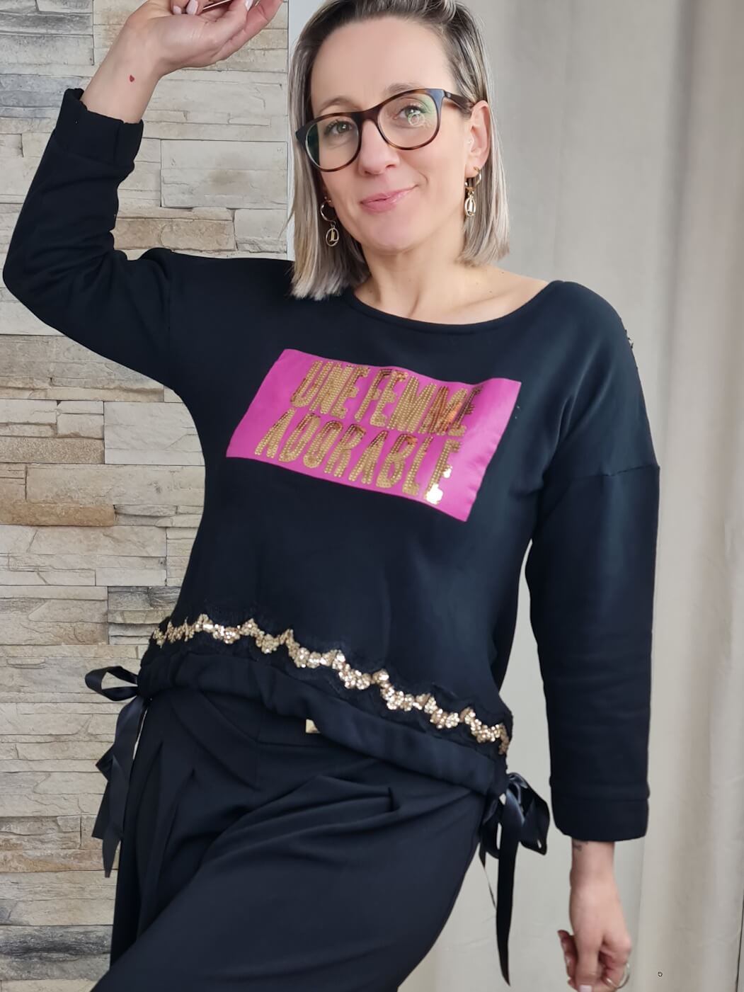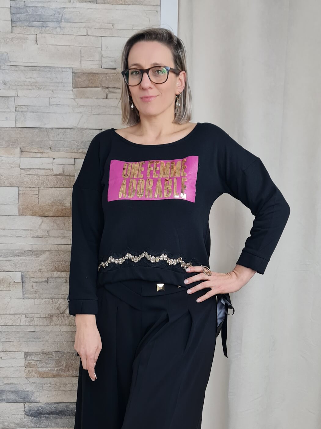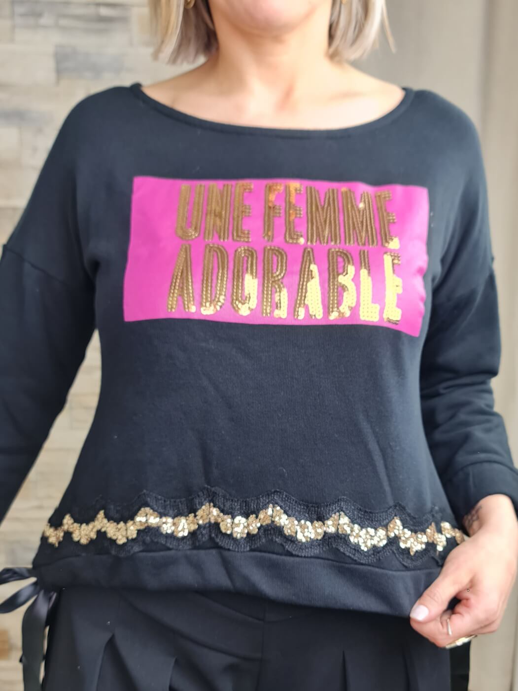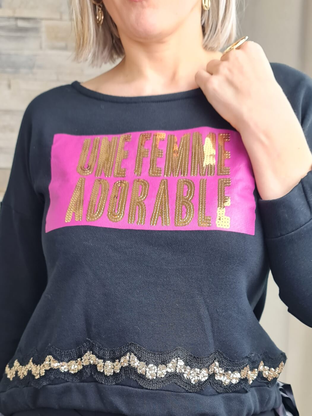 A sweatshirt em destaque na imagem apresenta um design casual e moderno, com mangas compridas e decote redondo. A cor preta da peça contrasta com a estampa retangular em tons de rosa e dourado, que exibe a frase "UNE FEMME ADORABLE". A aplicação de um detalhe rendado na parte inferior da sweatshirt adiciona um toque feminino e delicado ao visual.