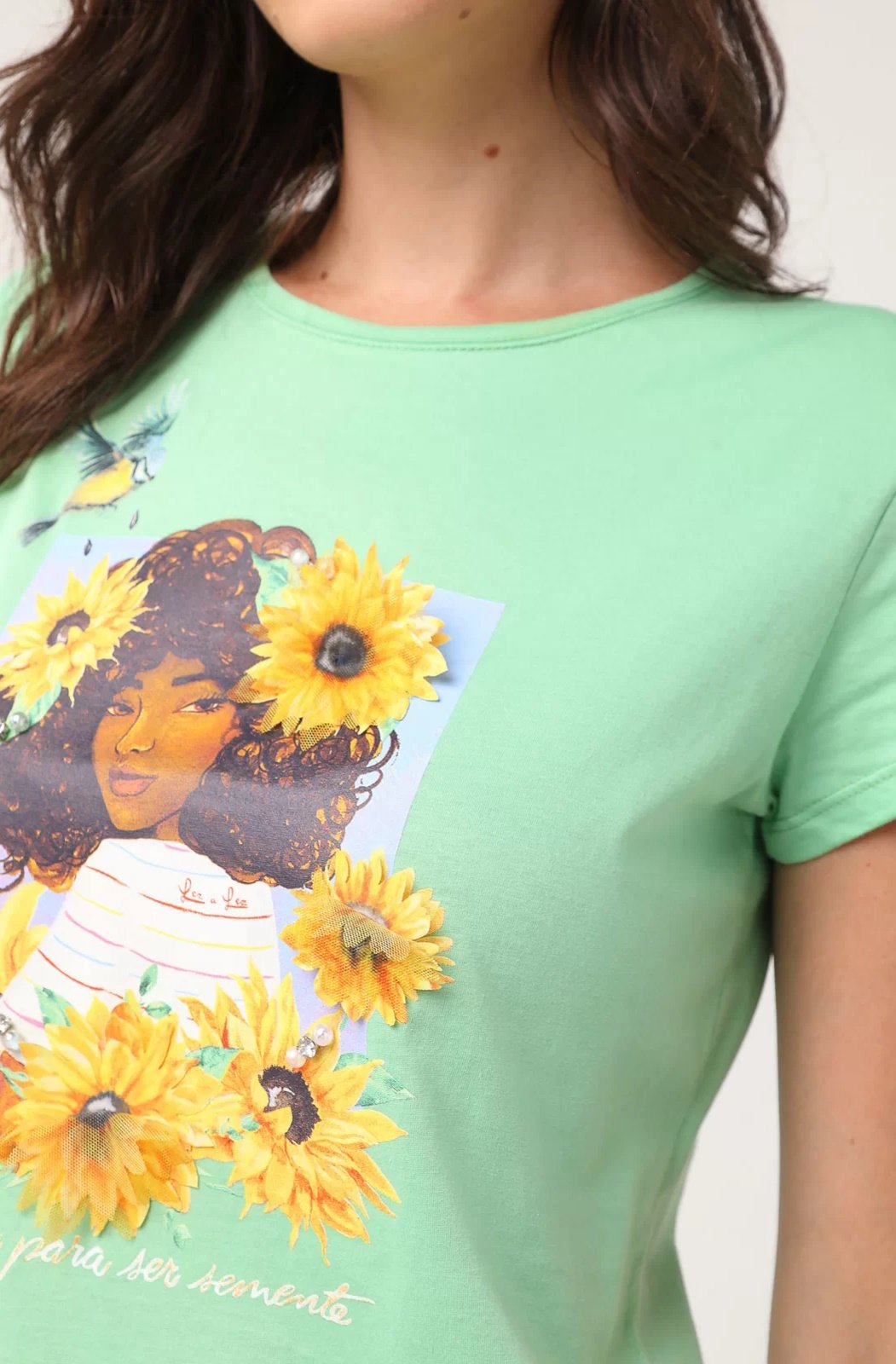 O design é uma celebração da beleza natural. Com um corte clássico e decote redondo, destaca-se pela estampa central de um rosto feminino rodeado por girassóis vibrantes, em tons de amarelo, verde e marrom. A frase "Florescer para ser sempre" inspira crescimento pessoal.