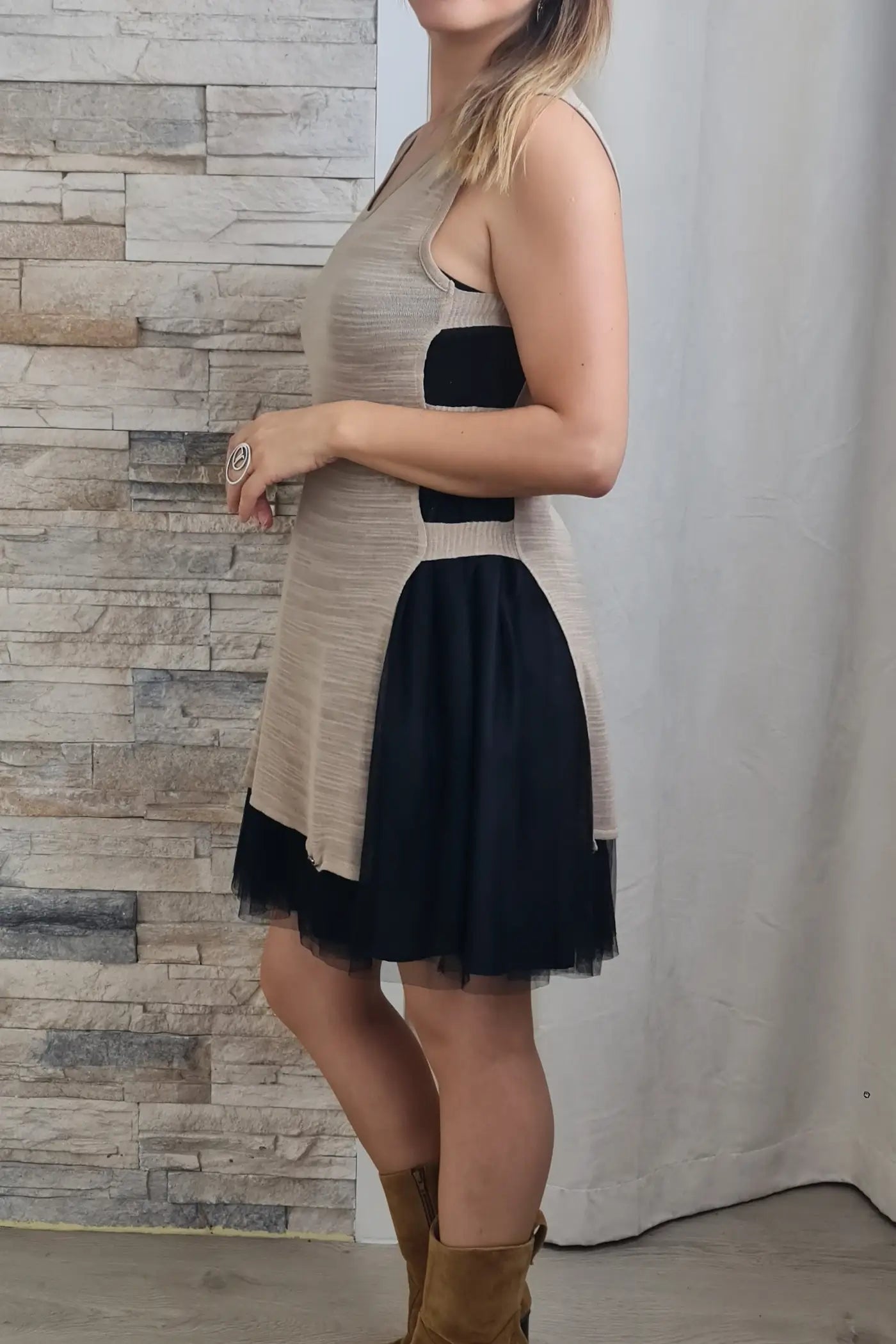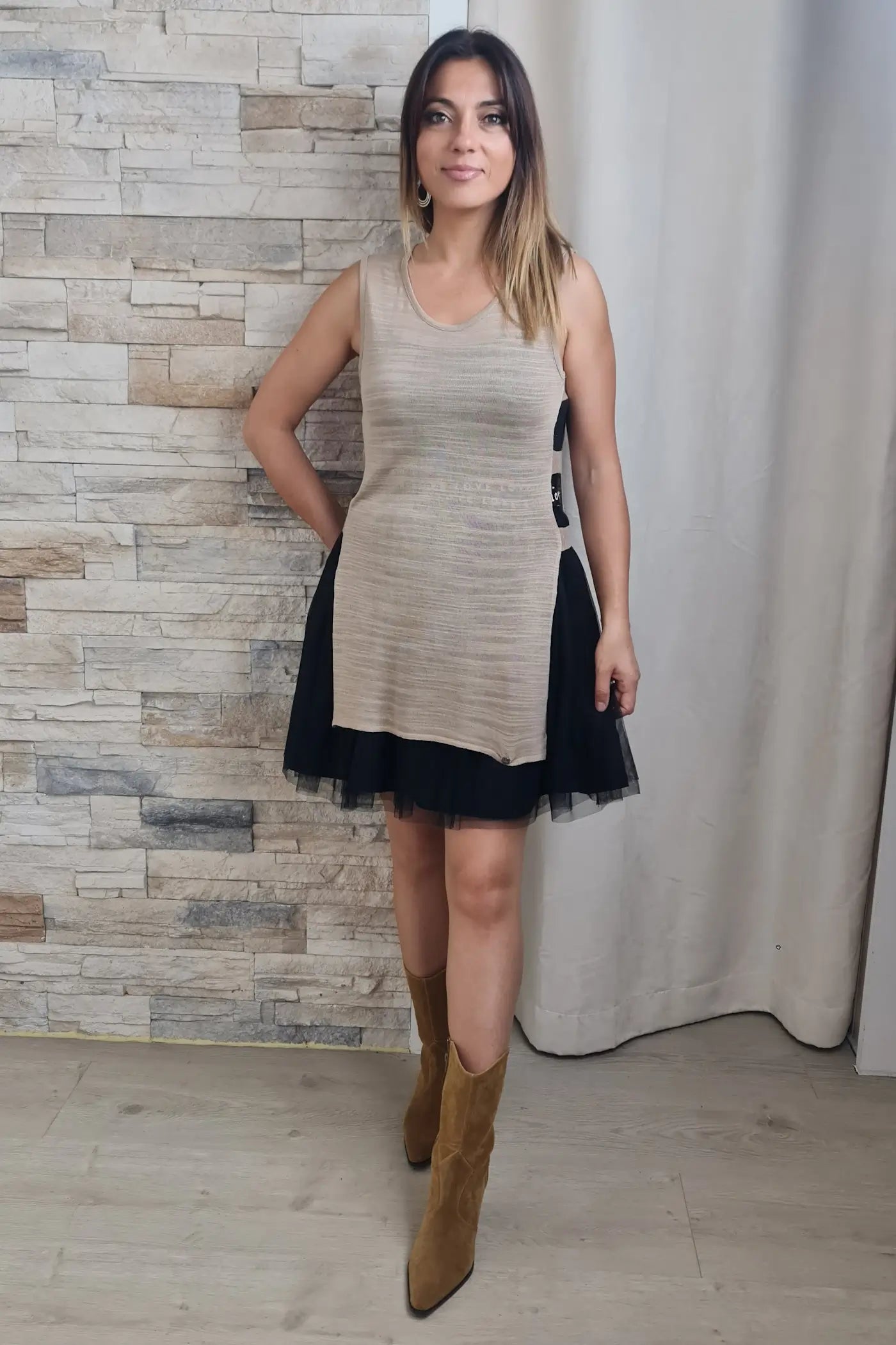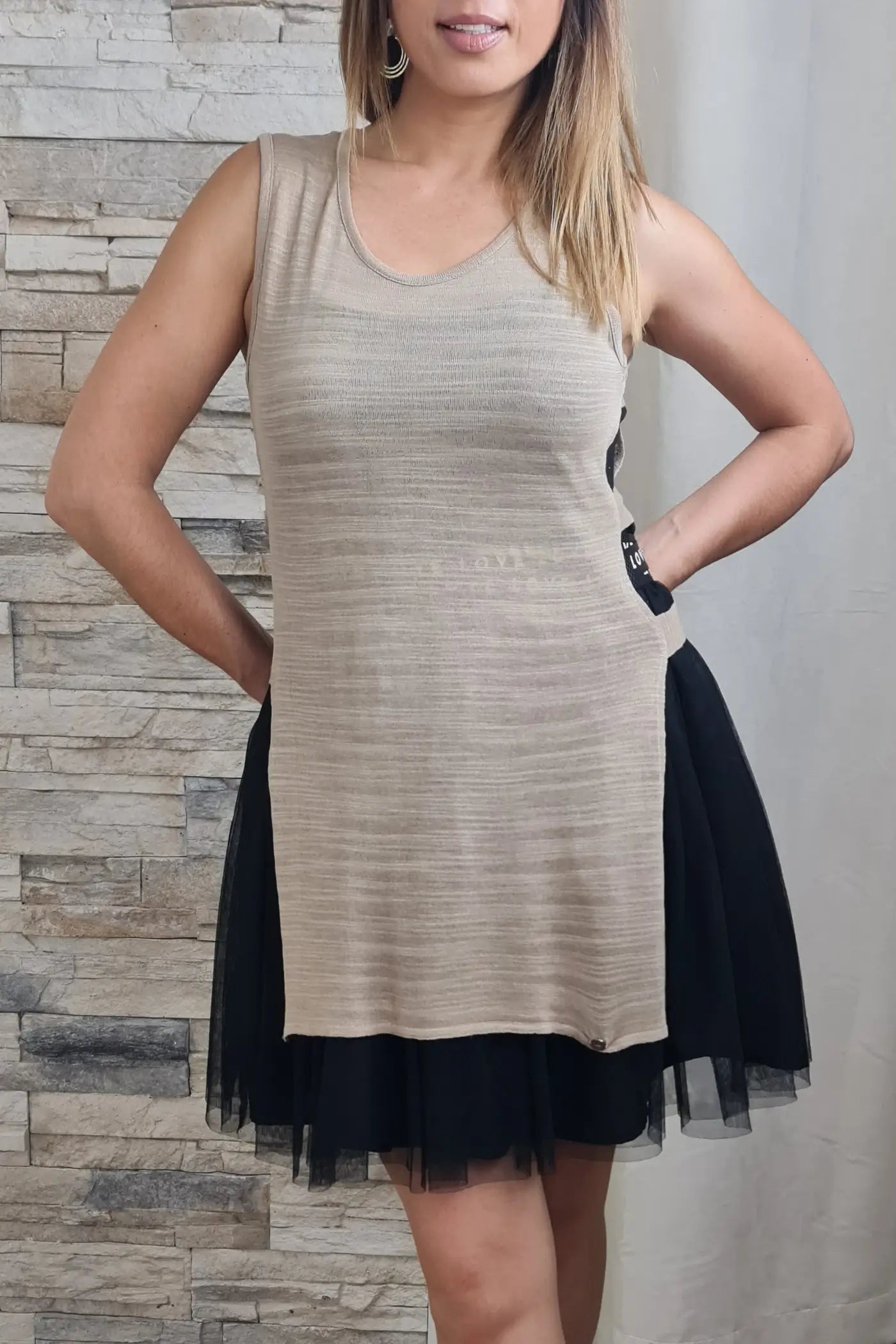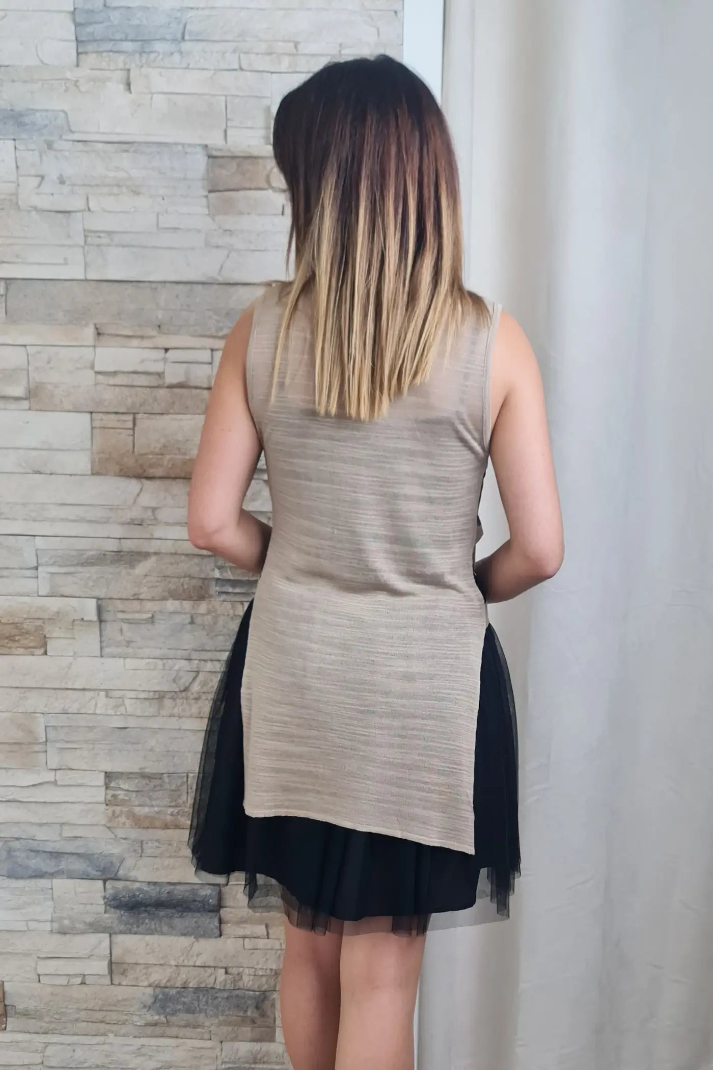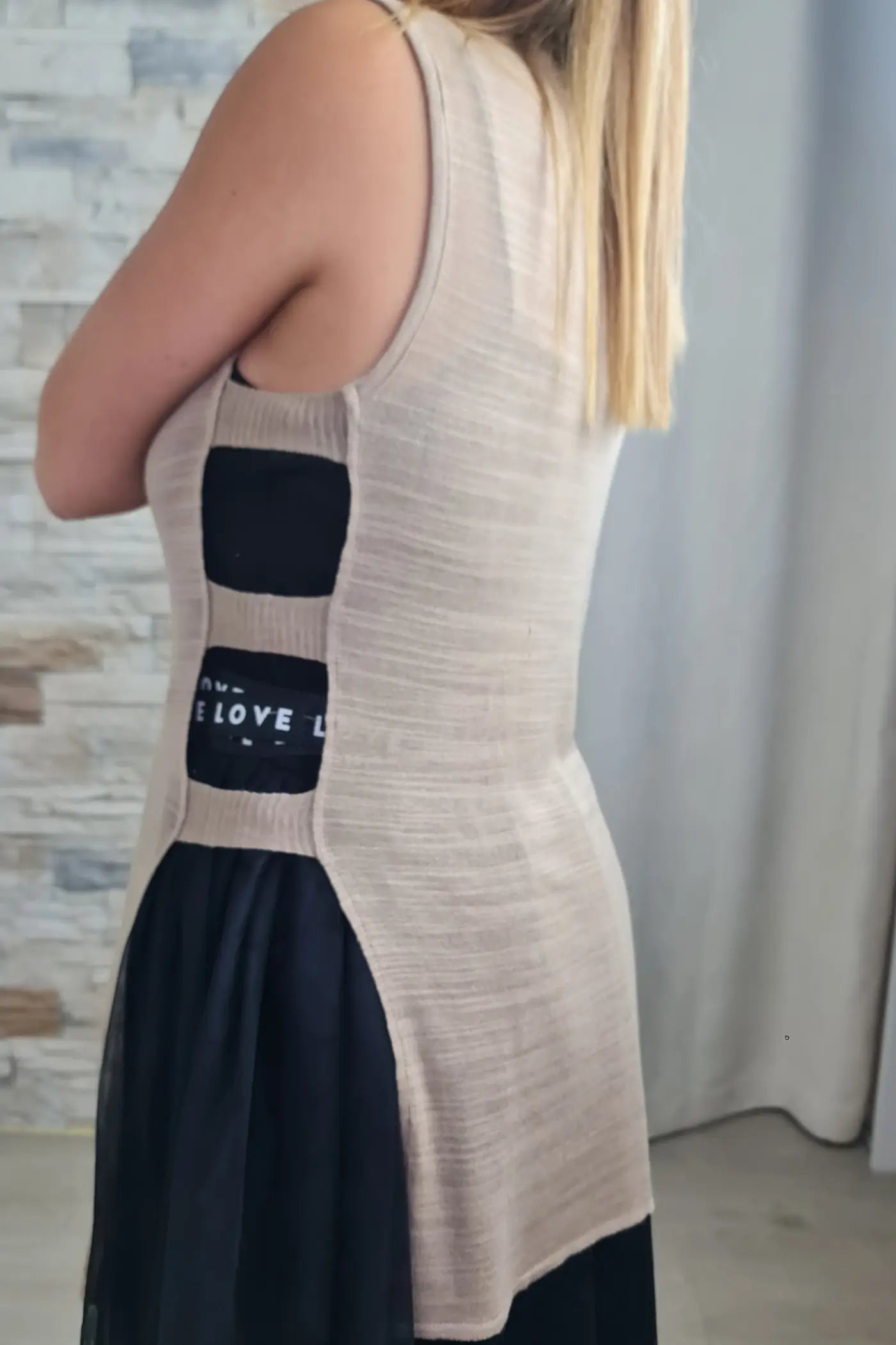Ao vestir o "Confiança Leve", sentirá a suavidade da malha, que se adapta ao seu corpo com uma fluidez natural. A sua cor neutra e elegante permite que se sinta sofisticada e, ao mesmo tempo, ousada. As aberturas laterais não são apenas um detalhe de design: são uma afirmação da sua coragem para mostrar a sua essência, quebrar as regras e expressar a sua individualidade de forma única.